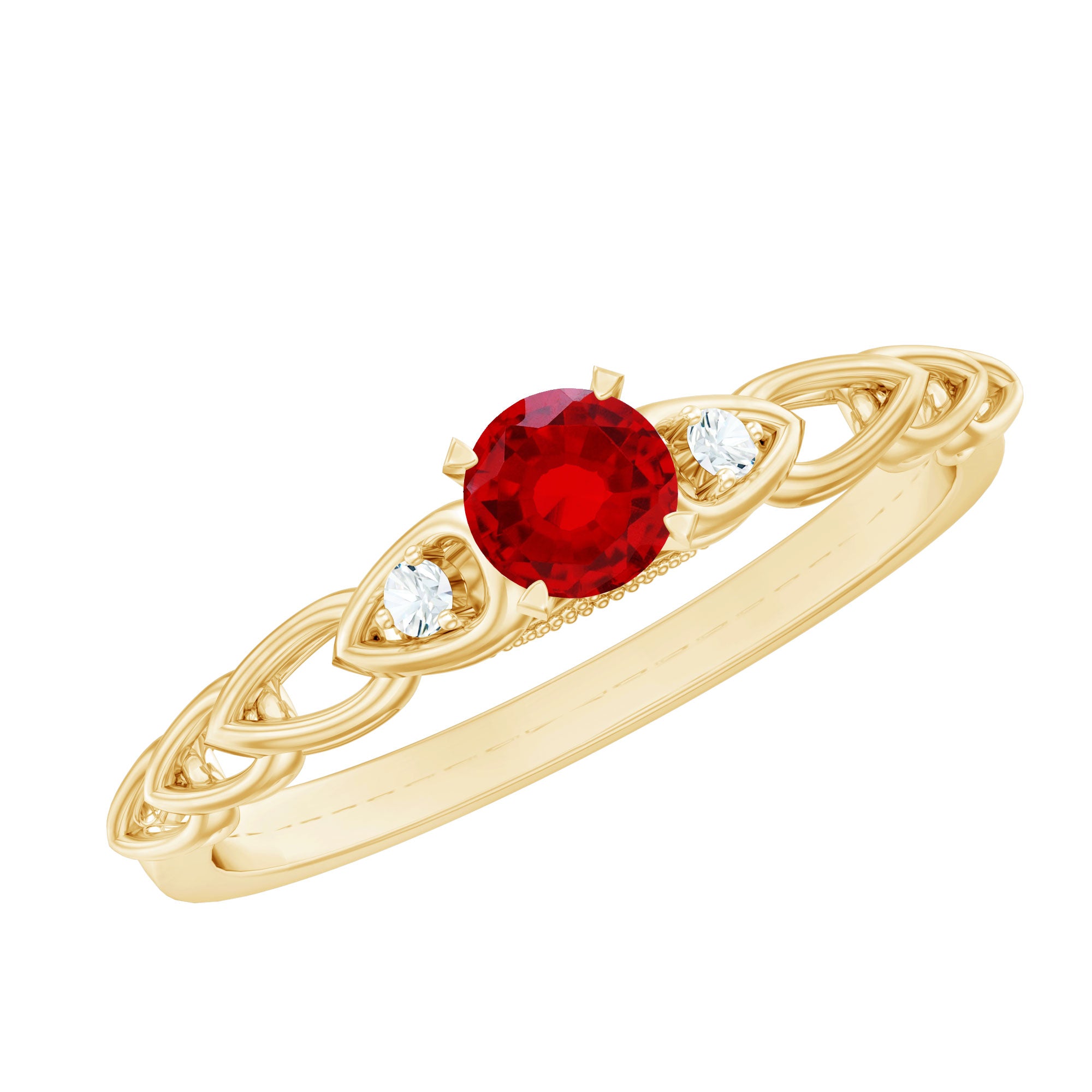 Experience the allure of this Designer Promise Ring embellished with Round Shape Created Ruby gemstone set in Prong Setting with sparkling Diamond gemstones. A unique and meaningful choice, it celebrates your commitment with a touch of sophistication and brilliance.
