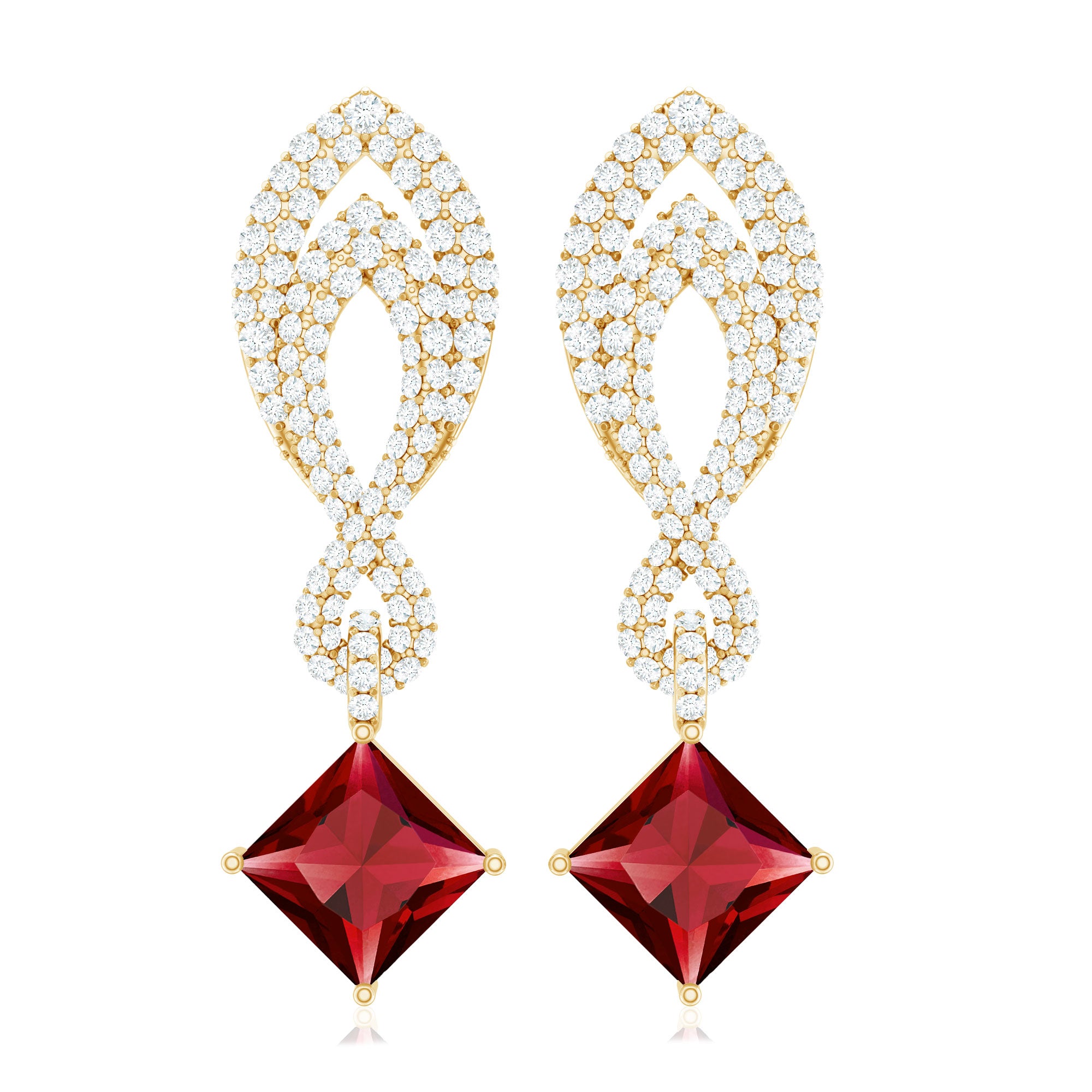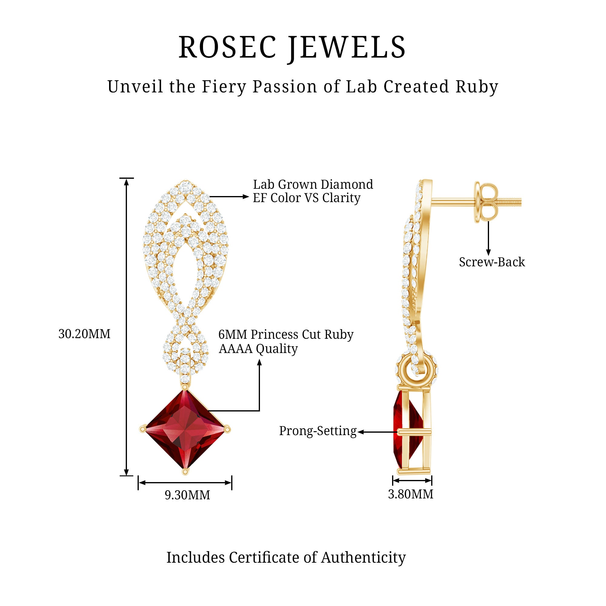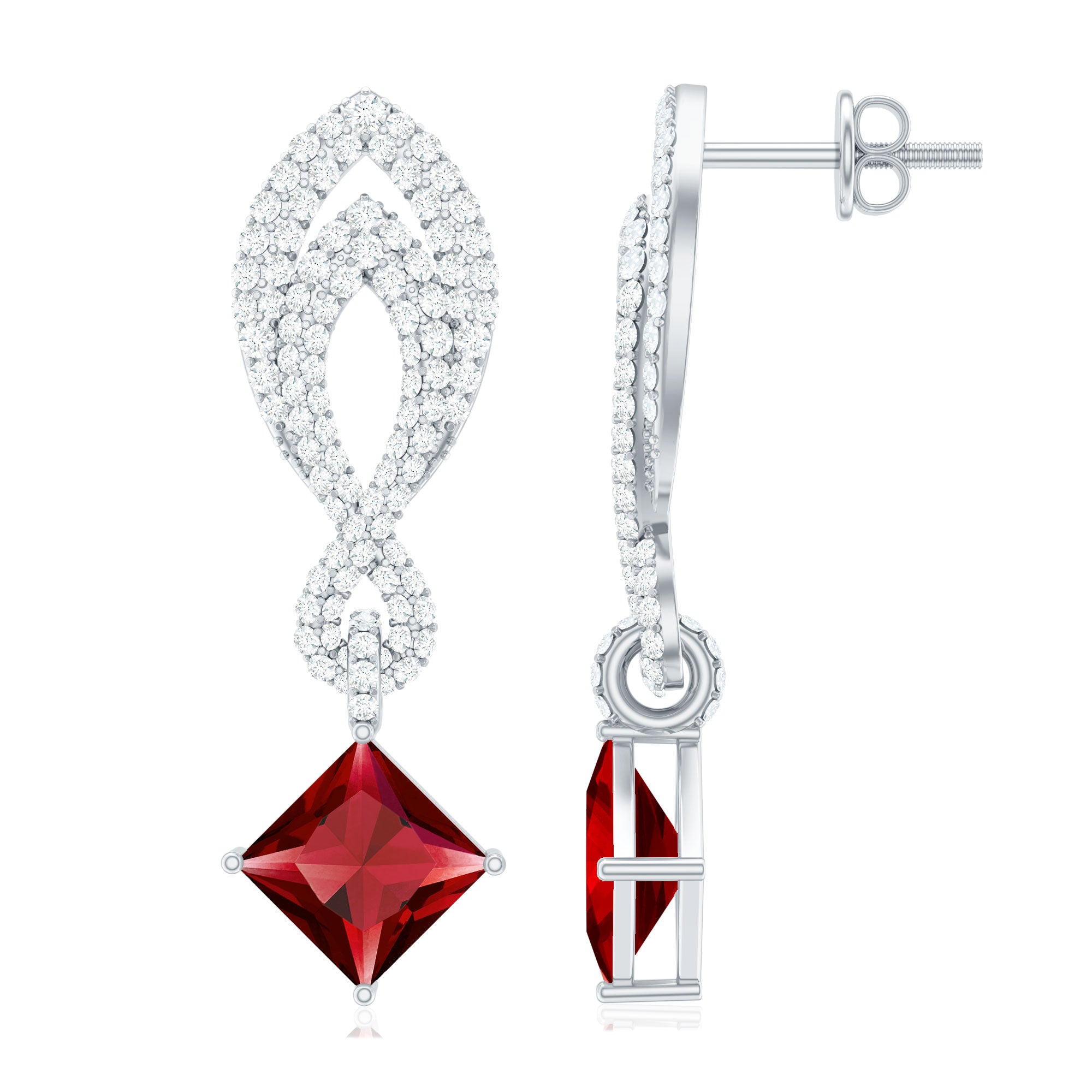 Flutter into elegance with these exquisite Minimal Lab Created Ruby Earrings! Each Earring showcases a captivating 6x6 mm Princess Cut Lab Created Ruby in a delicate Prong Setting, while the top of the ear piece is adorned with a mesmerizing infinity pattern embellished with Round Shape Lab Grown Diamonds, adding a touch of brilliance and sparkle. This classic earrings is adorned with Aaaa Quality Ruby and Ef-Vs Quality Diamond. Dont miss out on the opportunity to own this timeless piece of jewelry. Hurry up and make this holiday season extra special by surprising her with these elegant earrings. Capture the magic and sophistication with these Ruby Diamond Earrings. Order now!