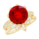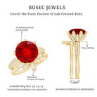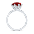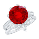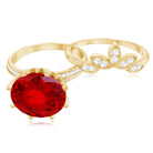 The Lab Ruby perched atop the flower creates a mesmerizing effect on this Engagement and Wedding Ring Set. This beautiful 2 piece Lab Ruby Engagement Ring Set is timeless and striking and is sure to be treasured for years to come. With a perfect vibrancy, the 10 mm Round Shape Lab Ruby at the center of the flower offers a stunning centerpiece. The Round Moissanite sitting on the flower petals and on the shank. To adorn this Ring is the V shaped enhancer having leaf shaped frame studded with Moissanite. This Stacking Ring set can be mixed and matched to create a variety of looks, ensuring that you fall in love with it over and over again. This Lab Ruby Flower Ring Set has the timeless elegance that will never go out of style.