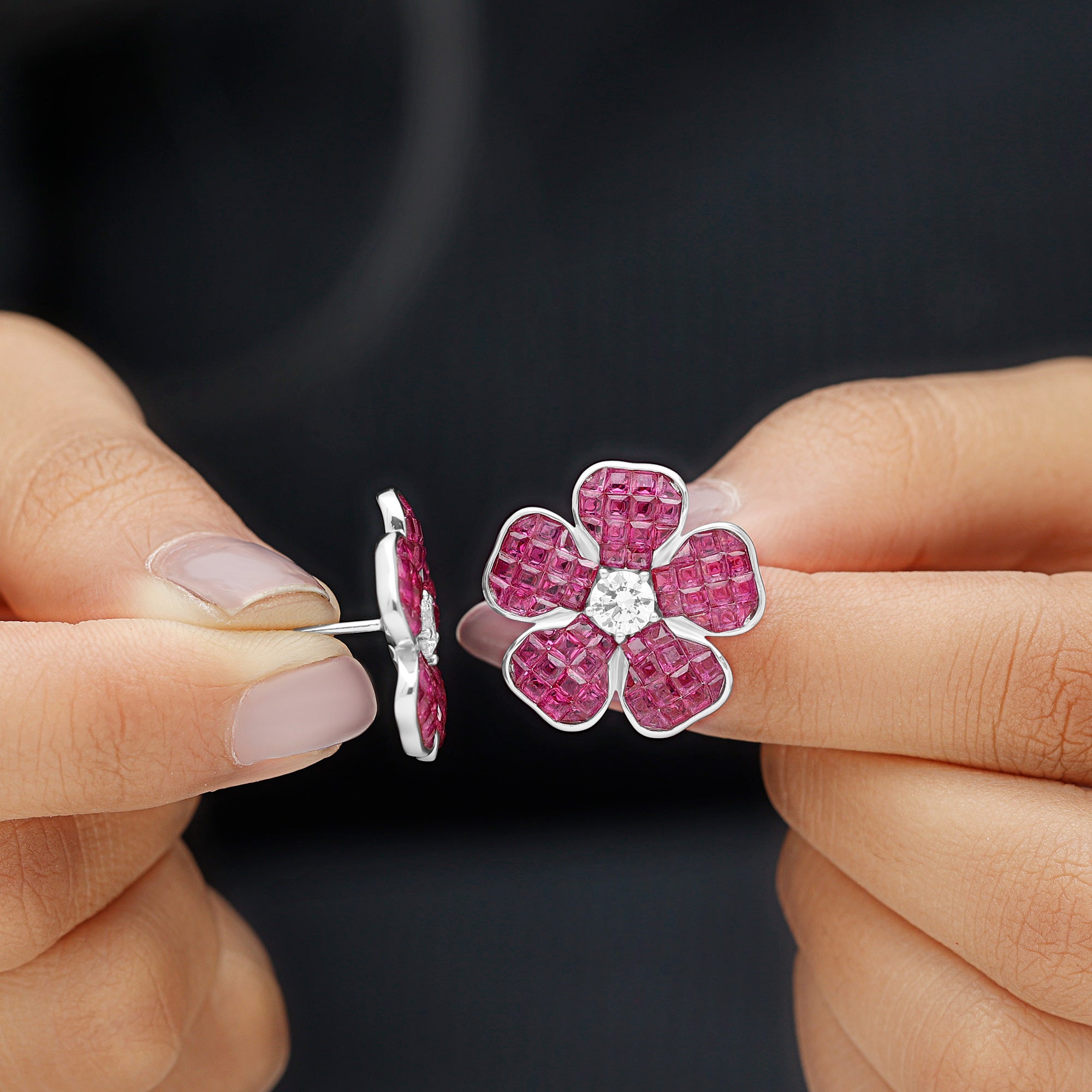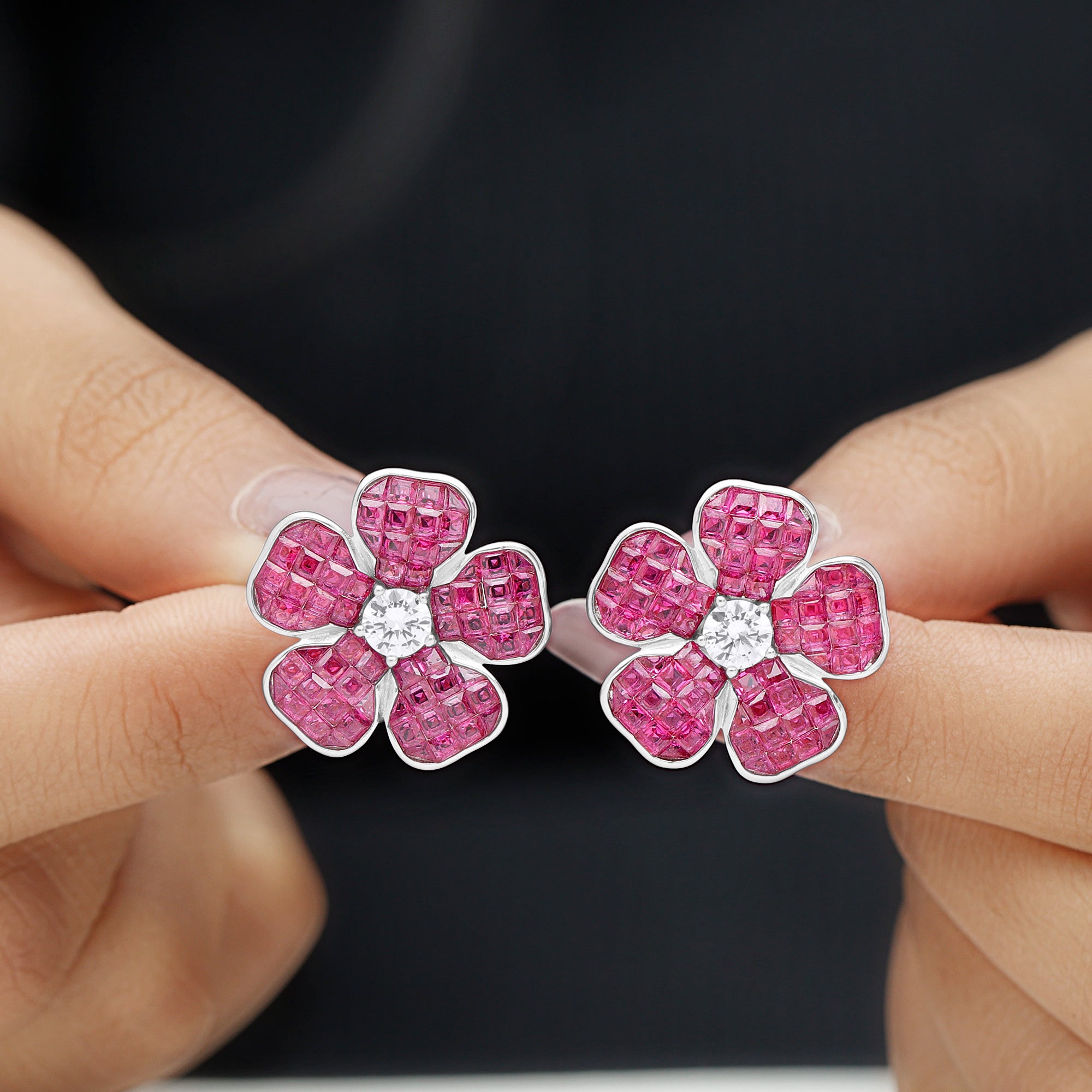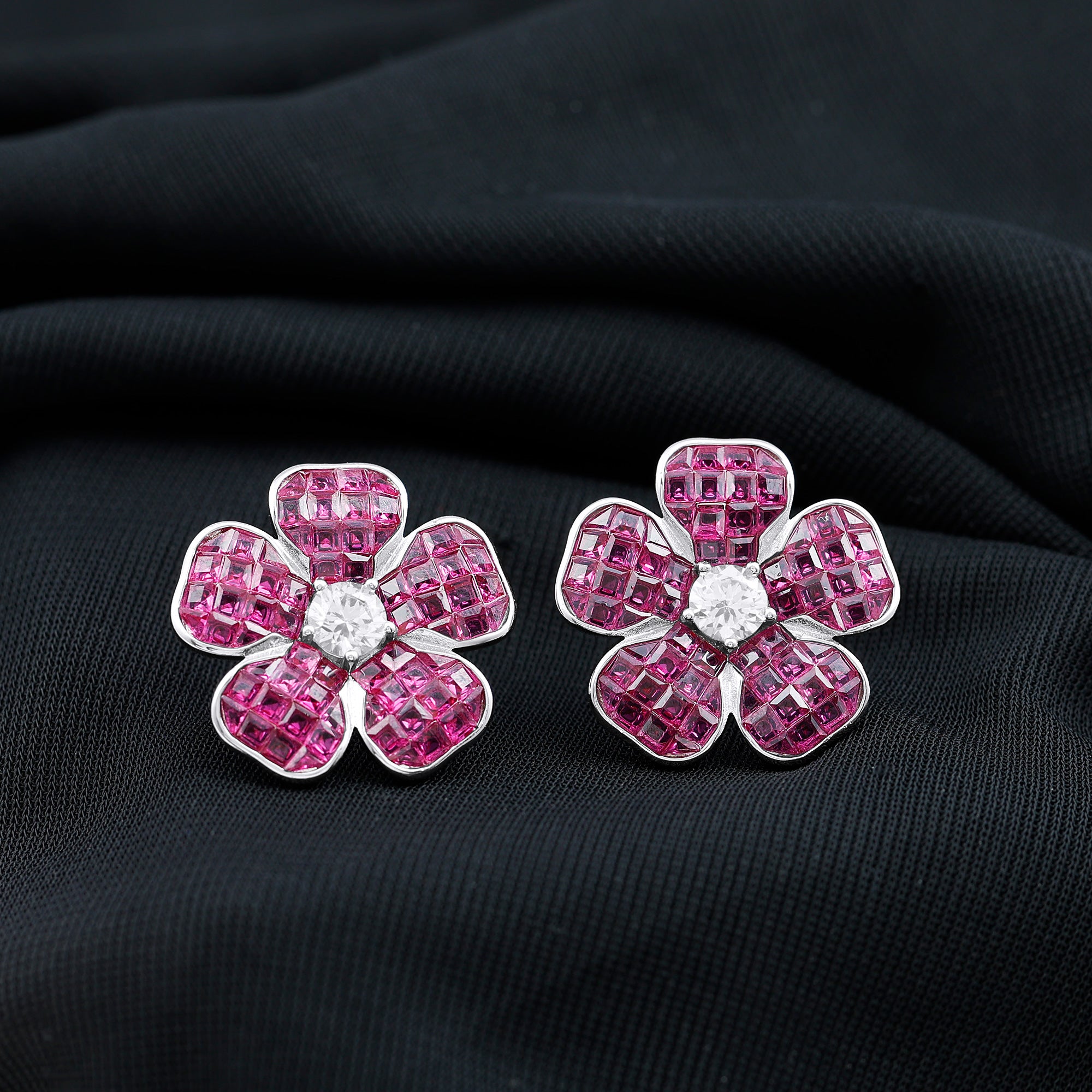 Add a timeless floral touch to your jewelry collection with these stunning Flower Stud Earrings, which boast a brilliant mix of lab-created rubies and sparkling moissanite stones. Drawing inspiration from the natural elegance of blooming flowers, these Lab Grown Ruby Earrings perfectly blend classic femininity with modern craftsmanship. They feature a central round cut Moissanite surrounded by floral petals embellished with princess cut lab-created rubies set in an invisible setting. Expertly handcrafted in 14k white gold plated silver, the Ruby Stud Earrings display intricate detailing and smooth finishes that showcase the artistry behind each piece. These Ruby Flower Earrings are perfect for adorning your cartilage on special occasions. We have secured these Earrings with Screw on Backs for hassle-free wear whenever you choose to sport them. The premium jewelry pouch packaging ensures the Silver Ruby Ear Stud remain safe during shipping and delivery, making them ideal for special moments like Birthdays, Women’s Day, Mother’s Day, Valentine’s Day, Graduation, and Thanksgiving.