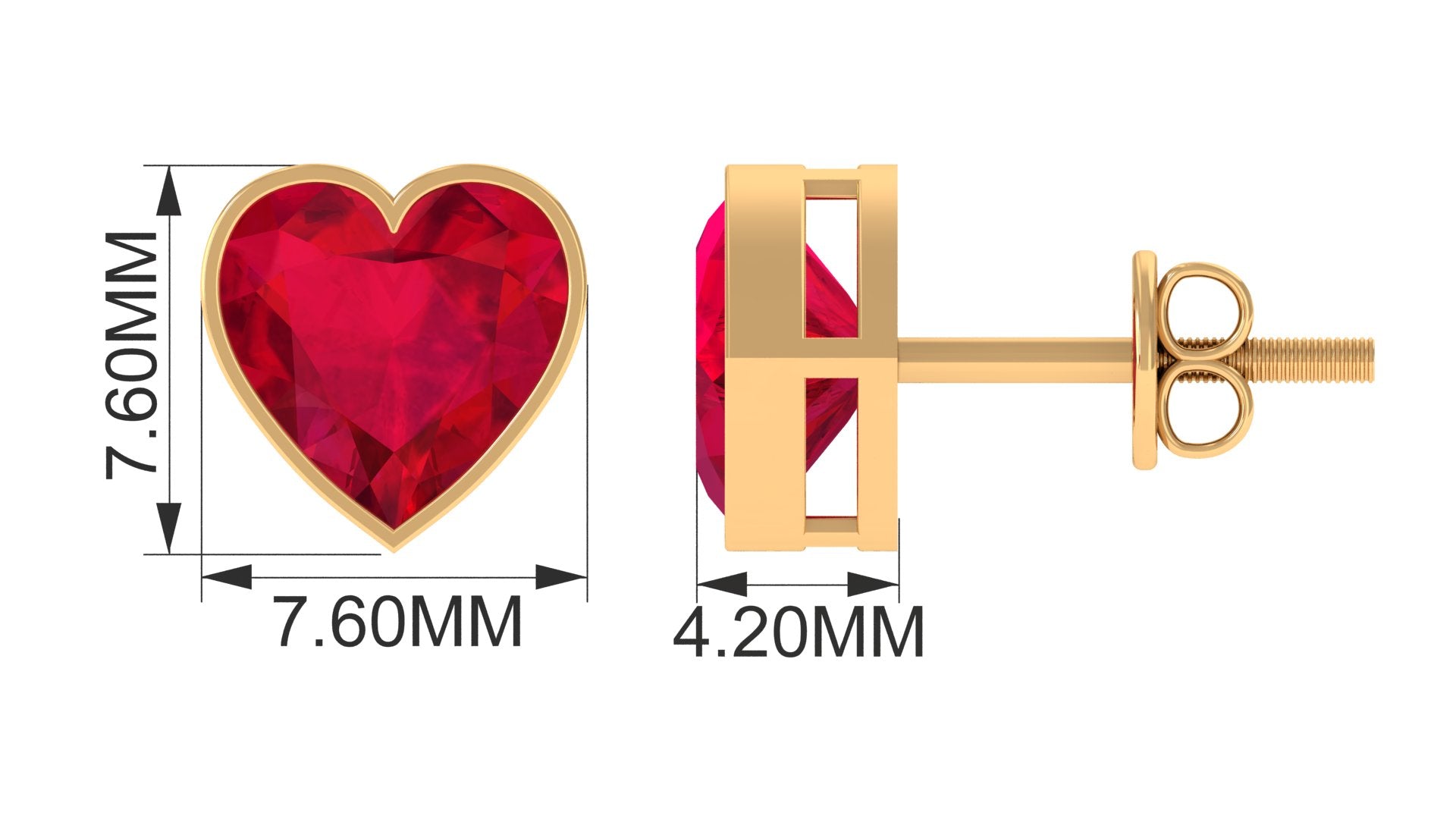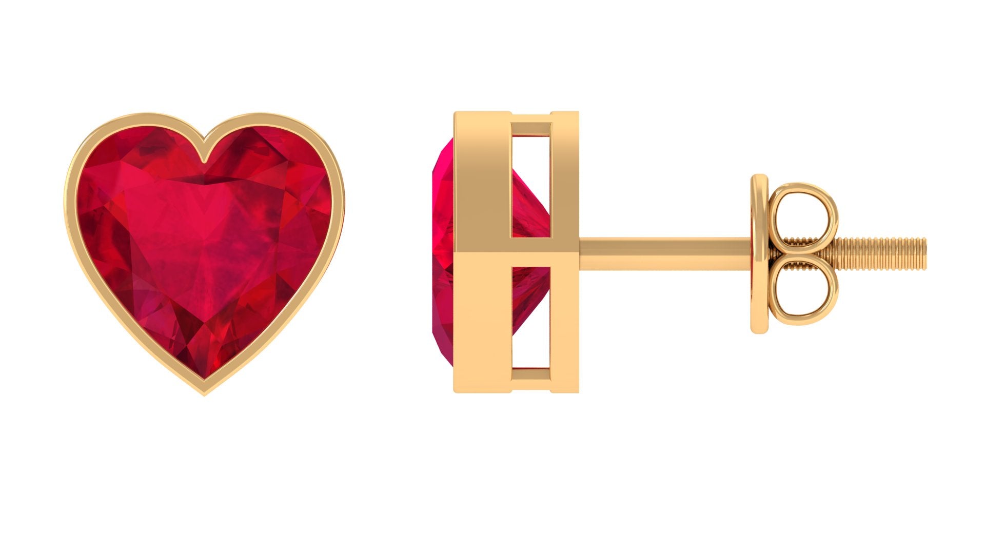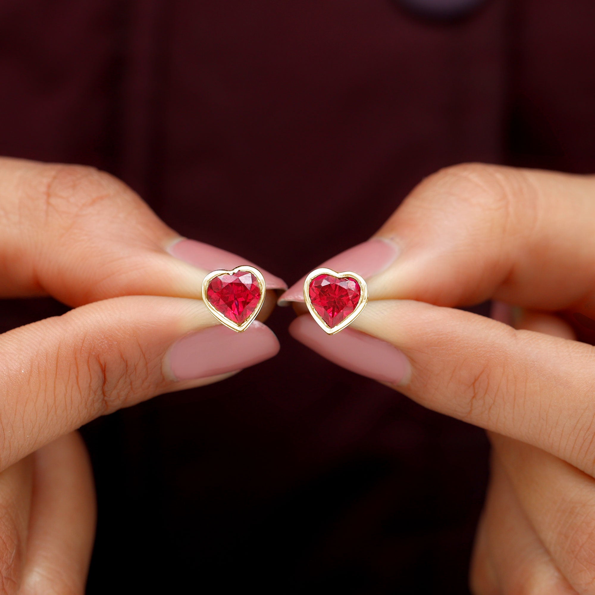 Beautiful and Alluring Lab Created Ruby Stud earrings are adorned with a stunning Solitaire Heart Shape Lab Created Ruby is set in a bezel setting. Add some color to your jewelry collection with this gemstone earring. An ideal accessory for any occasion.