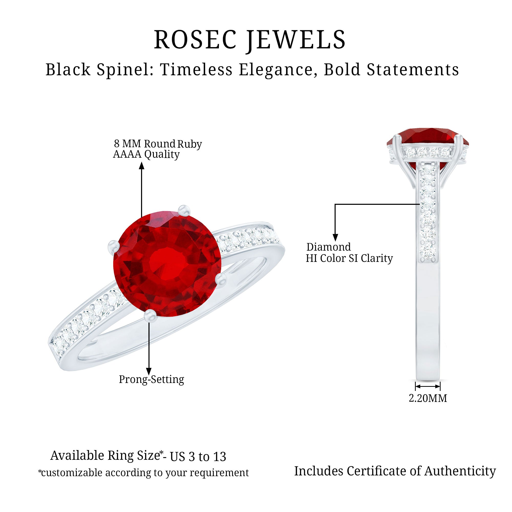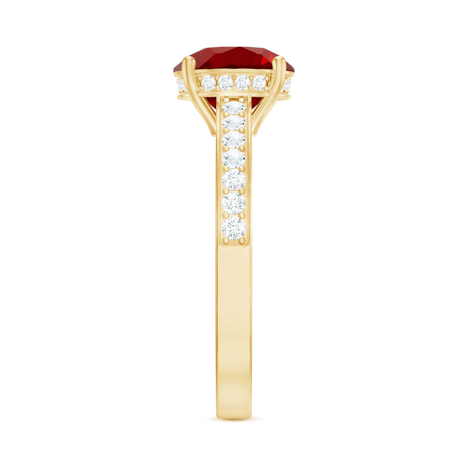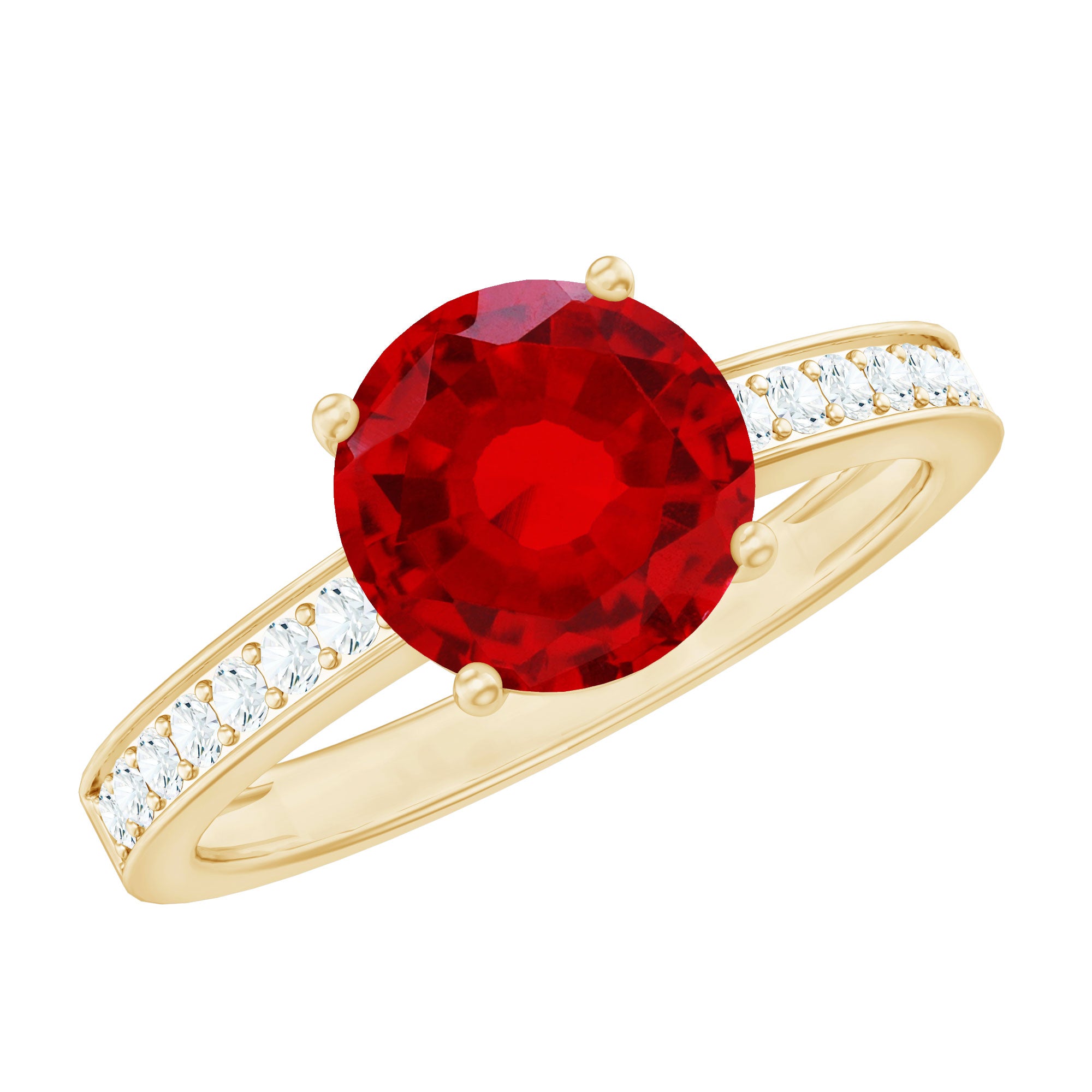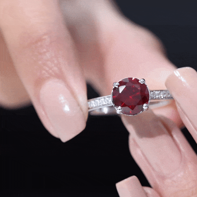 This understated solitaire engagement ring is the perfect addition to any collection. Featuring an 8 MM round-cut Lab-Created Ruby as the central gemstone, accompanied by Diamond side stones elegantly placed along the shank, the design exudes an air of elegance and sophistication.