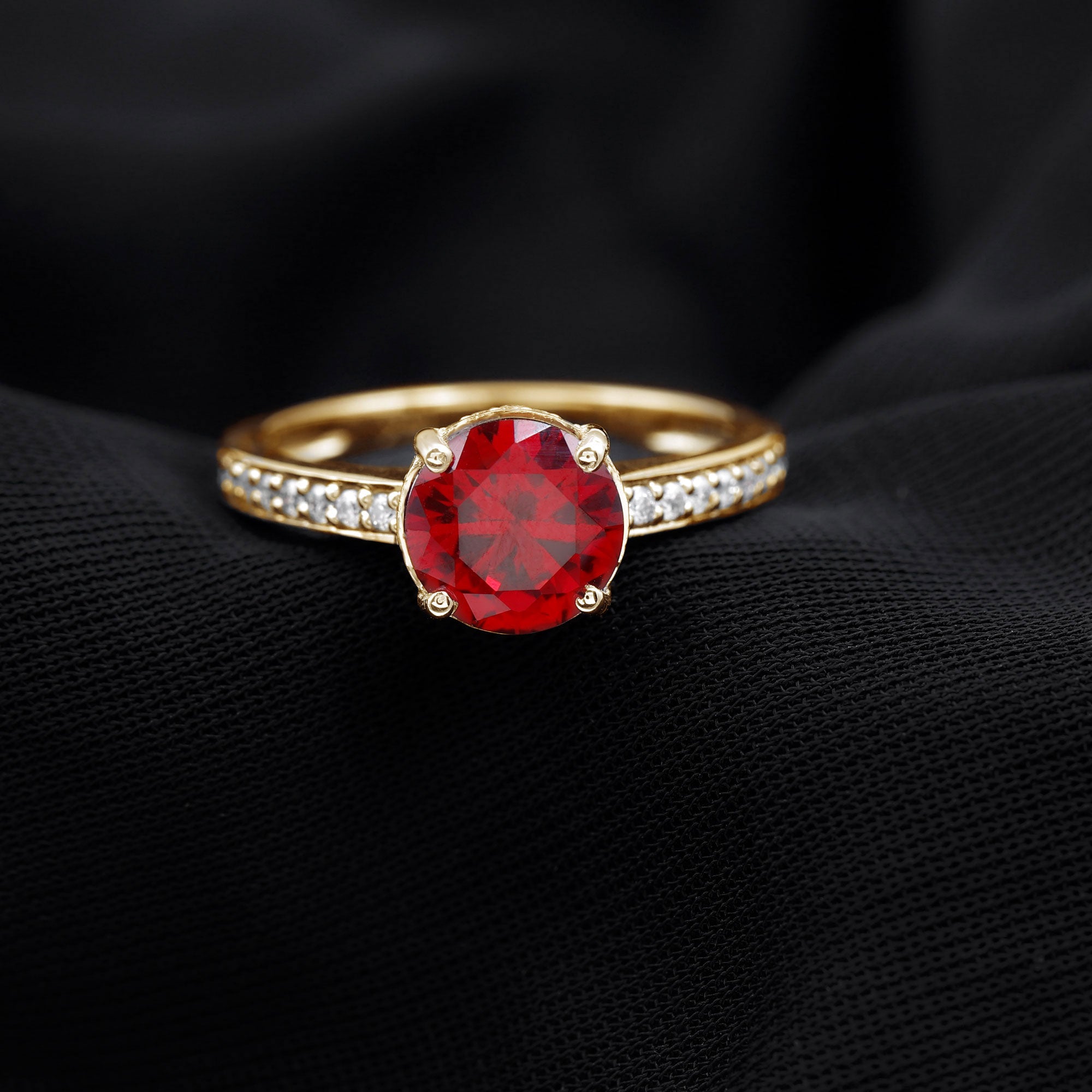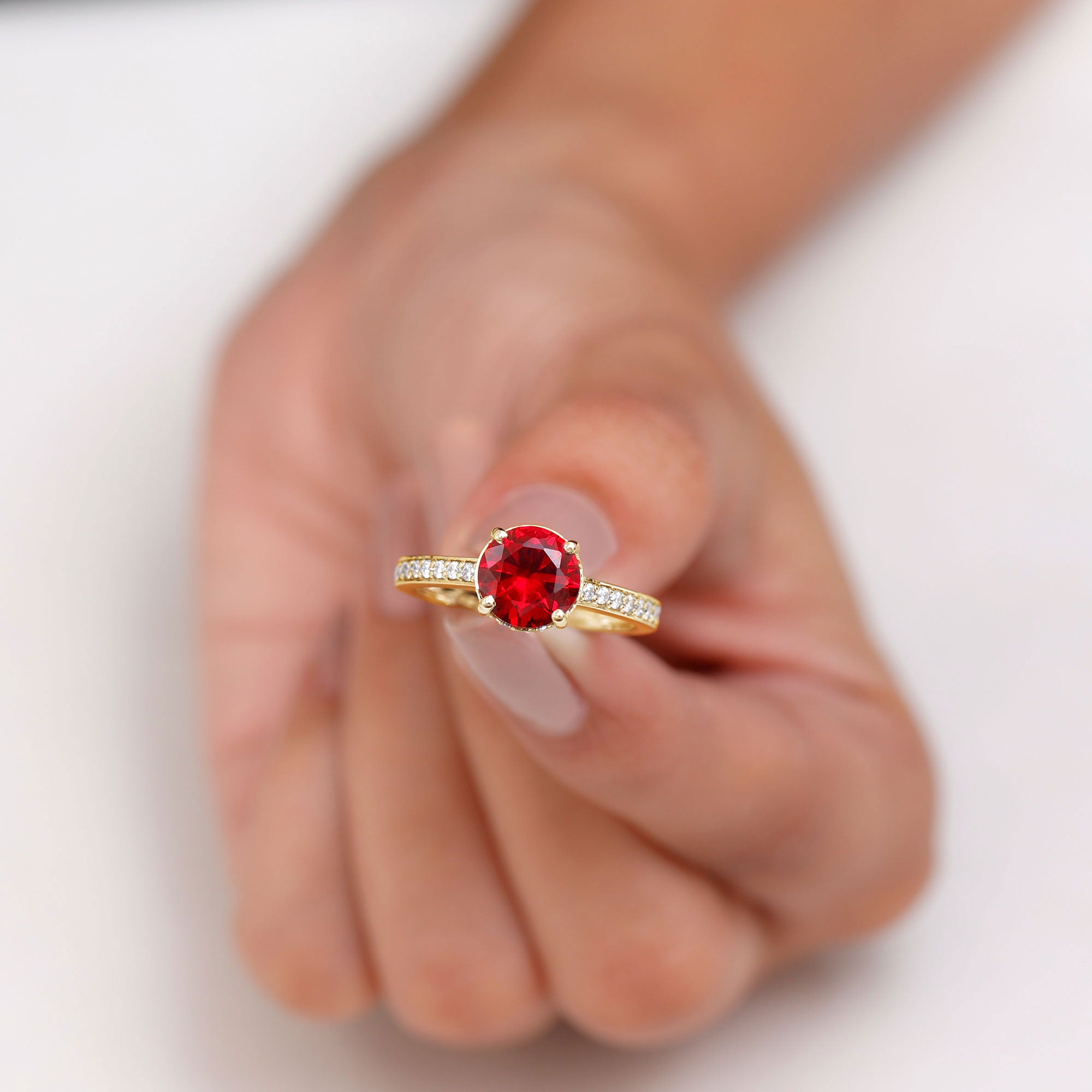 This understated solitaire engagement ring is the perfect addition to any collection. Featuring an 8 MM round-cut Lab-Created Ruby as the central gemstone, accompanied by Diamond side stones elegantly placed along the shank, the design exudes an air of elegance and sophistication.
