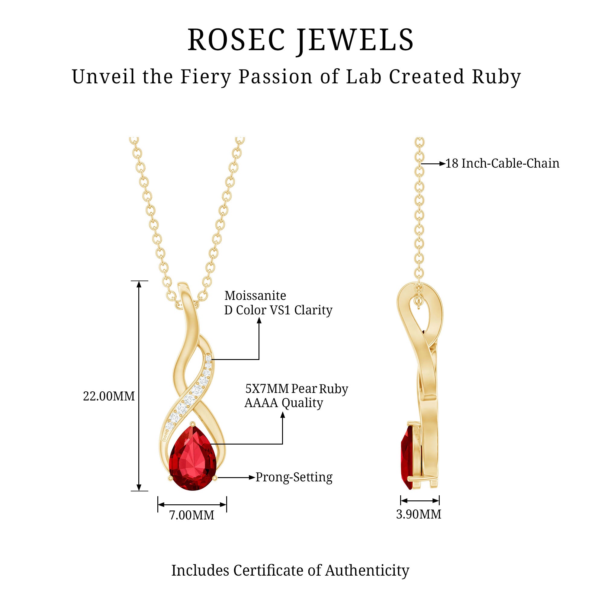 Show your loved one how deep and never-ending your love is with this elegant Infinity Pendant Necklace, designed to blend meaning, beauty, and romance in one stunning piece. At the bottom of the infinity symbol rests a radiant 5X7 MM pear cut lab created ruby, held securely in prong setting. Along the curve of the infinity sign, sparkling D-VS1 quality round cut moissanites add brilliant shine, creating a graceful contrast with the ruby’s glow. Crafted from high-quality metal, the Ruby Teardrop Necklace offers durability and a finish that will stay beautiful for years. Suspended from a smooth cable chain, this AAAA quality Ruby Infinity Necklace sits comfortably around the neck, making it easy to wear on both casual days and romantic evenings. Its design brings a gentle sparkle and a touch of sophistication to any outfit. Ideal for anniversaries, Valentine’s Day, or expressing your everlasting affection, this Ruby and Moissanite Pendant carries a message of eternal love and unbreakable connection.