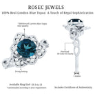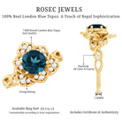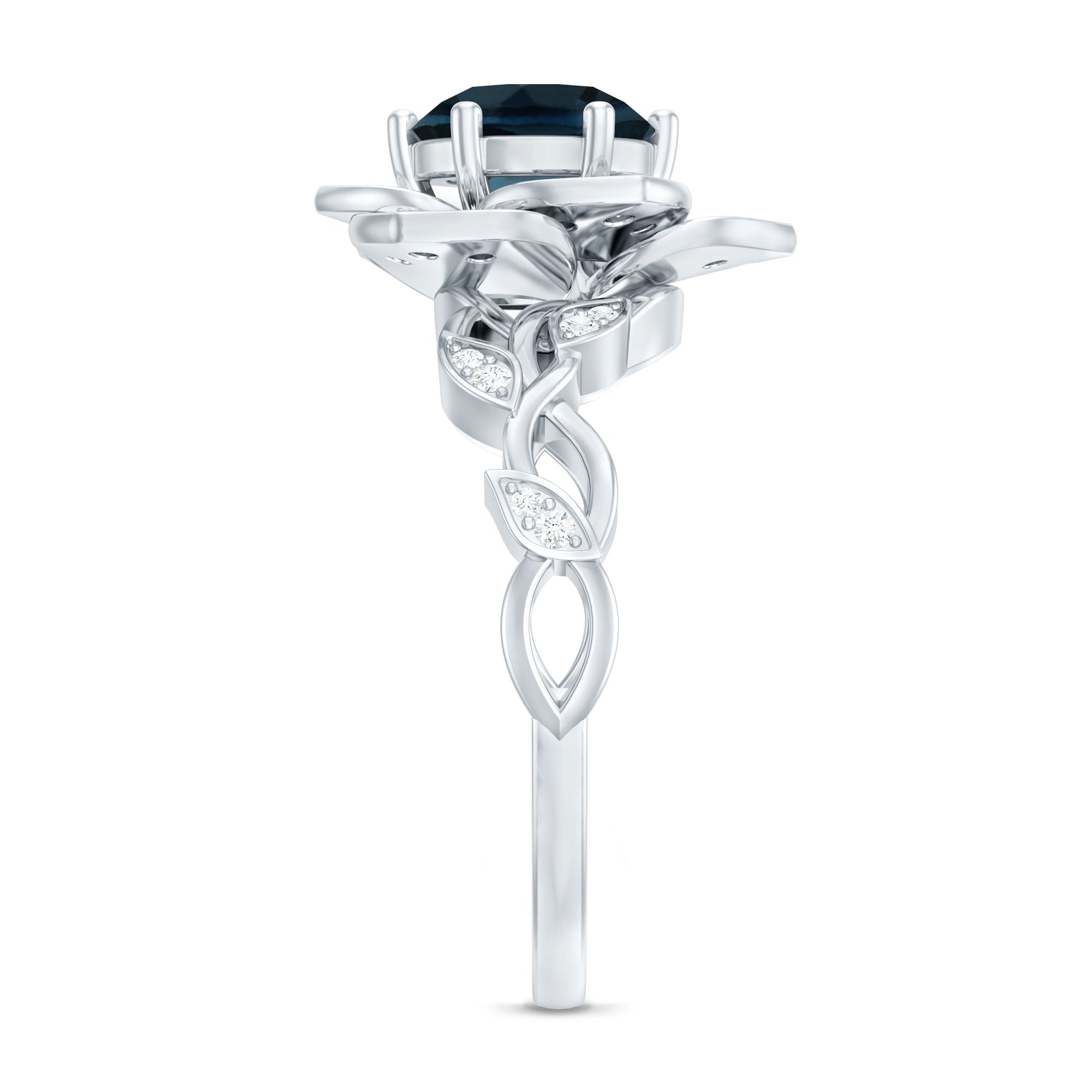 Turn heads at your next cocktail party with this eye-catching Flower Statement Ring, made to shine with bold style and feminine charm. Right at the center, it features a 7 MM round shaped London Blue Topaz that glows with deep blue tones, giving off an elegant vibe that is hard to miss. Surrounding the topaz are sparkling diamonds, set over delicate metal leaves that bring a romantic or floral inspired touch. The band continues the nature inspired theme with tiny leaf like details, each set with small diamonds that catch the light just right, like little drops of sparkle. This London Blue Topaz and Diamond Engagement Ring is not just beautiful, it is a full-on style statement. Whether you are dressing up for a special night out or adding some glam to your everyday look, this Blue Topaz Flower Ring brings a mix of elegance and fun to any outfit. The floral shape adds a touch of whimsy, while the blue topaz keeps things bold and classy. Perfect for women who love jewelry that feels unique and artistic, this Topaz Cocktail Ring is a conversation starter. Packed in a pretty jewelry box and available in multiple sizes, it also makes a thoughtful gift for birthdays, anniversaries, or just because. Add this floral beauty to your collection and let your hands do the talking.
