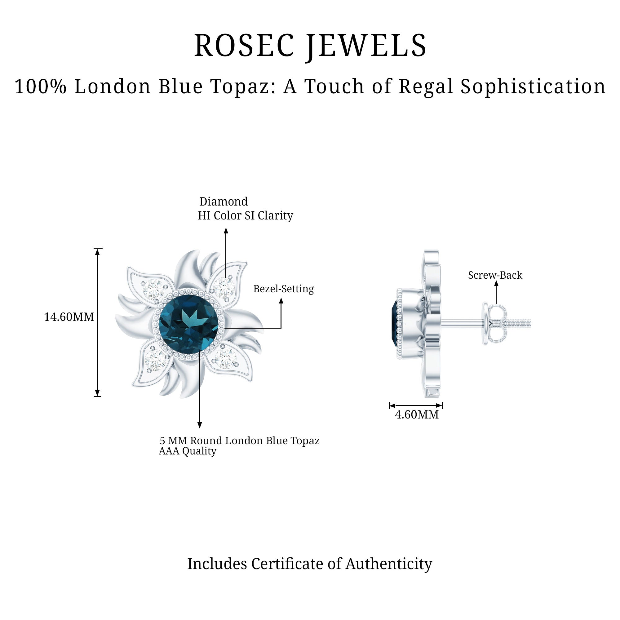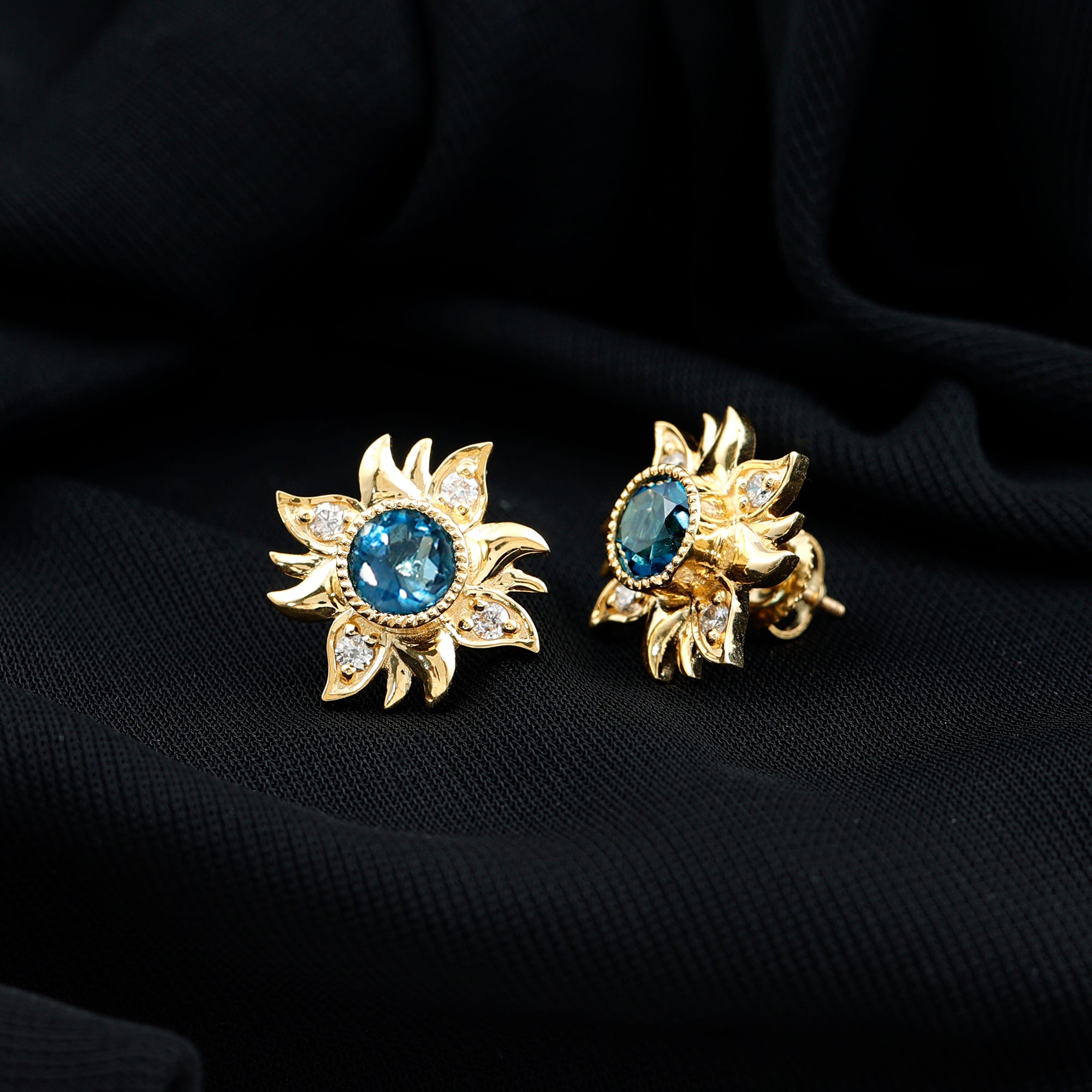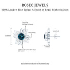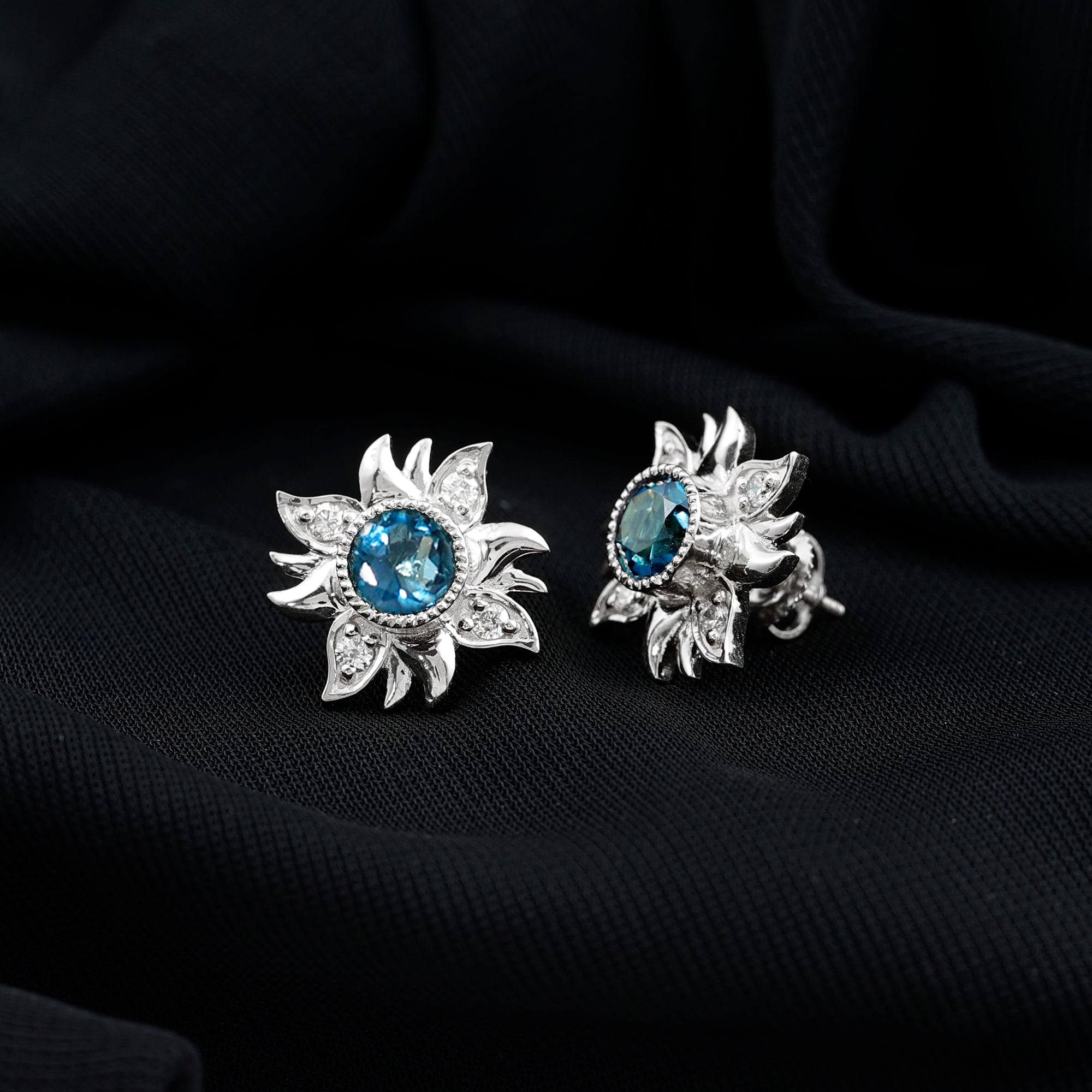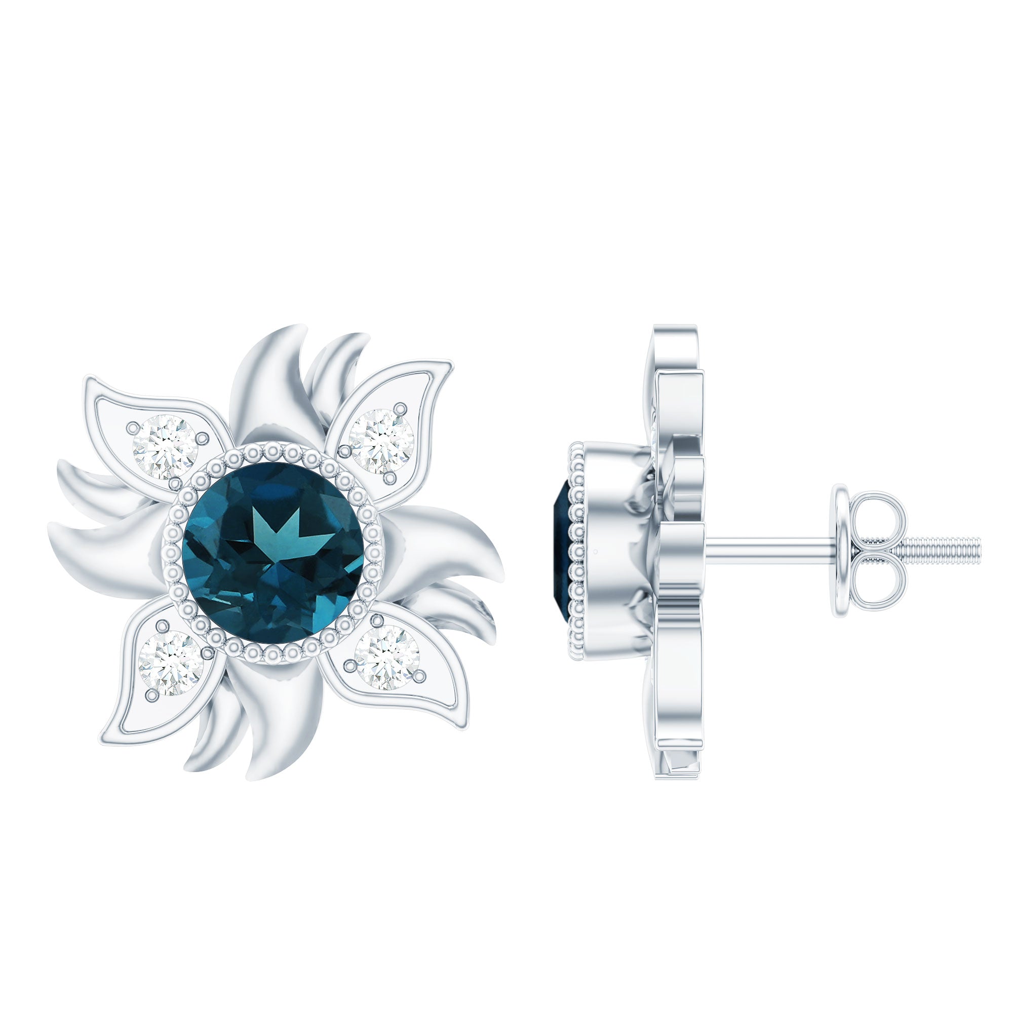 Graceful and glamorous these beautiful London Blue Topaz Earrings will let you fall in love with it over and over again. Adorned with 6 MM Round Shape London Blue Topaz on the pair in Bezel Setting. The glistening and sparkling Diamond on the petals, some left with metal gives the perfect intersection of floral and flair. Leave a lasting impression with these stunning Floral Stud Earrings that flutters upon the ears making them a perfect elegant style with a touch of whimsy. Bright and beautiful, these Blue Topaz Studs are sure to add stunning sparkle to your outfits too. These feminine Flower Studs give a hint of sparkle to your collection, also making a lovely present for December birthdays, anniversaries, weddings or while commemorating any occasion.