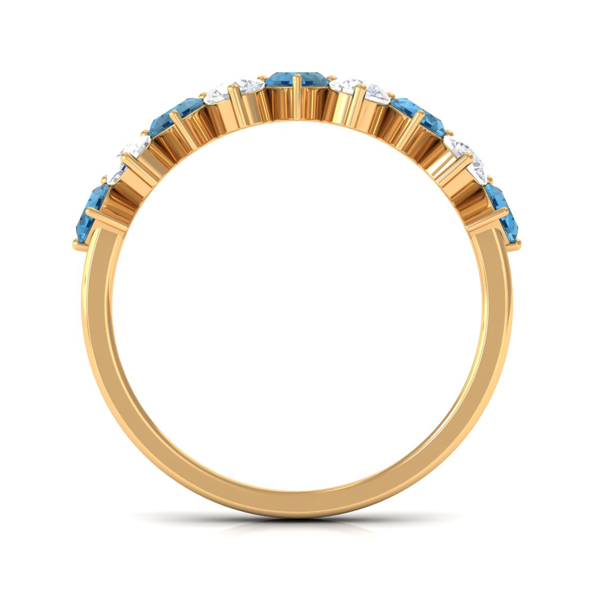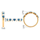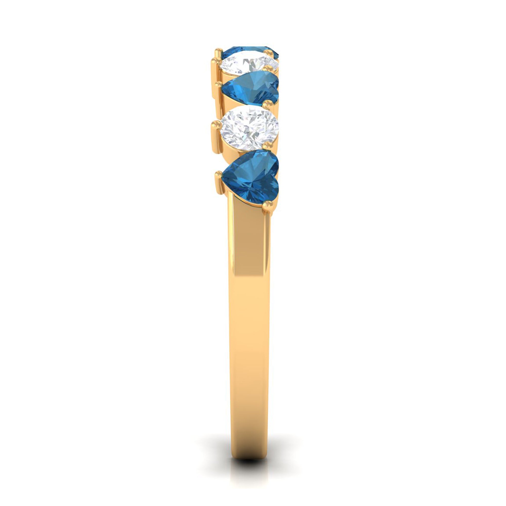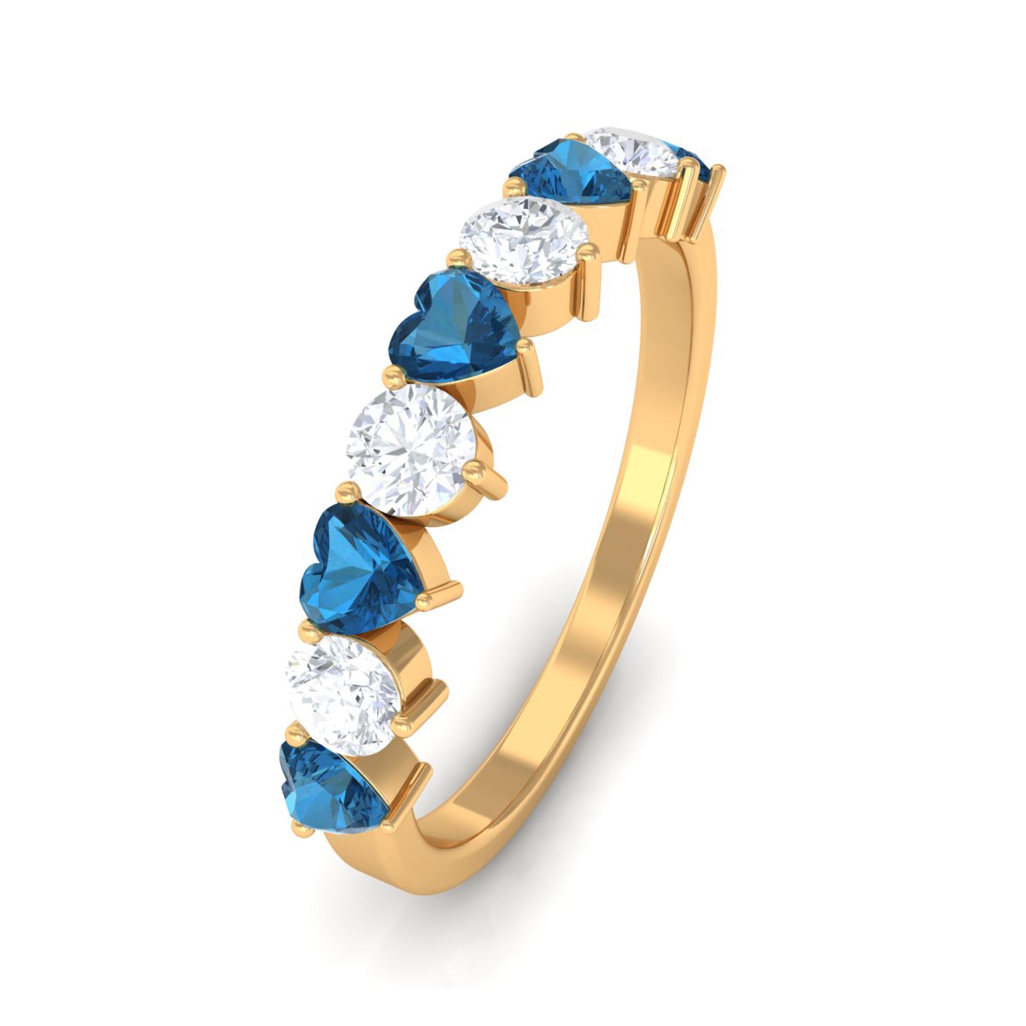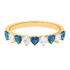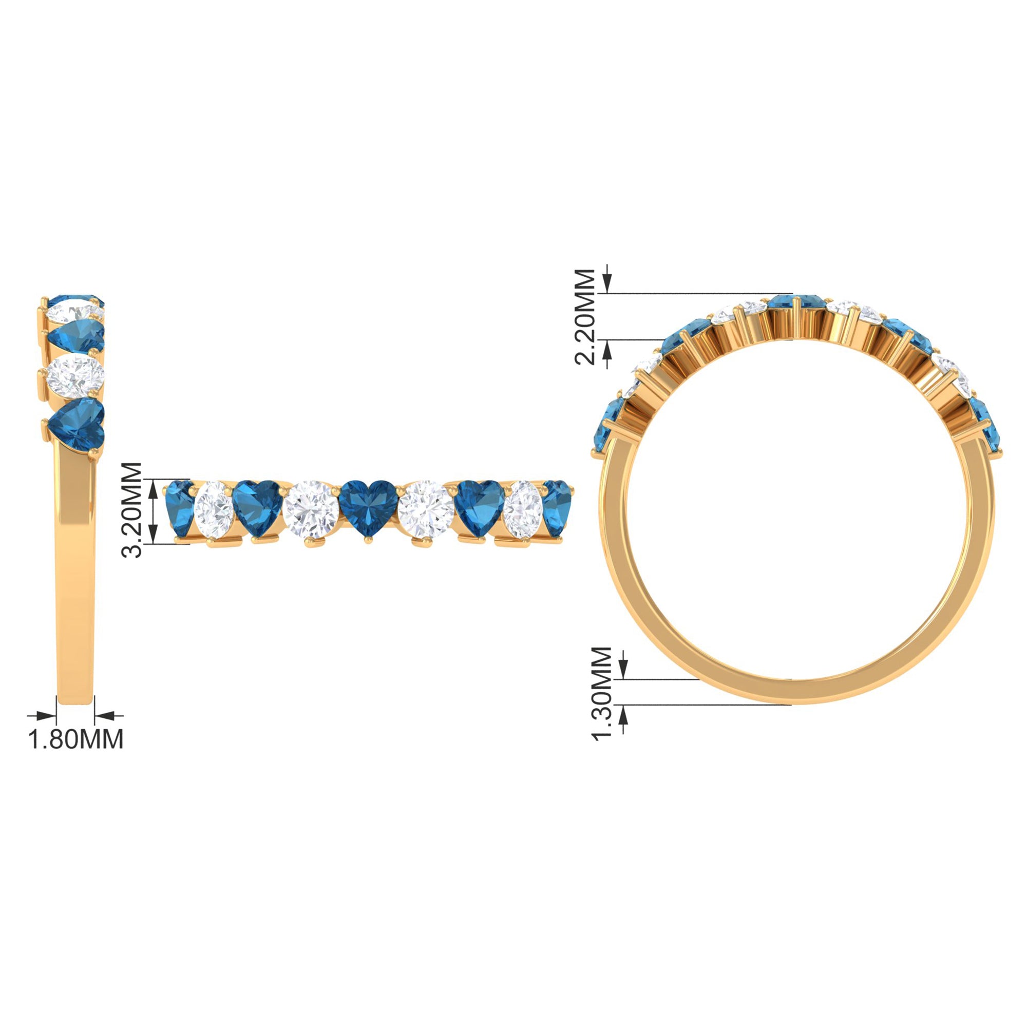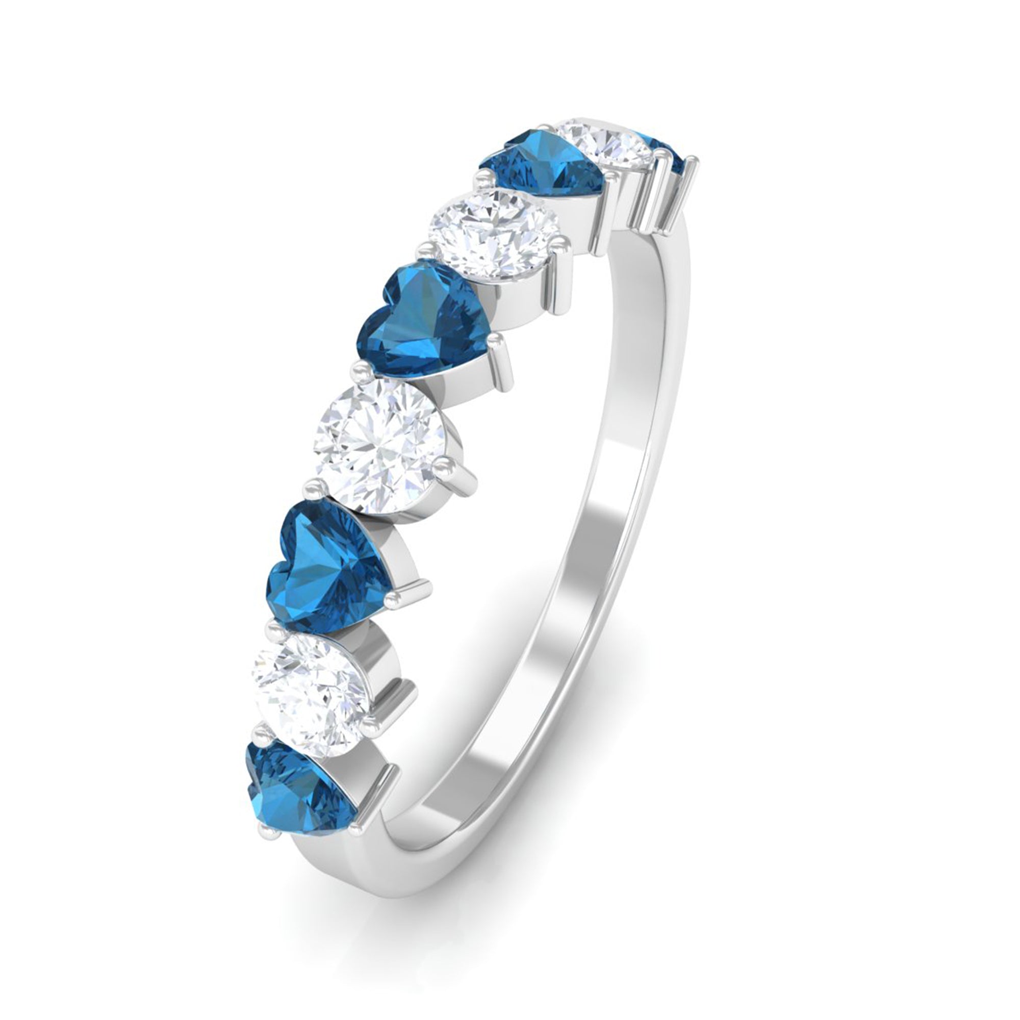 A piece of jewelry that conveys the essence of love. This Blue Topaz Wedding Band embodies significance in every aspect. Crafted to celebrate the enduring connections that last a lifetime, this Heart Eternity Ring serves as an elegant emblem of commitment, meticulously designed to enhance your daily attire. It showcases carefully chosen 4 MM heart-shaped London Blue Topaz gemstones, securely set in prong settings. Each london blue topaz is accompanied by sparkling round-cut moissanites, each nestled within delicate heart-shaped frames. The alternating design creates a harmonious interplay of contrast and brilliance, imparting a gentle romantic glow to the overall aesthetic. Created with care and precision, the Heart Wedding Band features a half eternity style, offering perfect balance and comfort for everyday wear. It is ideal for individuals who appreciate jewelry with a personal touch, embodying both style and sentiment in equal measure. Whether worn solo or stacked with other rings, it brings a subtle elegance to your hand. The heart motifs introduce a romantic touch, making it a considerate choice for an anniversary, a promise, or simply a meaningful gift. This handcrafted Half Eternity Band serves as a tender reminder of enduring love and the cherished moments shared along the journey. Whether commemorating a significant occasion or merely expressing your feelings for someone special, this Eternity Stackable Ring is a timeless treasure, designed to be valued every day.