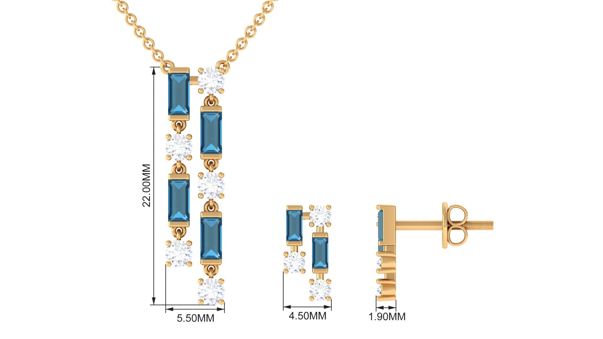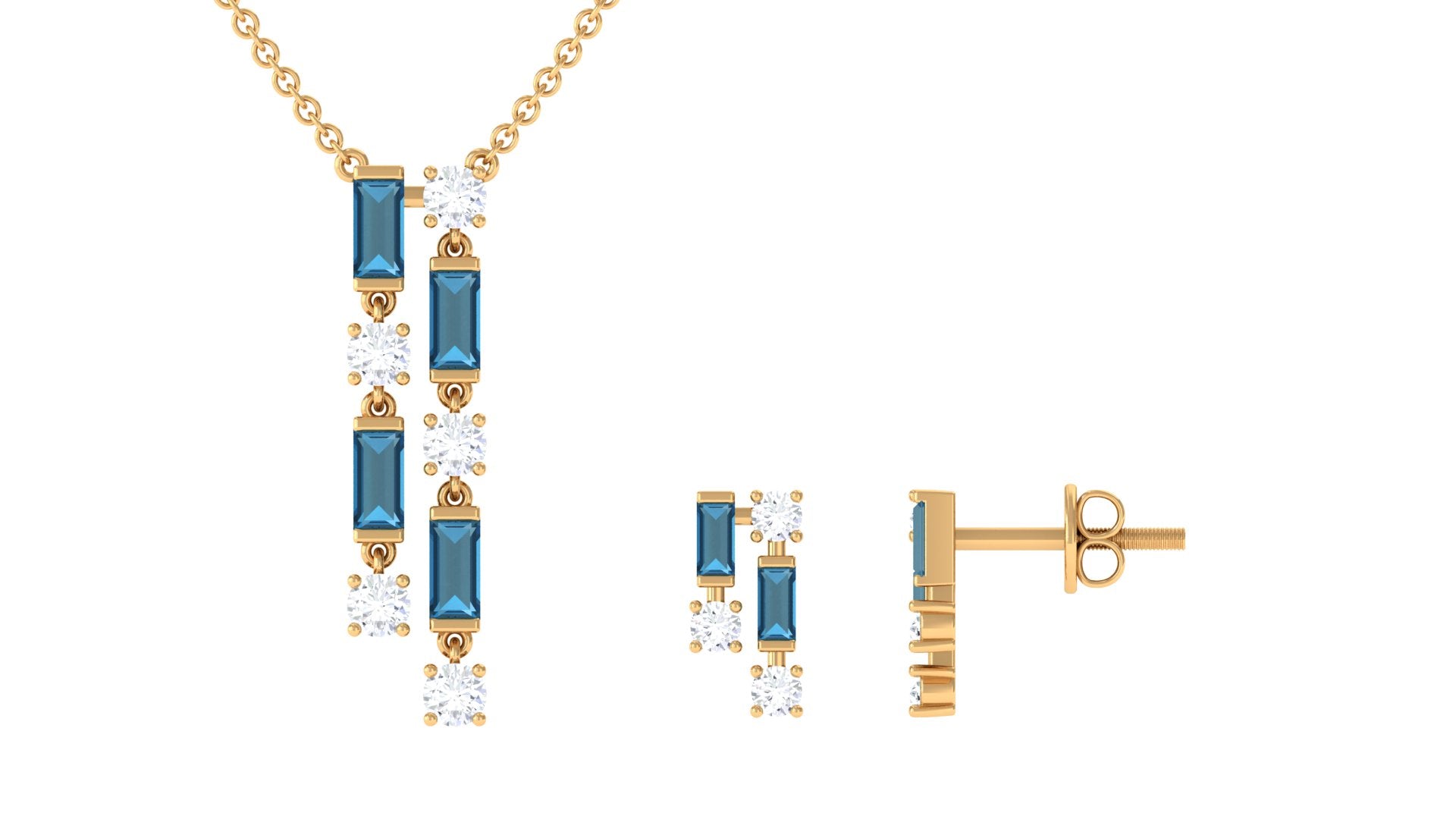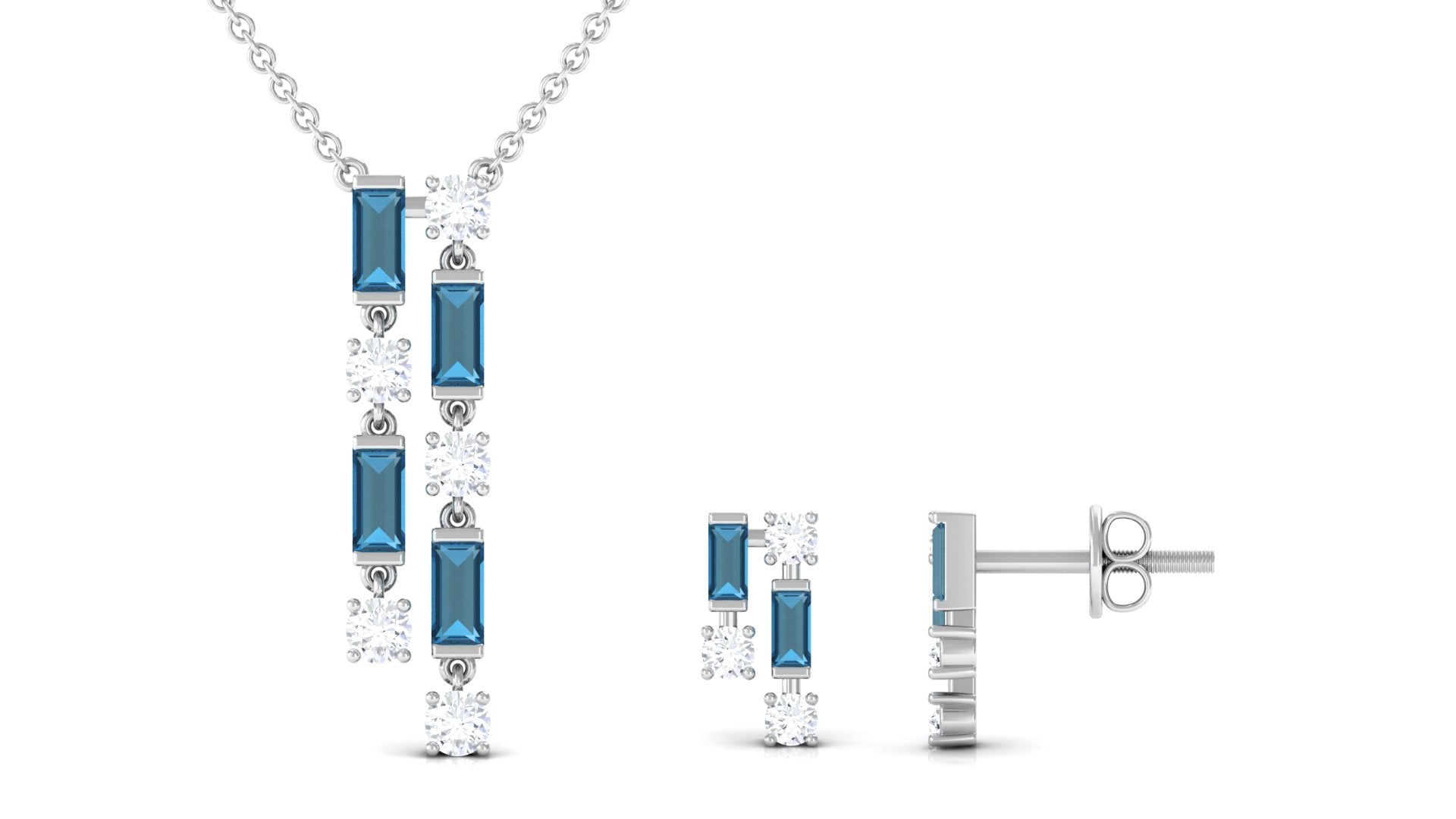 The effortless and stylish design of this jewelry set makes it a versatile accessory that can be worn with any style. Feature a necklace and earrings set embellished with baguette shape london blue topaz and round diamond to add sophistication and class. This blue topaz jewelry will be an elegant gift for occasions like anniversaries, birthdays, or other special occasions.