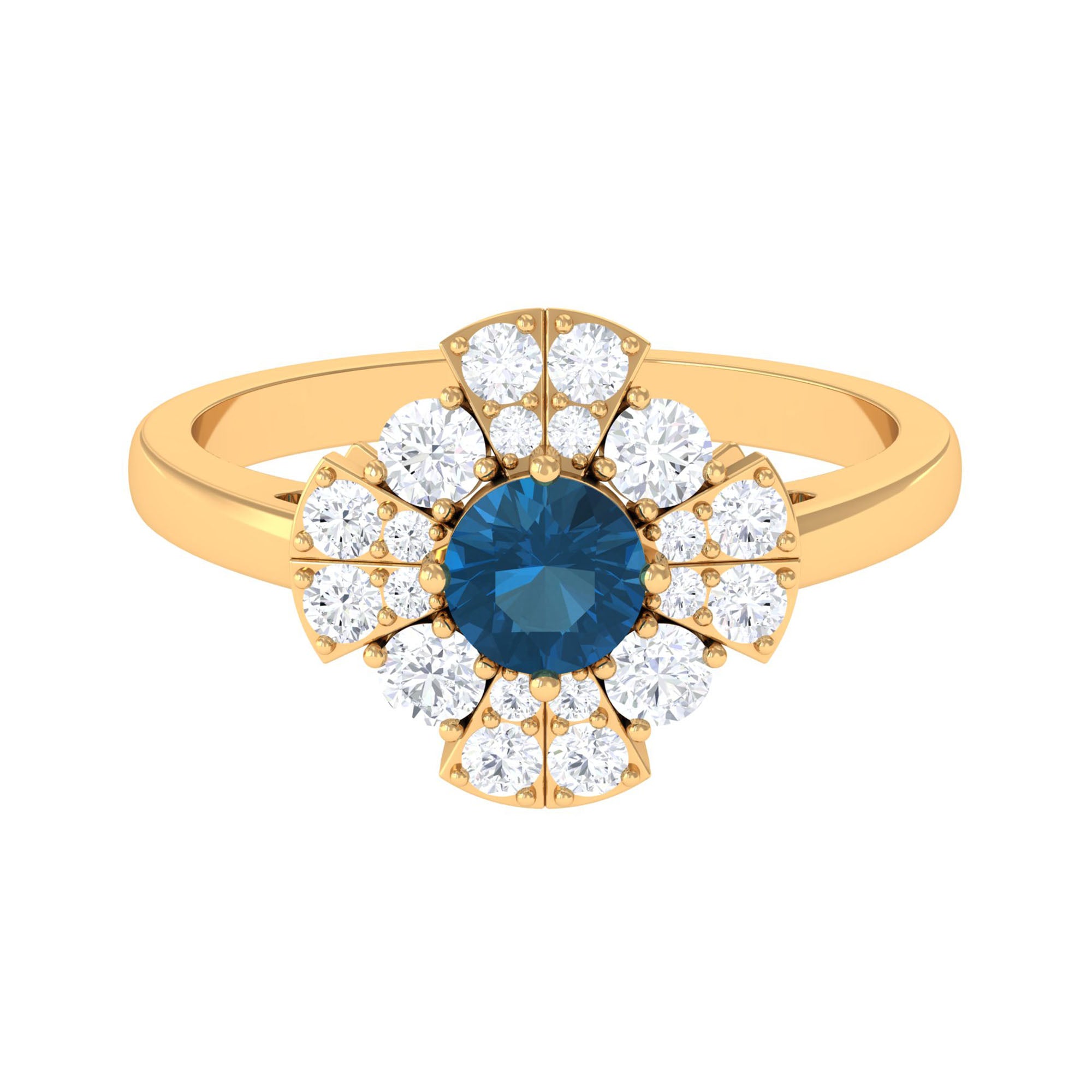 This Flower Engagement Ring is an exceptionally enchanting piece that embodies both romance and radiance. At its core lies a 5 MM round cut London Blue Topaz, set in a prong setting, exuding brilliance and fire, making it the ideal focal point for such a significant piece. Encircling the central stone is a floral-inspired halo of smaller round diamonds, arranged like delicate petals blossoming in perfect harmony. The design encapsulates the essence of natural beauty, evoking the image of a flower in full bloom—timeless, fresh, and vibrant. The sleek band gently narrows to support the floral centerpiece, providing the London Blue Topaz Engagement Ring with an elegant silhouette and allowing the halo to truly dazzle. Whether you are proposing, commemorating an anniversary, or indulging yourself with something special, this Blue Topaz Halo Ring presents an elegant yet playful aesthetic that is suitable for any memorable occasion. Crafted with attention to detail and comfort, the Flower Statement Ring is thoughtfully designed for everyday wear while still making a striking impression. The round cut london blue topaz at the center delivers classic sparkle, while the floral halo introduces a modern, feminine flair. It is the type of piece that feels as joyful and distinctive as the love it symbolizes—bright, beautiful, and eternally blooming.
