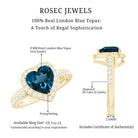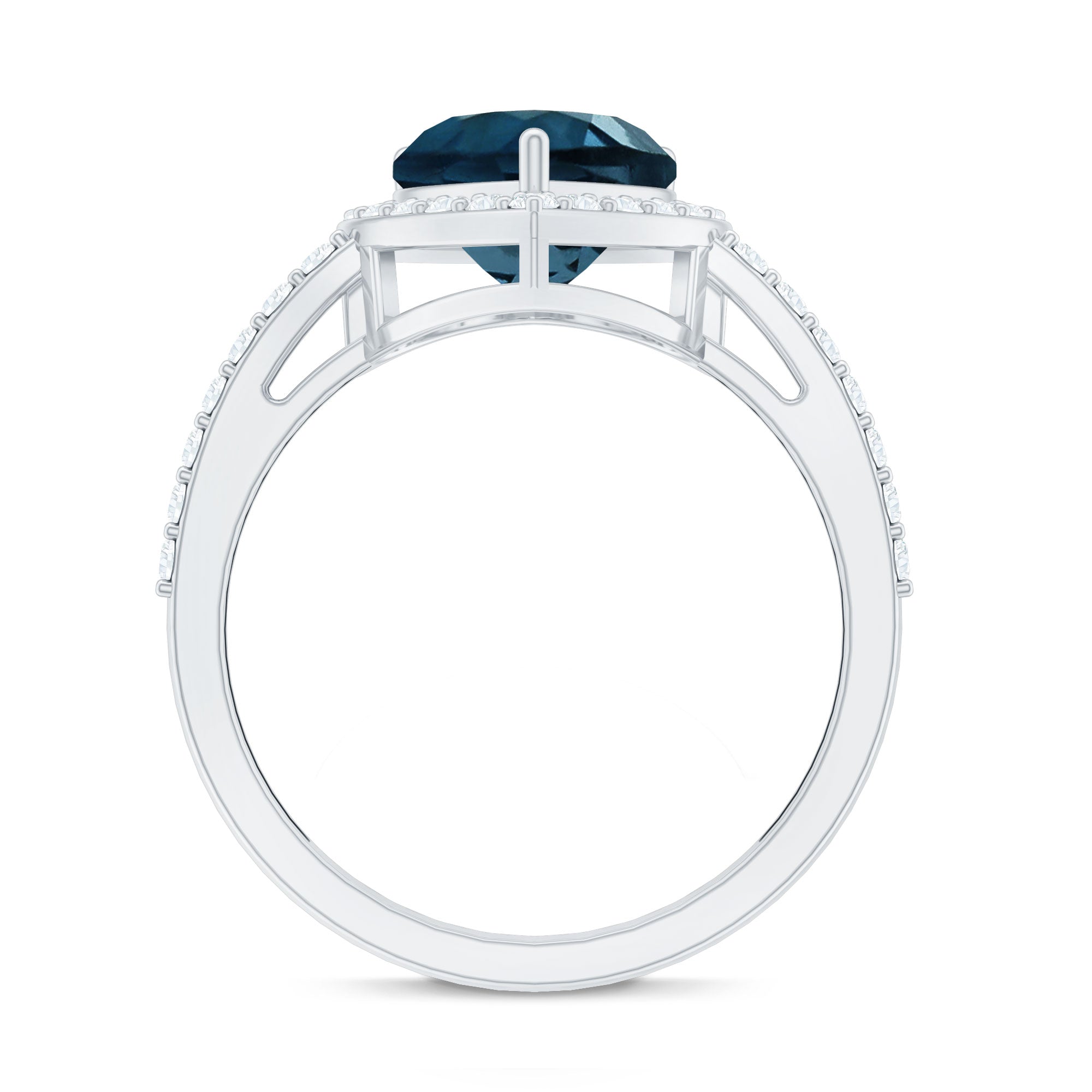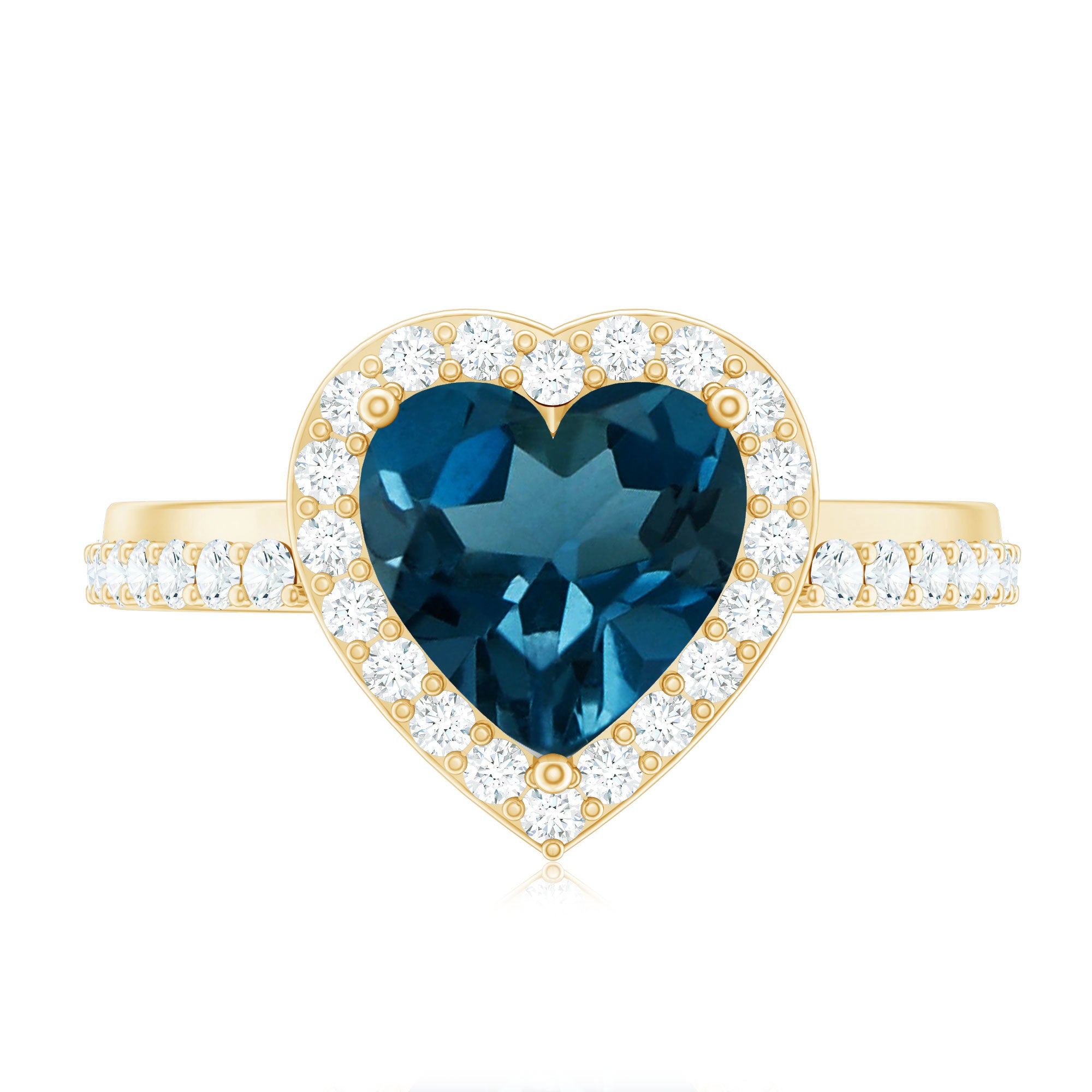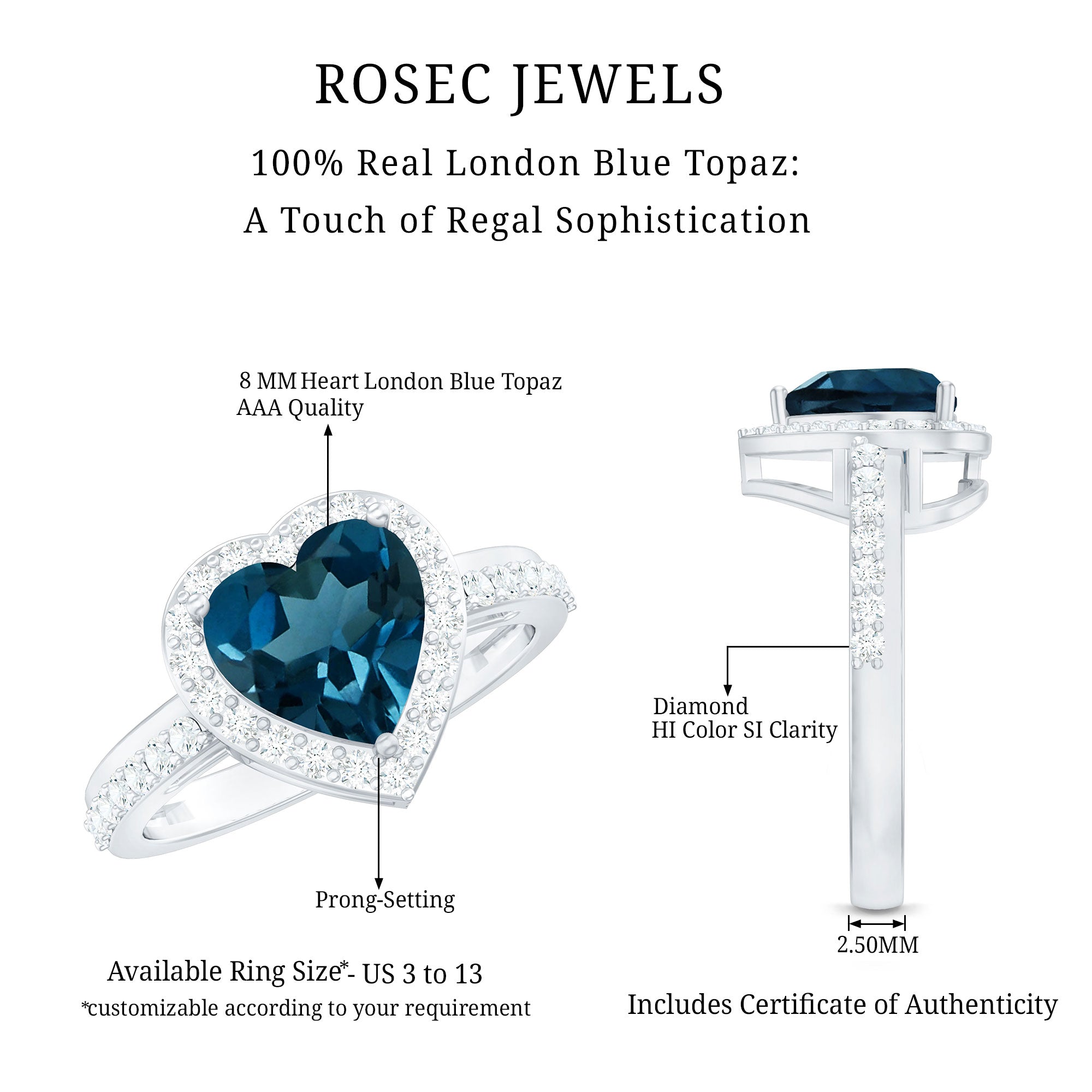 Express your feelings with a sparkle that resonates from the heart. This charming Heart Shaped Topaz Ring transforms ordinary moments into unforgettable memories. At the heart of the design, a 8 MM heart-shaped London Blue Topaz is securely held in prong setting. Encircling the Blue topaz is a fine halo of round diamonds, providing the perfect amount of sparkle. The band offers a graceful appearance, embellished with round diamond side stones. Whether you are making a promise or celebrating a significant milestone, this London Blue Topaz Promise Ring serves as a beautiful reminder of loyalty and love. Simple yet profound, this Heart Promise Ring encapsulates deep emotions within an elegant design. It is suitable for daily wear, yet feels special enough for those extraordinary occasions. Made with AAA quality london blue topaz and HI-SI quality diamonds, this Heart Halo Ring is not only stunning but also ethically produced. The Blue Topaz and Diamond Ring is presented in a signature jewelry box and comes with a certificate of authenticity, making it ready to be gifted upon arrival.