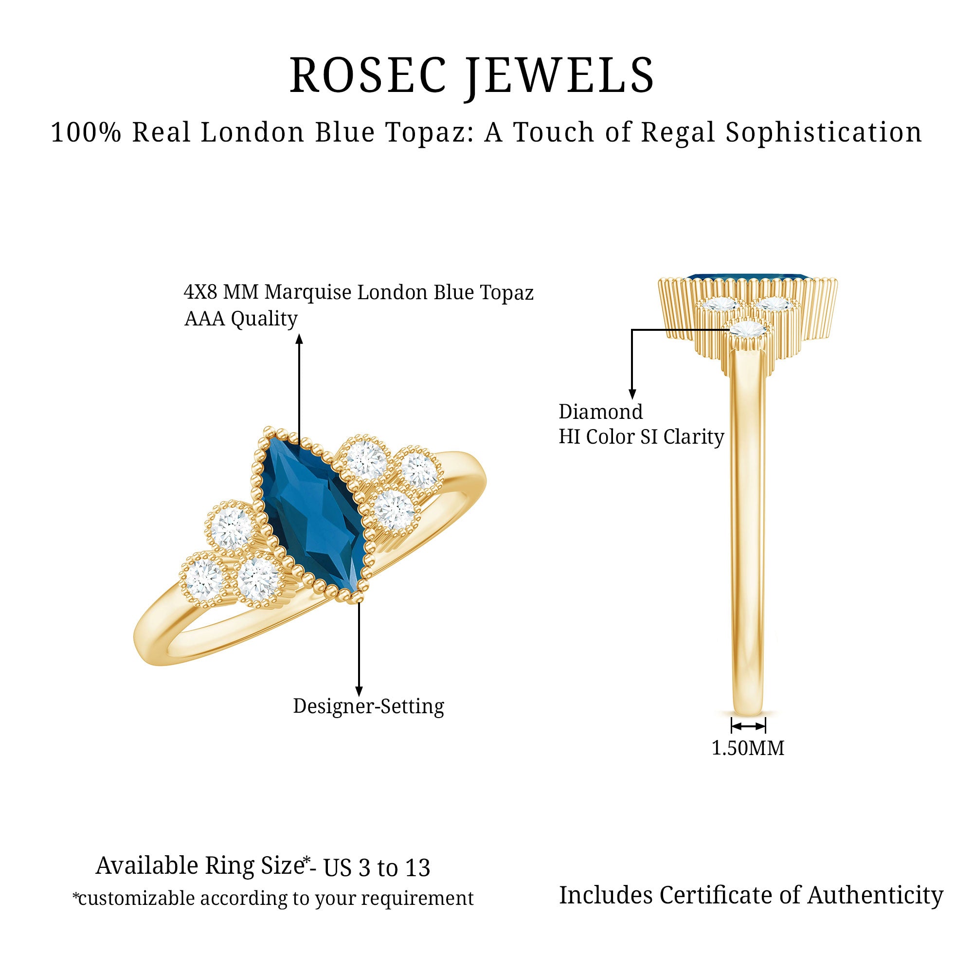 Capture the attention of everyone around you with the exquisite features of this London Blue Topaz Engagement Ring, which effortlessly merges timeless charm with a modern, brilliant luster. At its core is a breathtaking 4X8 MM marquise cut London Blue Topaz, expertly set in a designer setting that accentuates its elegant, elongated shape. The AAA quality london blue topaz symbolizes everlasting love and true commitment. To amplify its radiance, three round-shaped Diamond stones are thoughtfully positioned on each side of the center stone, all crafted in the same designer style for a harmonious look, creating a stunning and eye-catching trio design. This arrangement of stones enhances the ring’s overall brilliance while maintaining a refined simplicity that conveys deep meaning. The sleek, comfortable band complements the striking trio style perfectly, making this Marquise Engagement Ring an excellent choice for everyday wear with a touch of sophistication. This piece is a stunning combination of elegance and significance, ideal for individuals seeking jewelry that embodies a profound meaning. Meticulously crafted with AAA quality London blue topaz and HI-SI quality diamonds, this Bezel Engagement Ring not only exudes luxury but also offers comfort for daily wear. Whether you are making a proposal, commemorating a significant event, or presenting it as a gift to a cherished person, this Blue Topaz and Diamond Engagement Ring is designed to endure and be treasured for many years.