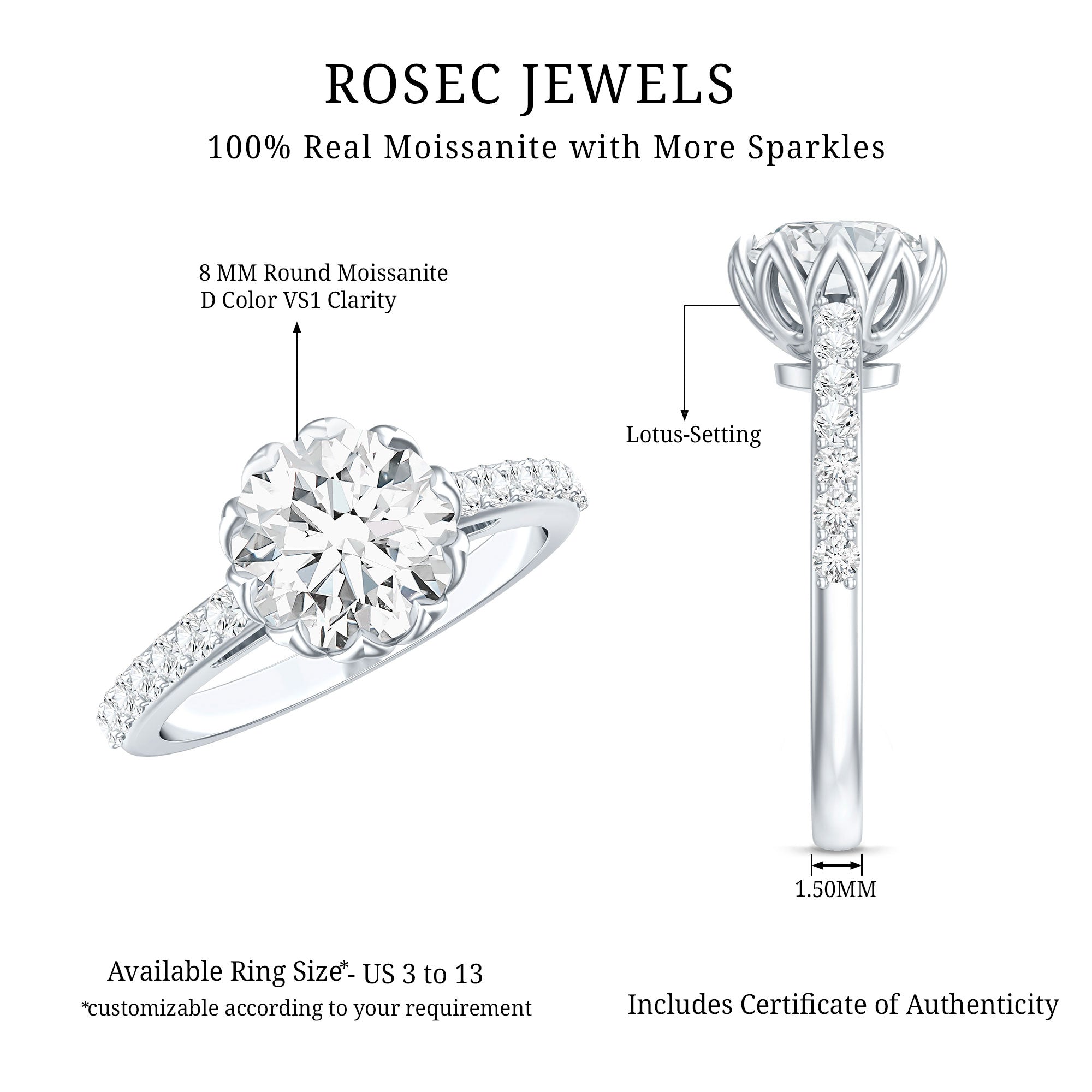 Drawing inspiration from nature’s purest symbol, this Moissanite Solitaire Engagement Ring is a romantic fusion of elegance and meaning. The centerpiece is a dazzling 8 MM round brilliant cut moissanite, expertly cut to capture maximum brilliance and fire. Held securely in lotus basket setting, the center stone is cradled like a blooming flower, symbolizing purity, new beginnings, and eternal love. The lotus-inspired design adds a graceful, floral charm to the overall look, creating a setting that is both artistic and symbolic. Enhancing the solitaire is the band, which is beautifully accented with sparkling side stones that upgrade the ring’s radiance without overpowering the main gem. This Flower Engagement Ring strikes the perfect balance between classic and contemporary, with its timeless round cut and unique lotus basket detail. The Moissanite Engagement Ring is designed to be worn comfortably every day, with a setting that offers both durability and elegance. Carefully crafted and truly eye-catching, this 2 Carat Moissanite Ring is a heartfelt way to say forever. Ideal for the modern romantic, it is a meaningful piece that promises to shine for a lifetime.