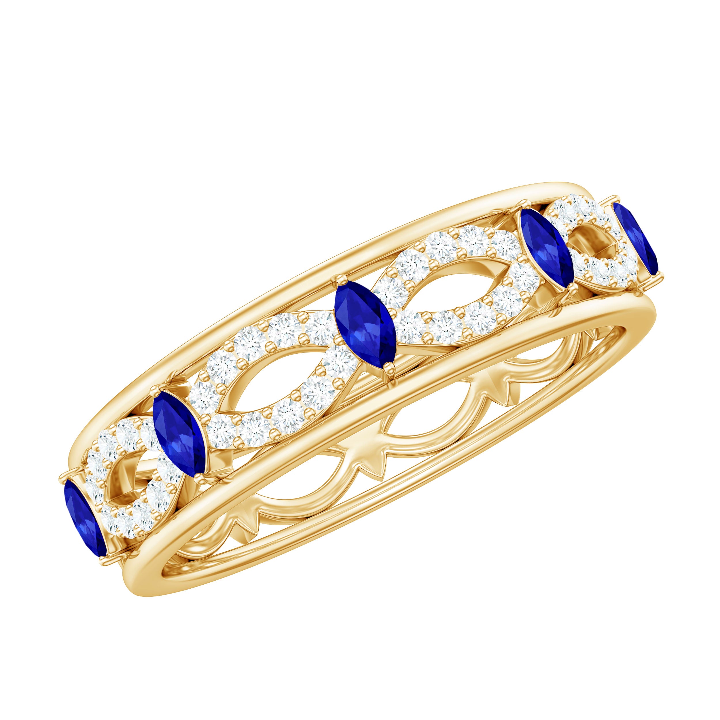 This infinity band ring showcases a combination of marquise cut created blue sapphire and Round Shape Diamond set in luxurious gold. The infinity design symbolizes everlasting love and adds a touch of romance to this already stunning piece of jewelry. Whether youre searching for a special gift, or a new addition to your collection, this eternity band ring in gold is a beautiful choice.