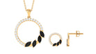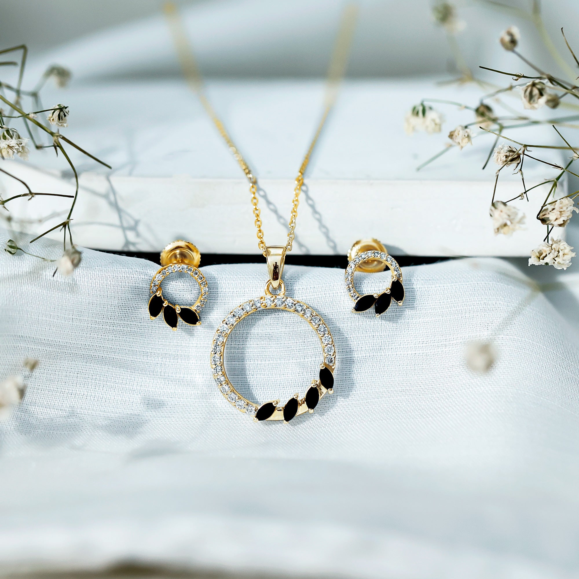 An embodiment of eternal togetherness and undying love- our exquisite eternity jewelry set comprises a sparkling pendant necklace and a complementing pair of earrings. With an open circle dotted with dainty round Diamond and marquise cut black onyx, the eternity jewelry set exudes an aura of sophistication that makes you keep reaching out to it even after a few wears. The Diamond and black onyx dazzle brilliantly in contrast to each other. Don it on an evening out or as something that sprinkles magic to your special days.