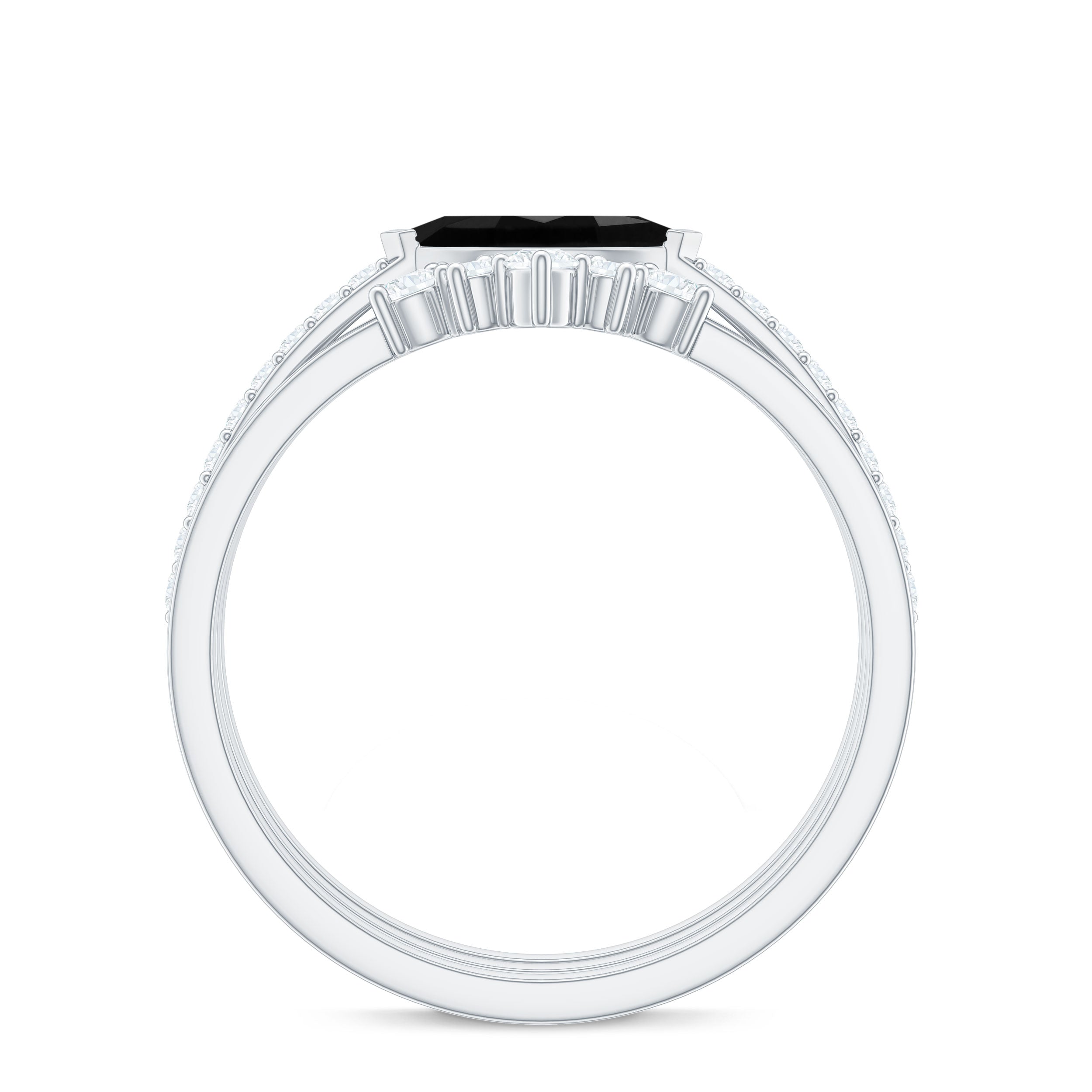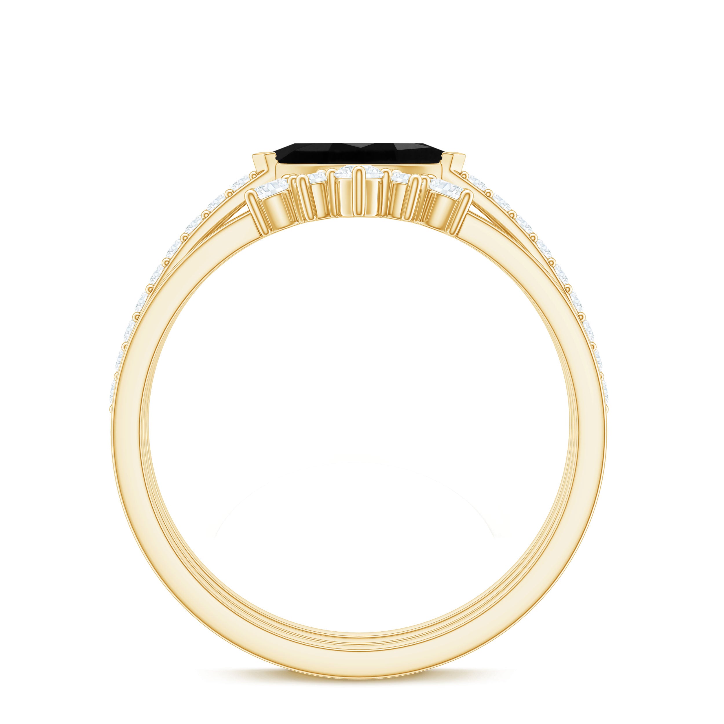 Step into your new beginning with a ring set that feels both modern and meaningful. This stunning Black Onyx Wedding Ring Set is made to turn heads while holding deep emotional value. Designed with care, this 3 Piece Bridal Set offers a balanced mix of elegance, style, and symbolism. At the heart of the set is a 4X8 MM marquise cut black onyx, placed in an east west style in secure prong setting. Round sparkling diamonds on either side of the center add a shimmer, perfectly framing the onyx and giving the engagement ring a perfect look. Paired with the main ring are two crown shaped enhancer bands that bring extra charm and detail to the Black Onyx Engagement Ring Set. Each band features round diamond stones arranged in a curved pattern, creating a graceful frame around the center ring. These bands not only highlight the beauty of the engagement ring but also add a regal feel to the complete look. Together, the three rings create a complete bridal look that is perfect for anyone who loves a mix of classic and modern design. You can wear all three for a bold statement or mix and match for different occasions. Designed for comfort and long-lasting wear, this Black Onyx Bridal Set will be a reminder of your promise, every single day.