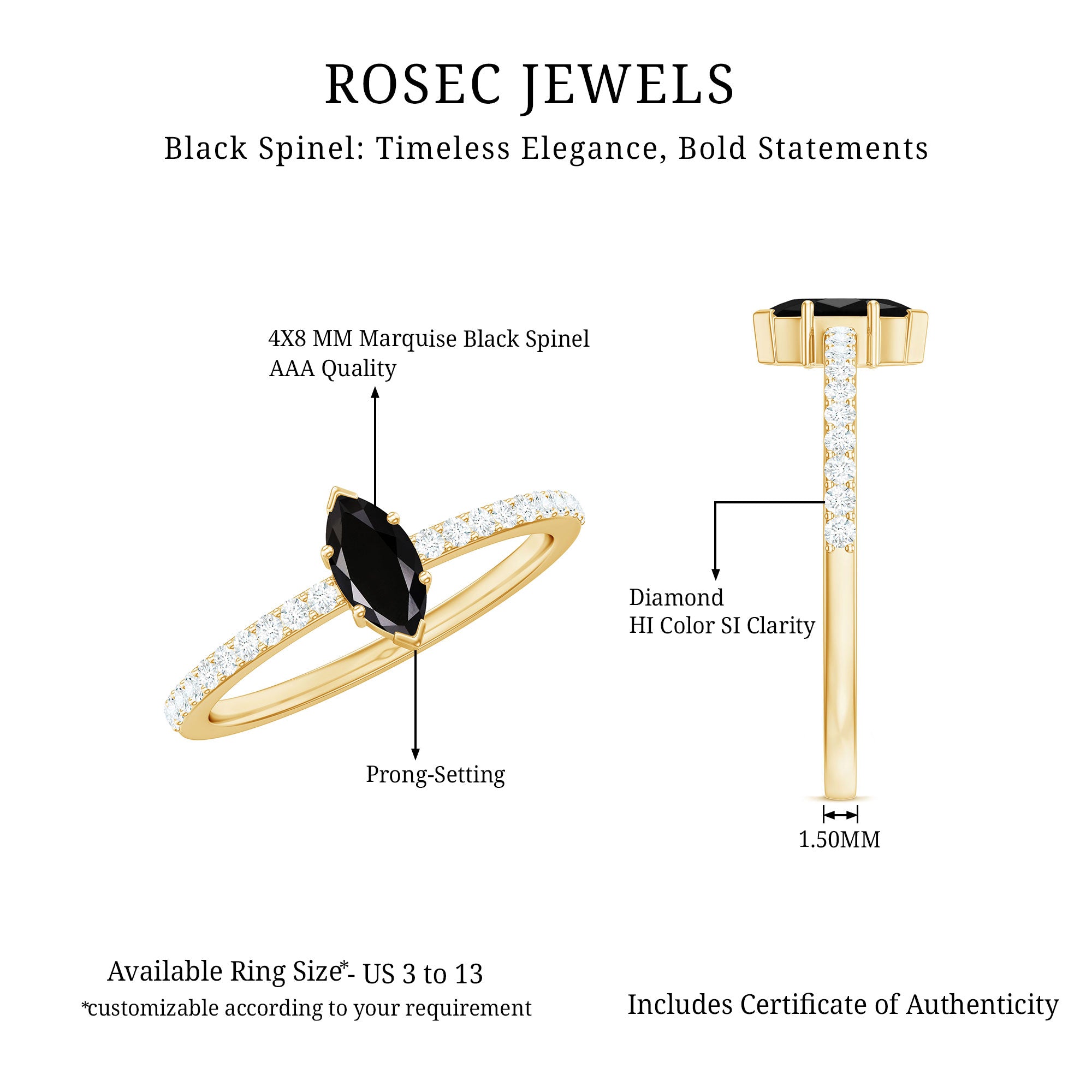 A striking symbol of your everlasting love, this gorgeous Promise Ring for her features a lovely center marquise shape Black Spinel and Round Shape Diamond set as side stones.