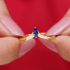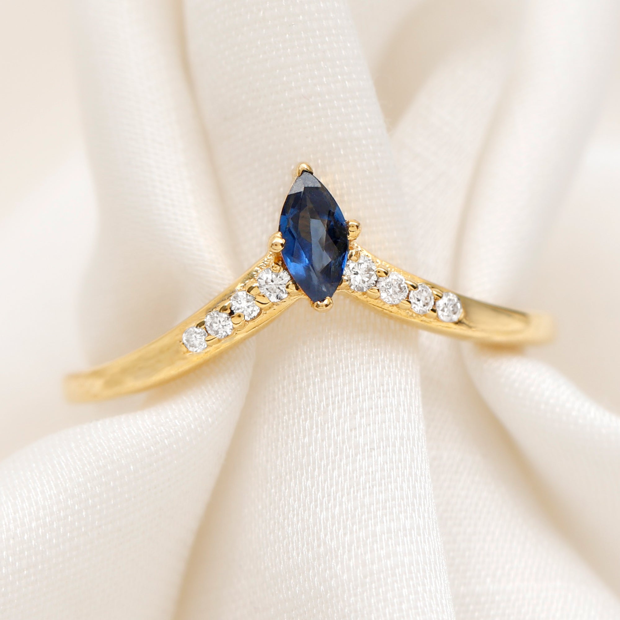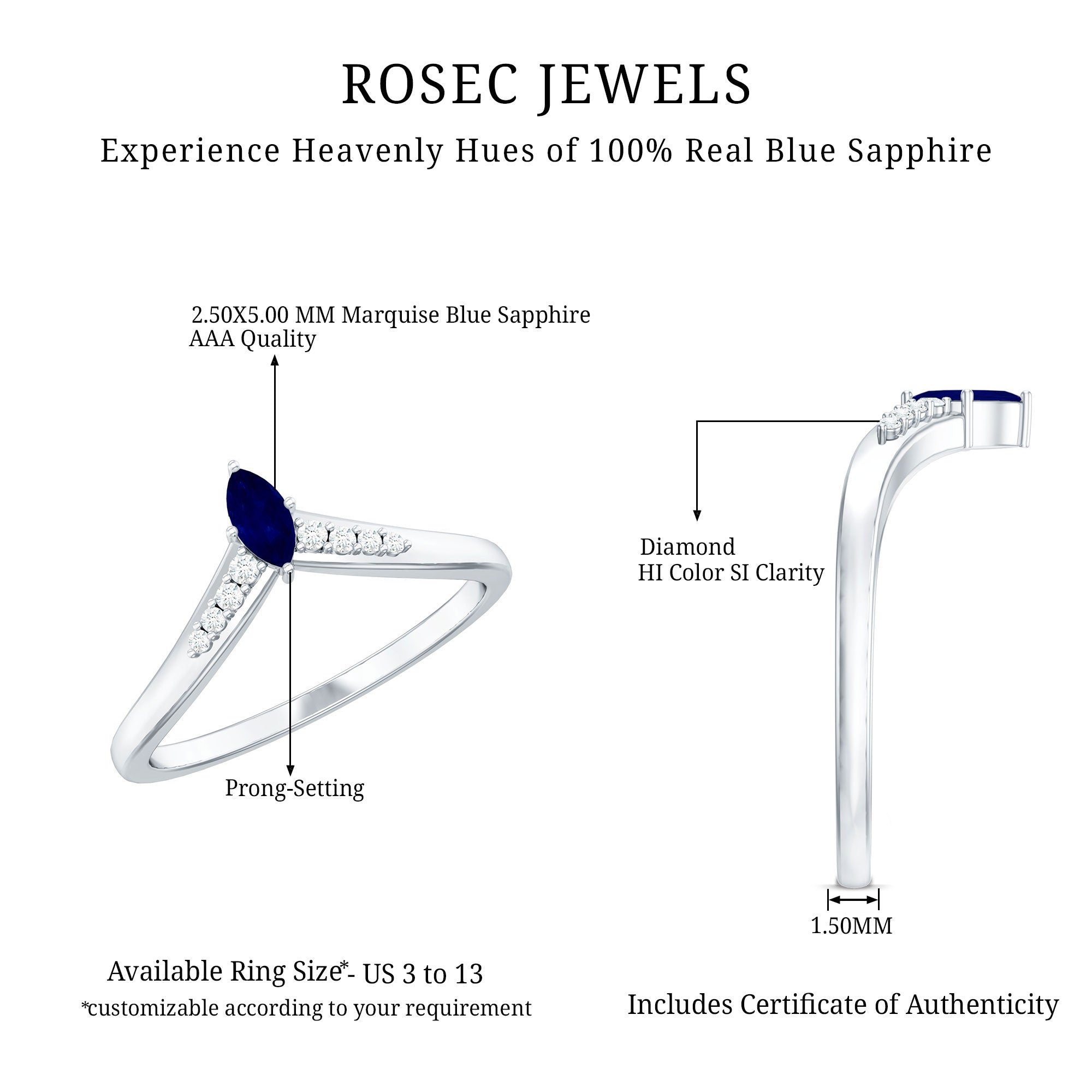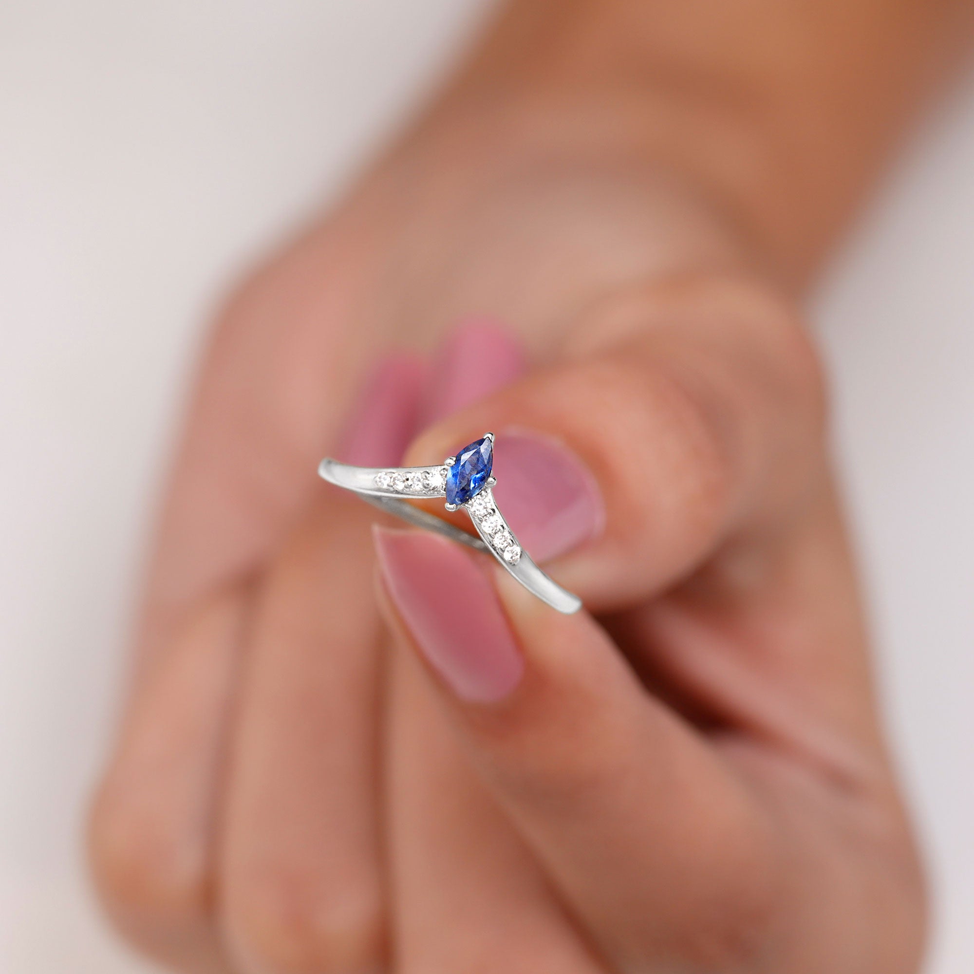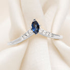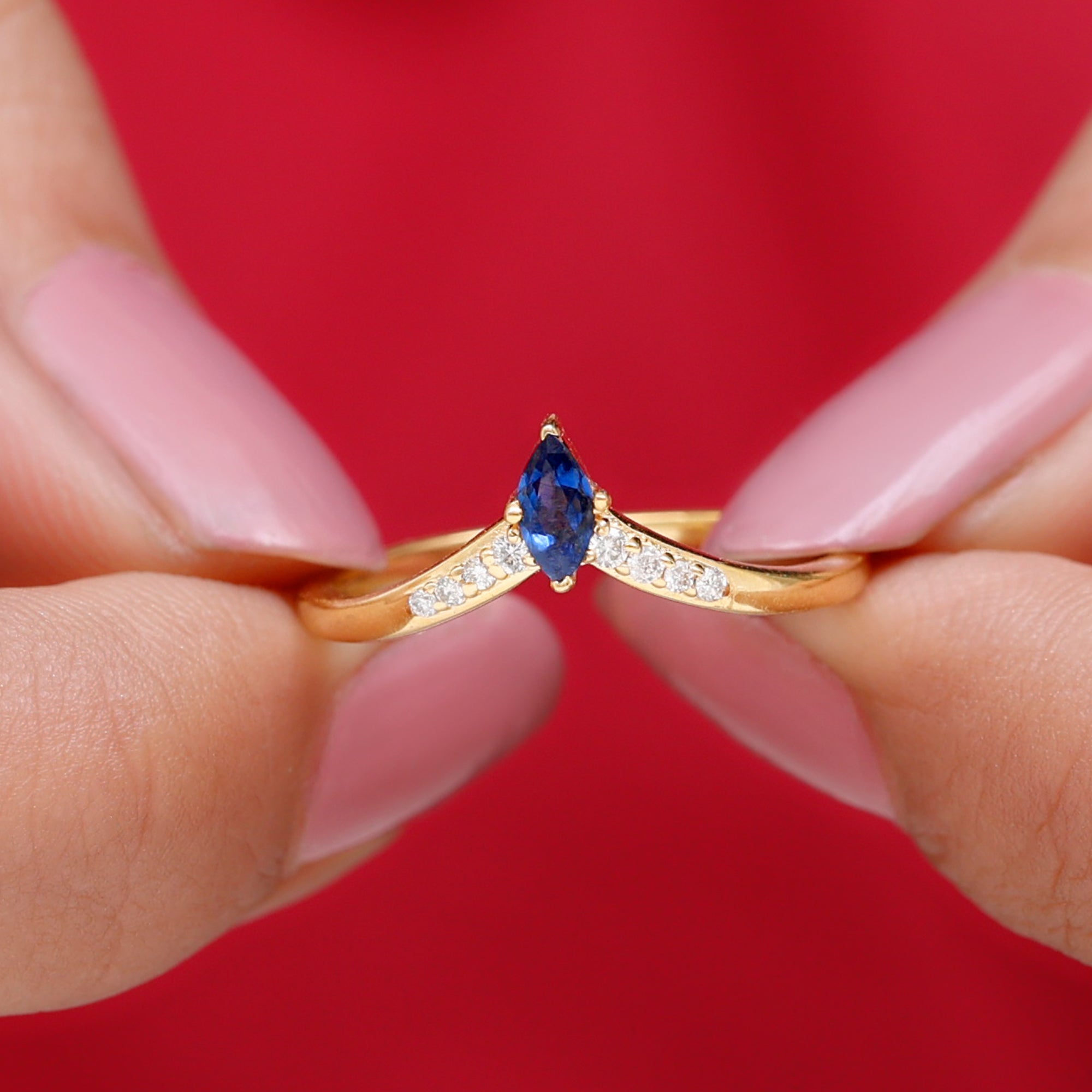 Enhance your style by pairing this V-shaped enhancer ring with your cherished jewelry or let it stand alone for a contemporary touch. This charming Stackable Ring features Marquise-cut Blue Sapphires in a secure Prong Setting, accented by shimmering Diamond Stones. The Blue Sapphire Ring is perfect for stacking alongside your Wedding or Engagement Ring, adding a touch of brilliance and sophistication to your costume.