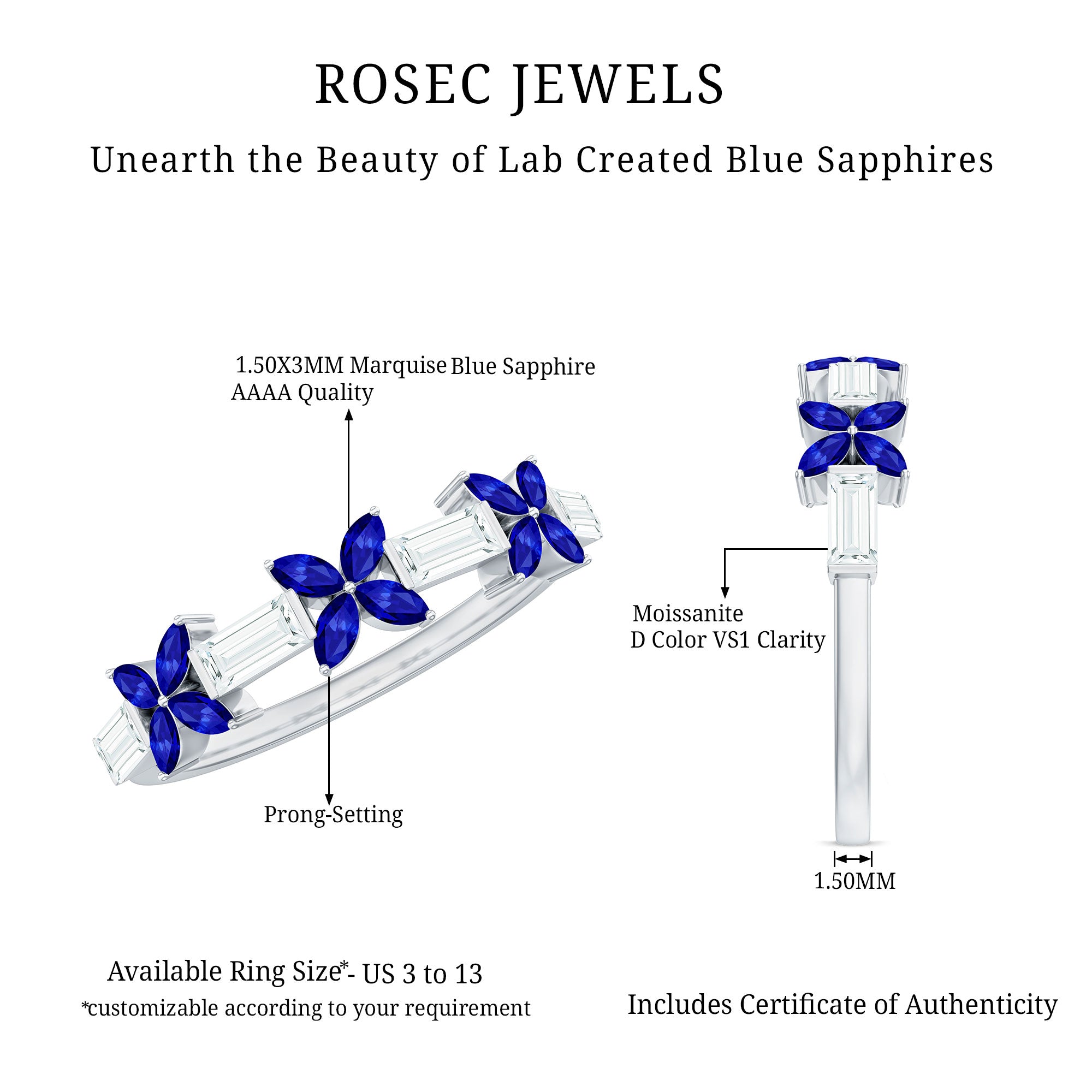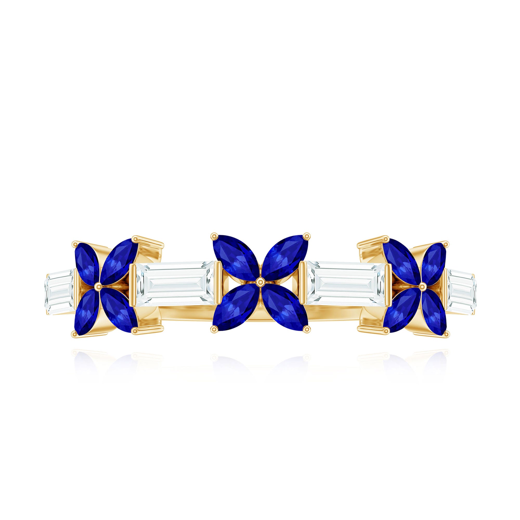 This flower eternity ring features a unique and beautiful design set in gleaming gold. The marquise cut created blue sapphire are arranged in a flower shape with baguette cut moissanite. The combination of the elegant marquise cut and angular baguette cut creates a mesmerizing look that is perfect for adding a touch of sophistication to any occasion. Whether worn alone or stacked with other bands, half eternity ring is sure to become a cherished piece.