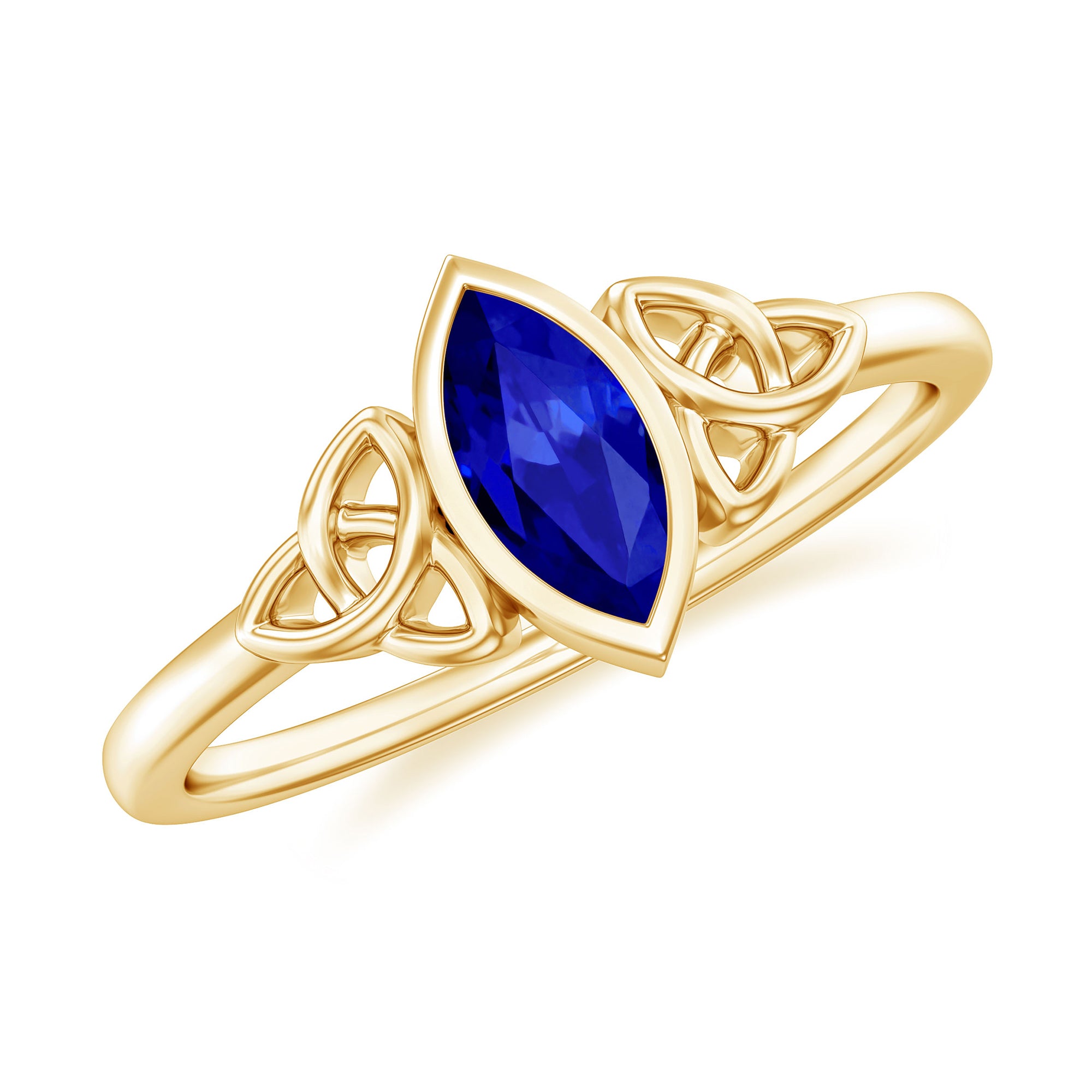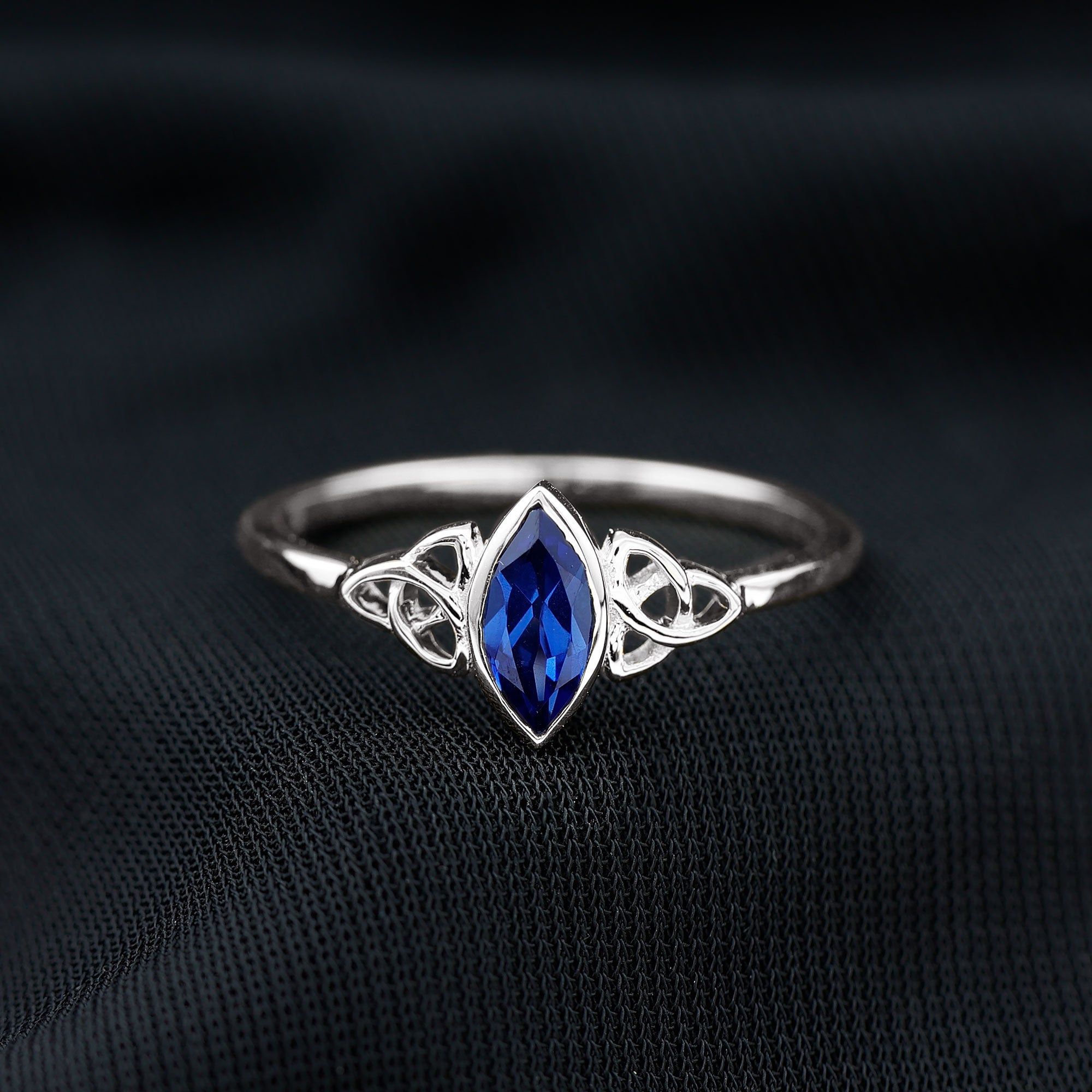 Marquise Cut Created Blue Sapphire Solitaire Celtic Knot Ring in Bezel Setting
