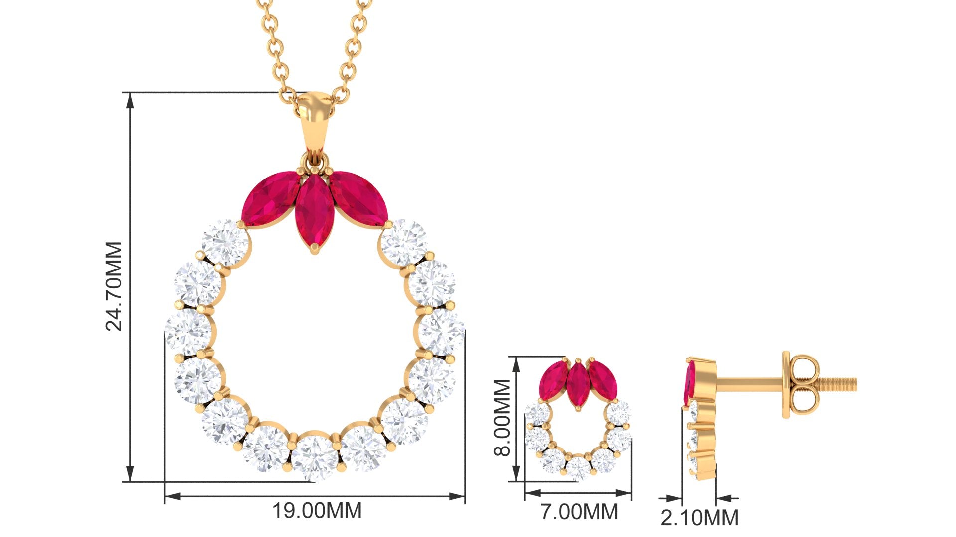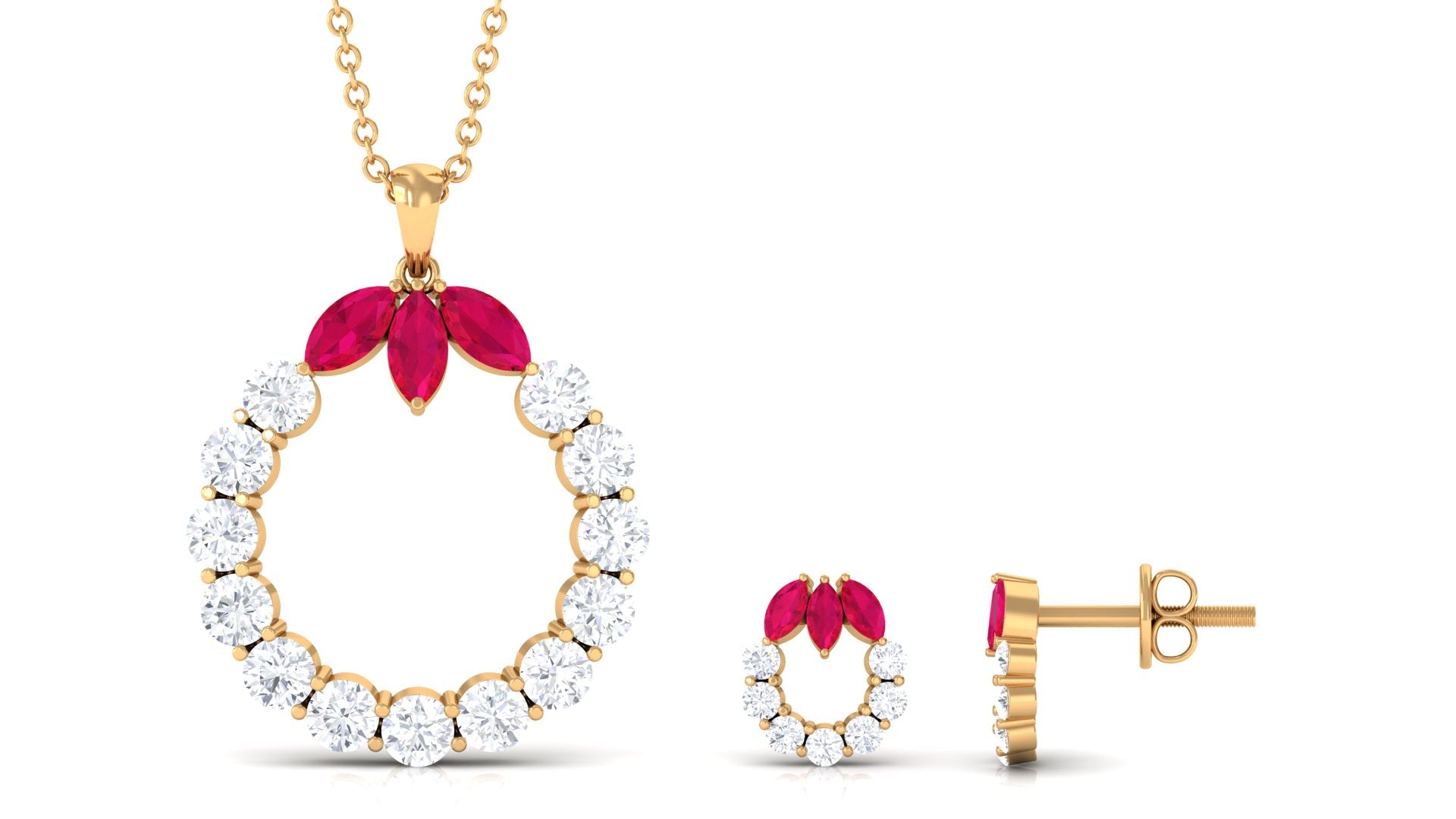 Add a touch of glamour to any outfit with this Eternity Pendant and Earrings set. Crafted in luxurious gold, the jewelry set features exquisite Marquise-Cut Created Ruby gemstones and sparkling Moissanite in a dazzling eternity design. The pendant and earrings are secured with sturdy prong settings, making this set a perfect gift for a loved one or a special treat for yourself.