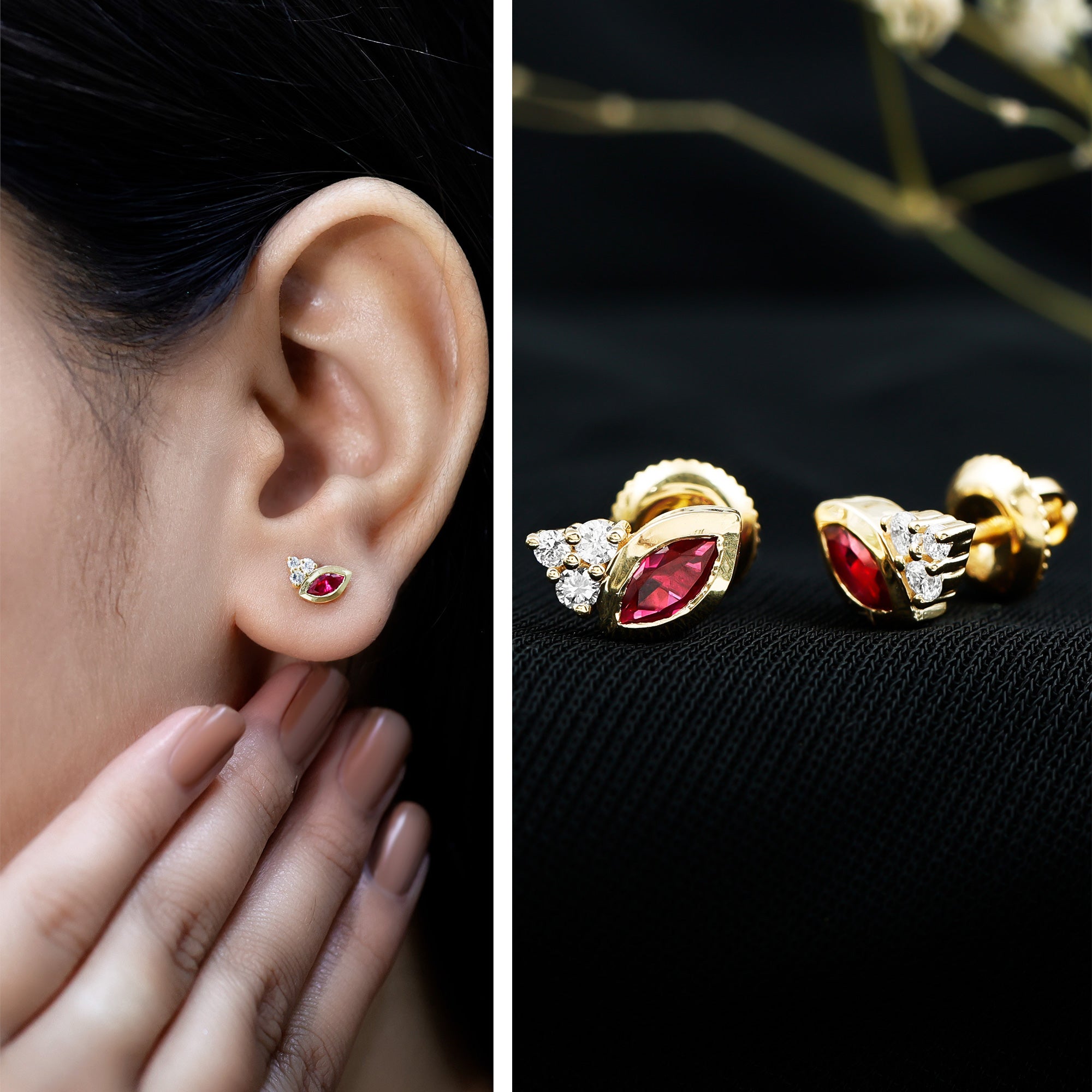 Add a bold pop of color and timeless beauty to your jewelry collection with these stunning Ruby Stud Earrings. Crafted in yellow gold plated silver, each earring features a vibrant 3X6 MM marquise cut lab grown ruby, set in bezel setting for a modern look. These AAAA quality ruby stones offer a rich and eye-catching shine that stands out with elegance. To add extra sparkle, a trio of round lab grown diamonds is set on one side of each earring. With their bright EF color and VS clarity, the diamonds create a beautiful contrast against the bold ruby, giving the Marquise Stud Earrings a balanced and refined look. Whether you are dressing up for a celebration or adding something special to your everyday outfit, these Ruby and Diamond Earrings are a perfect choice. Their simple yet striking design makes them easy to wear, while their screw back closure ensures they stay secure and comfortable. Made with lab-grown gemstones, these Silver Ruby Earrings are not only beautiful but also an ethical and eco-friendly choice. They are a great way to enjoy luxury with a clear conscience. Ideal for gifting or treating yourself, they blend classic charm with modern style, a timeless accessory you will reach for again and again.