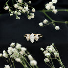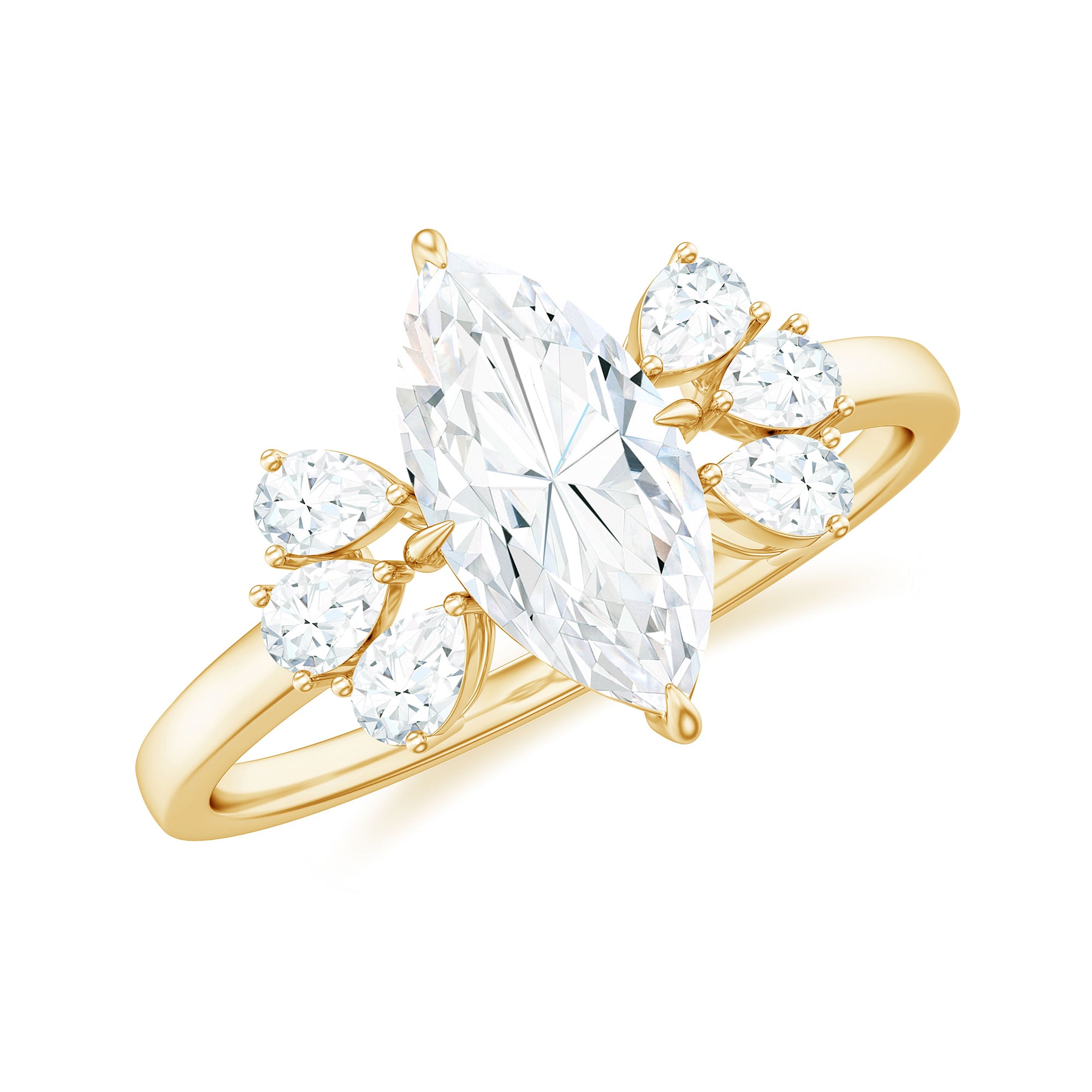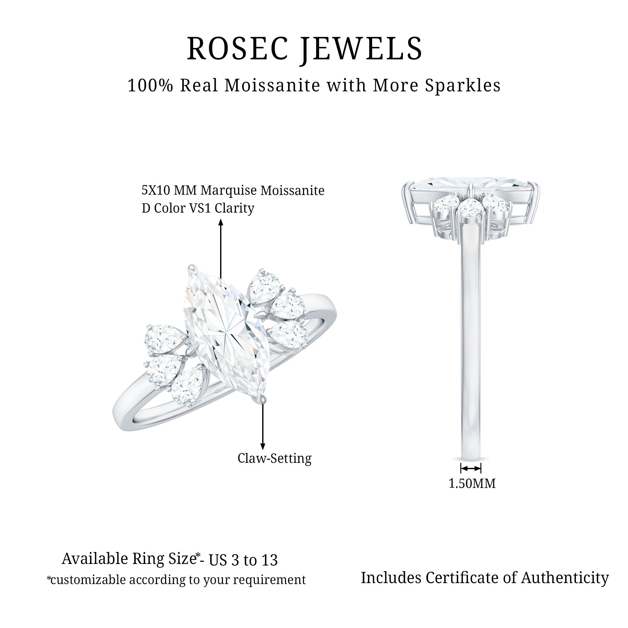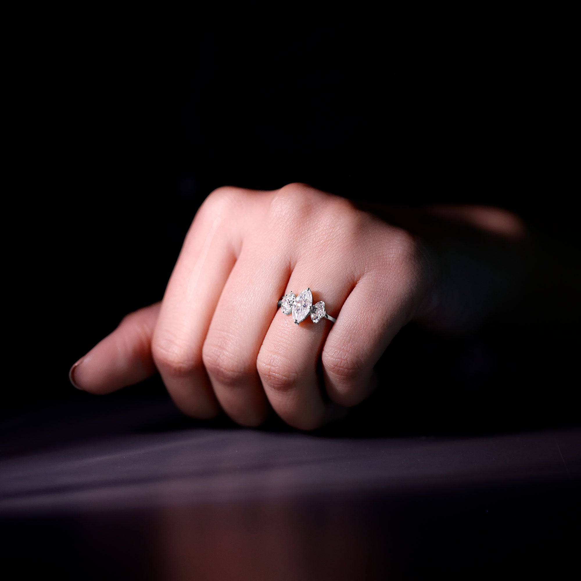 Graceful and captivating, this Moissanite Engagement Ring effortlessly blends timeless charm with a modern, luminous glow. At its center sits a dazzling 5X10 MM marquise cut moissanite, expertly set in prong setting that showcases its elegant, elongated shape. The D-VS1 quality Moissanite symbolizes lasting love and pure devotion. To amplify its sparkle, three pear shaped moissanite stones are thoughtfully arranged on each side of the center stone, creating a harmonious and eye-catching trio design. This cluster of stones enhances the ring’s overall radiance while maintaining a refined simplicity that speaks volumes. Each moissanite in this Marquise Engagement Ring is carefully selected and positioned, offering an ethical and affordable alternative to traditional diamonds without compromising on beauty or brilliance. The smooth, comfortable band complements the striking trio setting, making it perfect for everyday wear with a touch of sophistication.