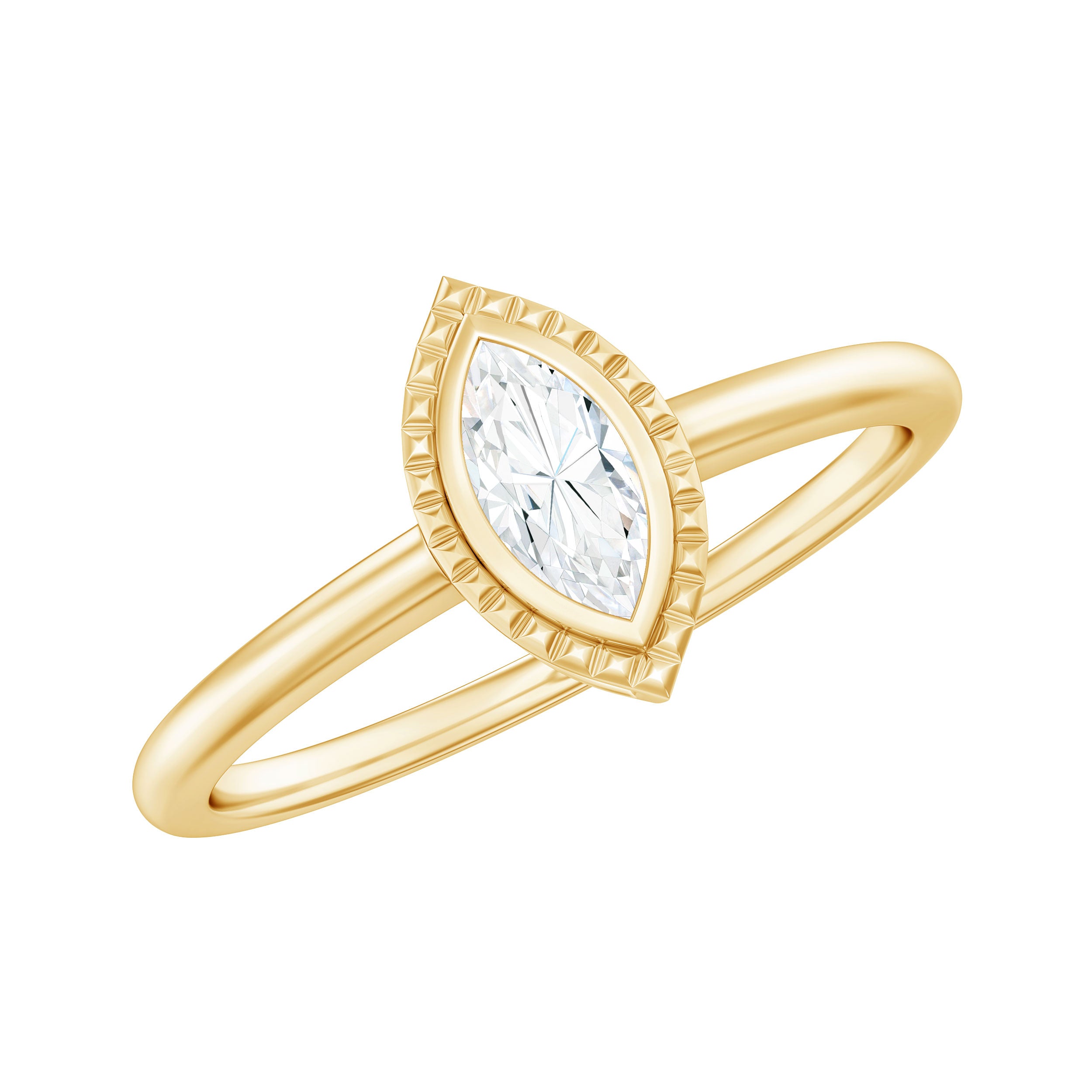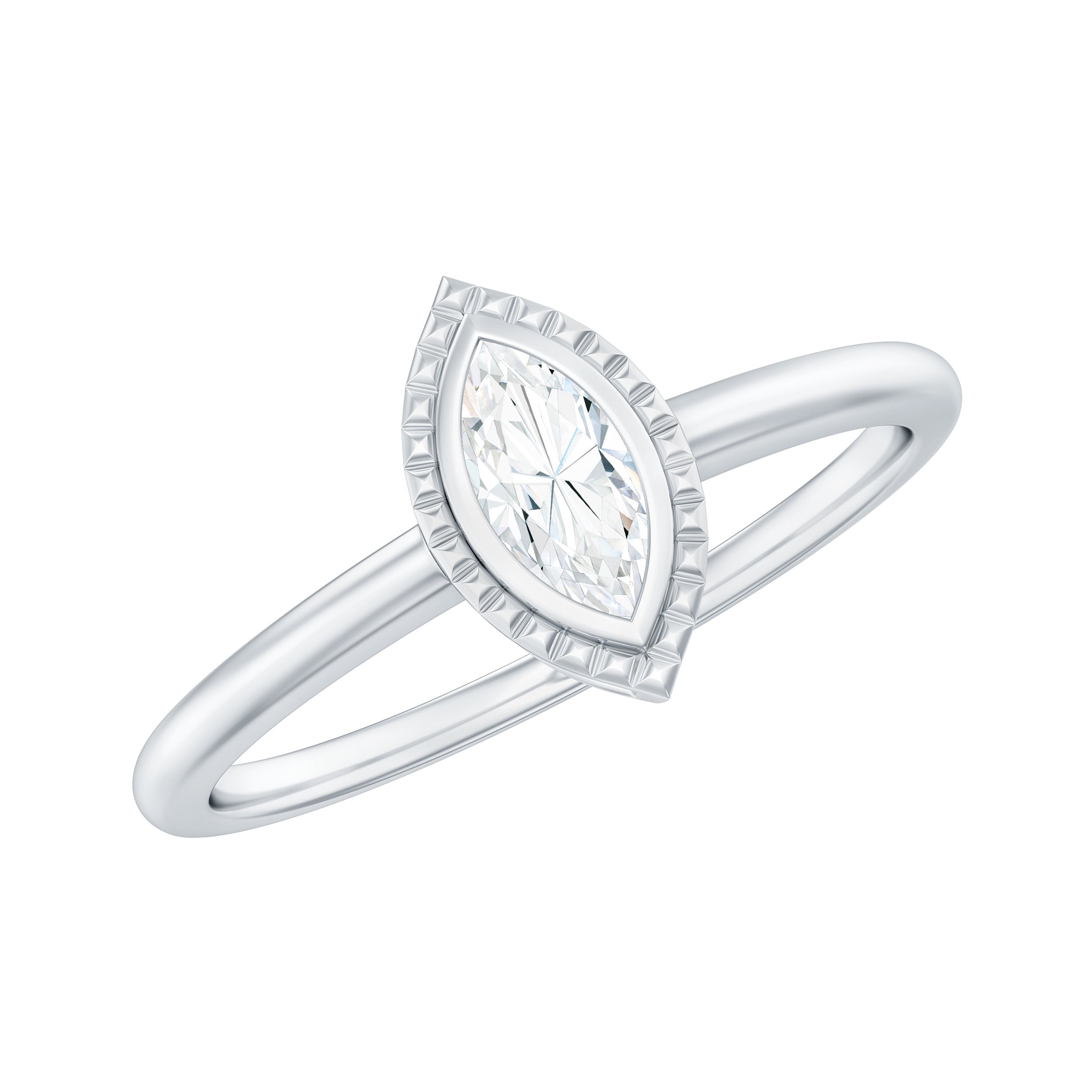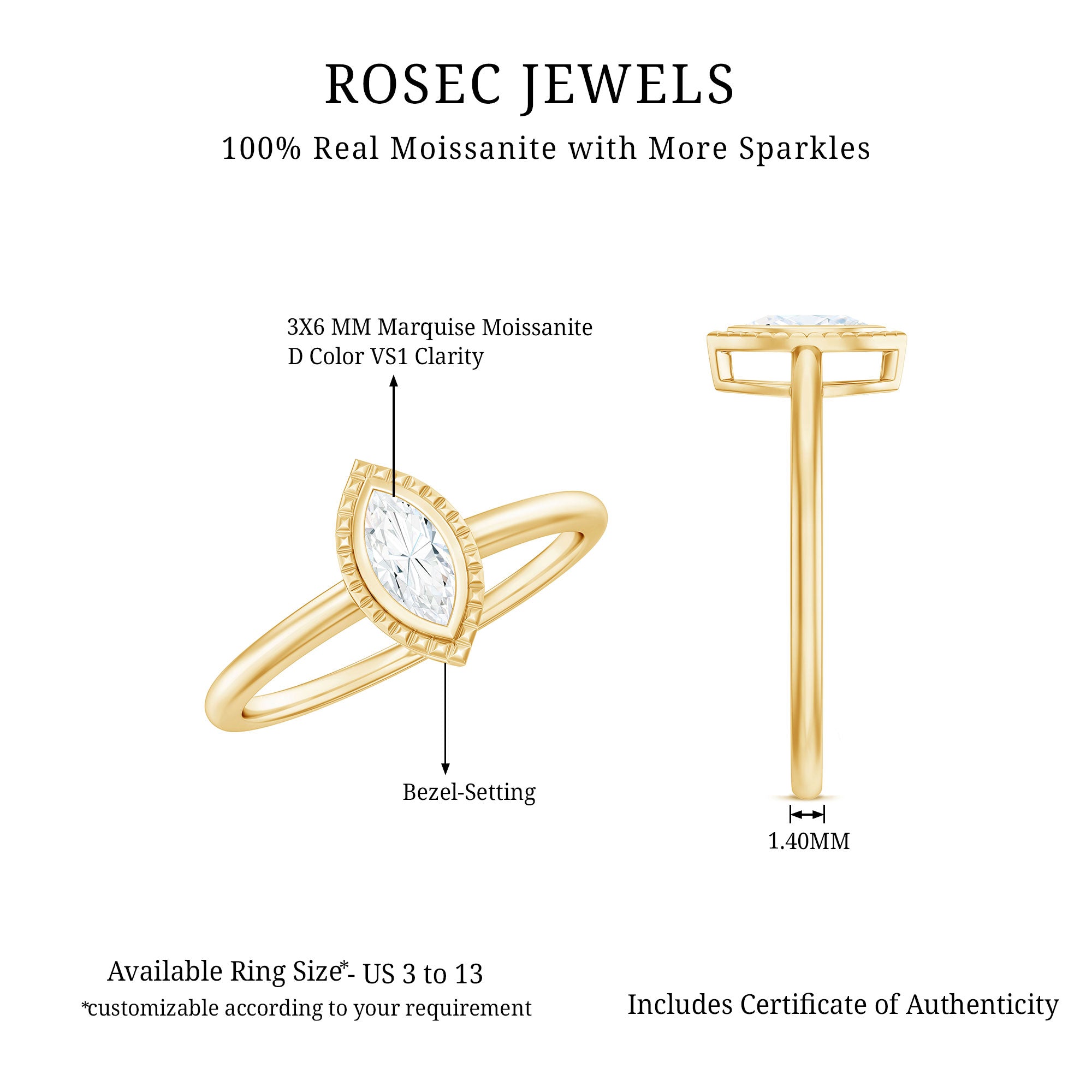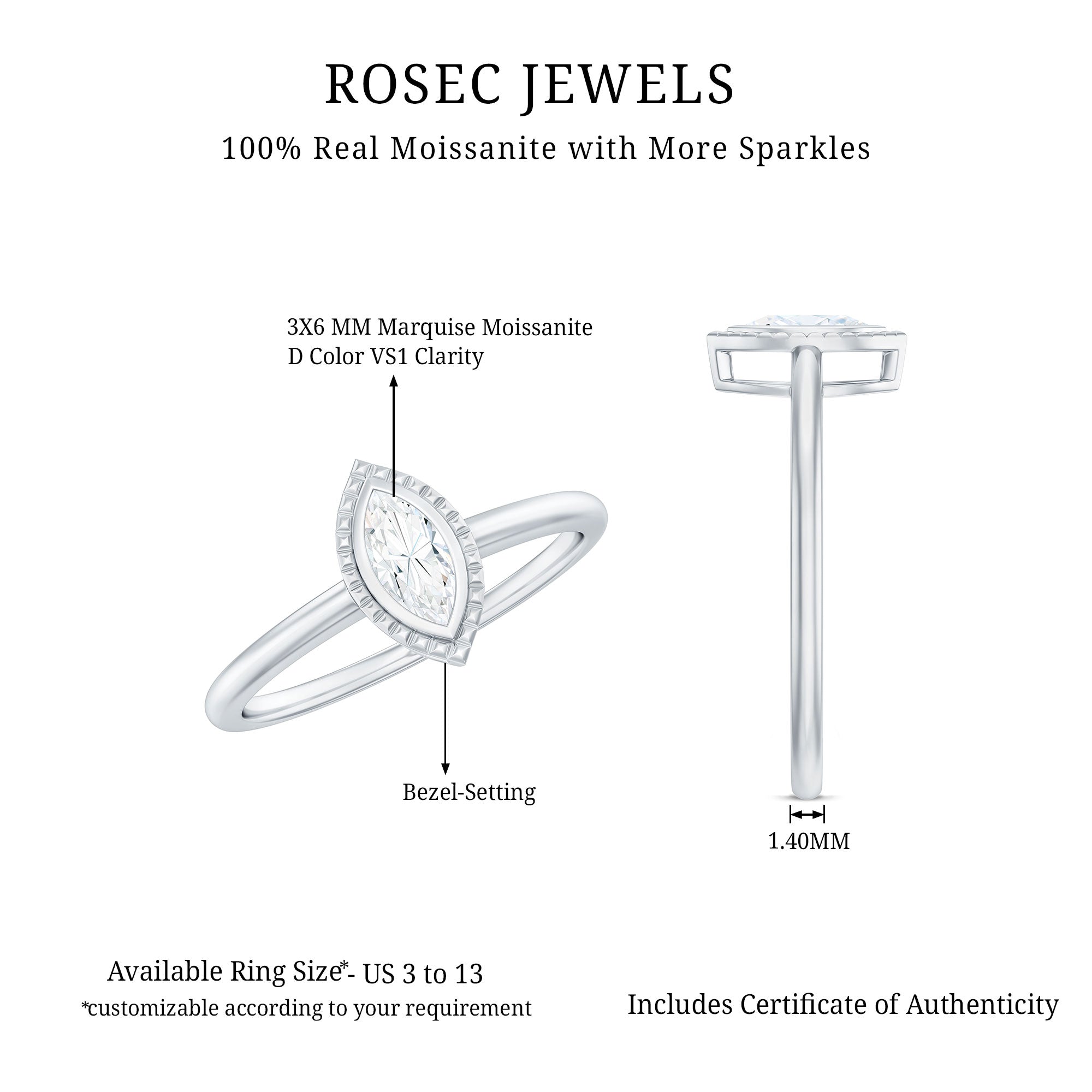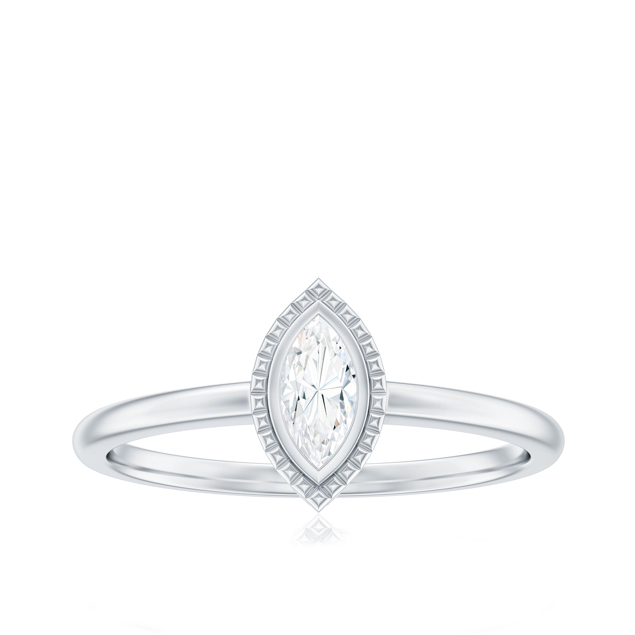 Immerse yourself in the realm of sustainable luxury with this stunning Marquise Engagement Ring featuring 3X6 mm marquise cut Moissanite at the center with D Color and VS1 Clarity, elegantly set in bezel setting surrounded with beaded design, which enhances the sparkle of the center moissanite stone. This item represents enduring elegance, highlighting the enchanting radiance of moissanite end while demonstrating a dedication to ethical standards. This elongated Moissanite Promise Ring is designed in the classic solitaire style, which is undoubtedly a favorite among women when it comes to jewelry. The Moissanite Solitaire Ring is available in a range of sizes to ensure a perfect fit. It is an affordable Ring Jewelry Gift option, as it sparkles like a Natural Diamond and comes in various precious metal choices to fit your budget. This Moissanite Engagement Ring is ideal for engagements, anniversaries, special occasions, or simply adding a touch of elegance to your everyday style.