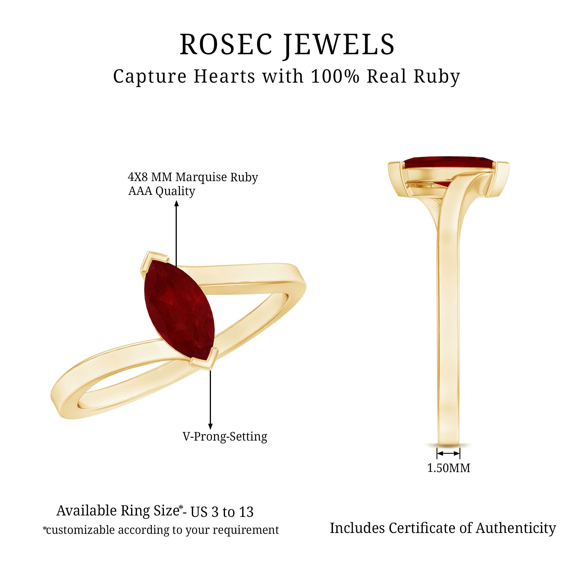 Elevate the glamour of your look with this beautiful Minimal Bypass Ring, featuring a Marquise Shape Ruby gemstone set as a center stone in a V Prong Setting in the bypass shank. This Minimal Ruby Ring is the perfect addition to any outfit. Make a lasting impression with this stunning piece.