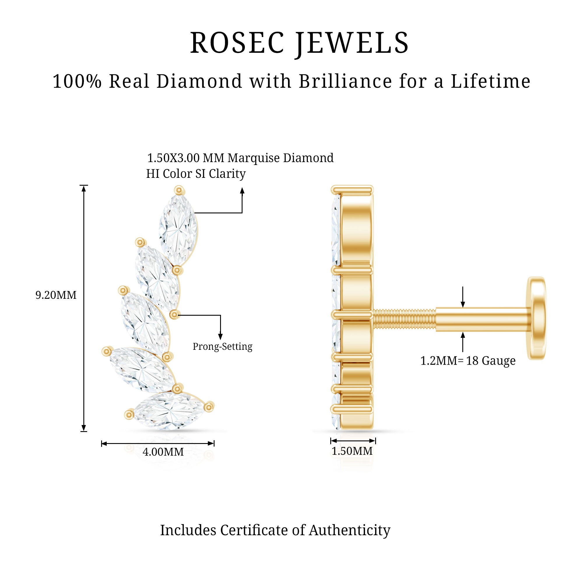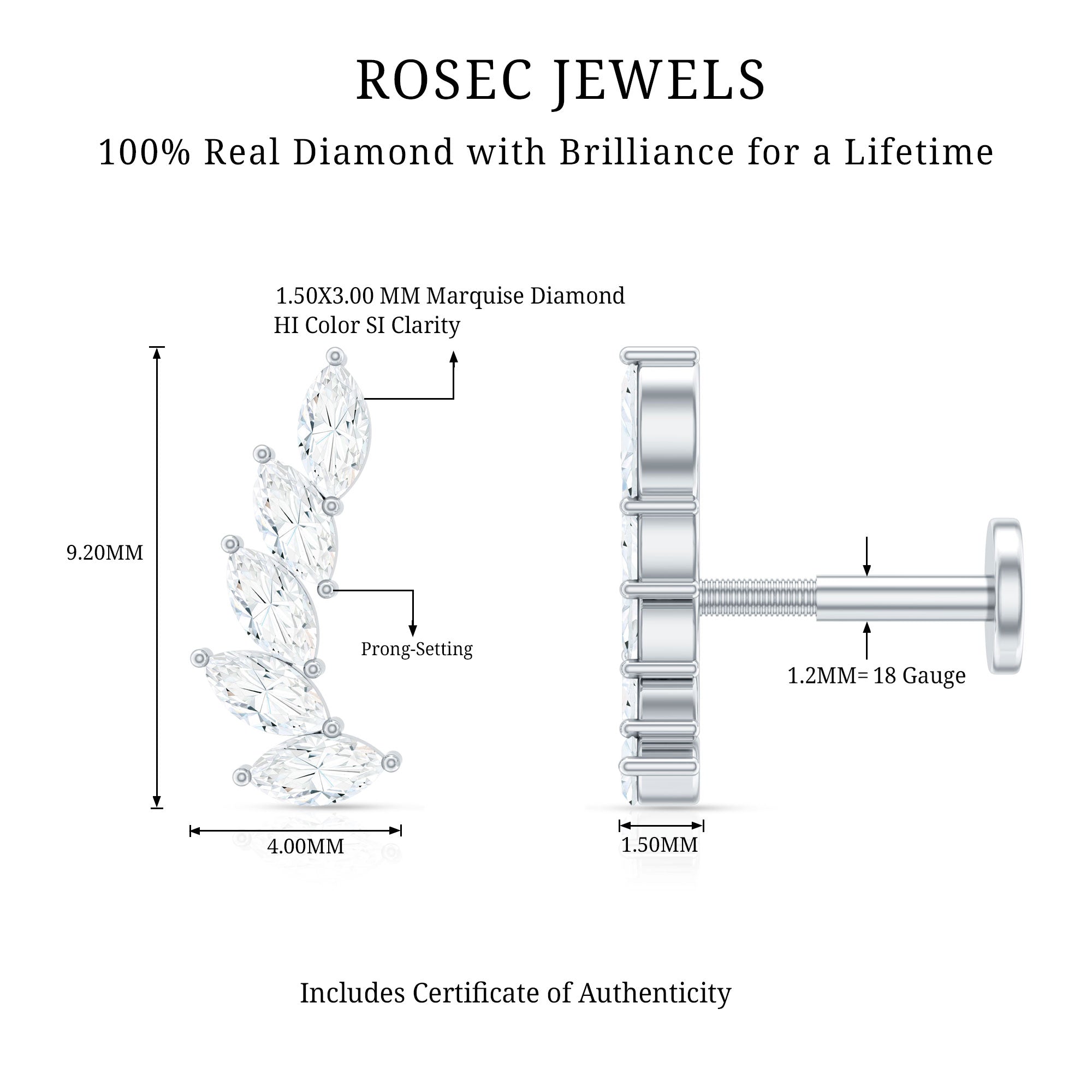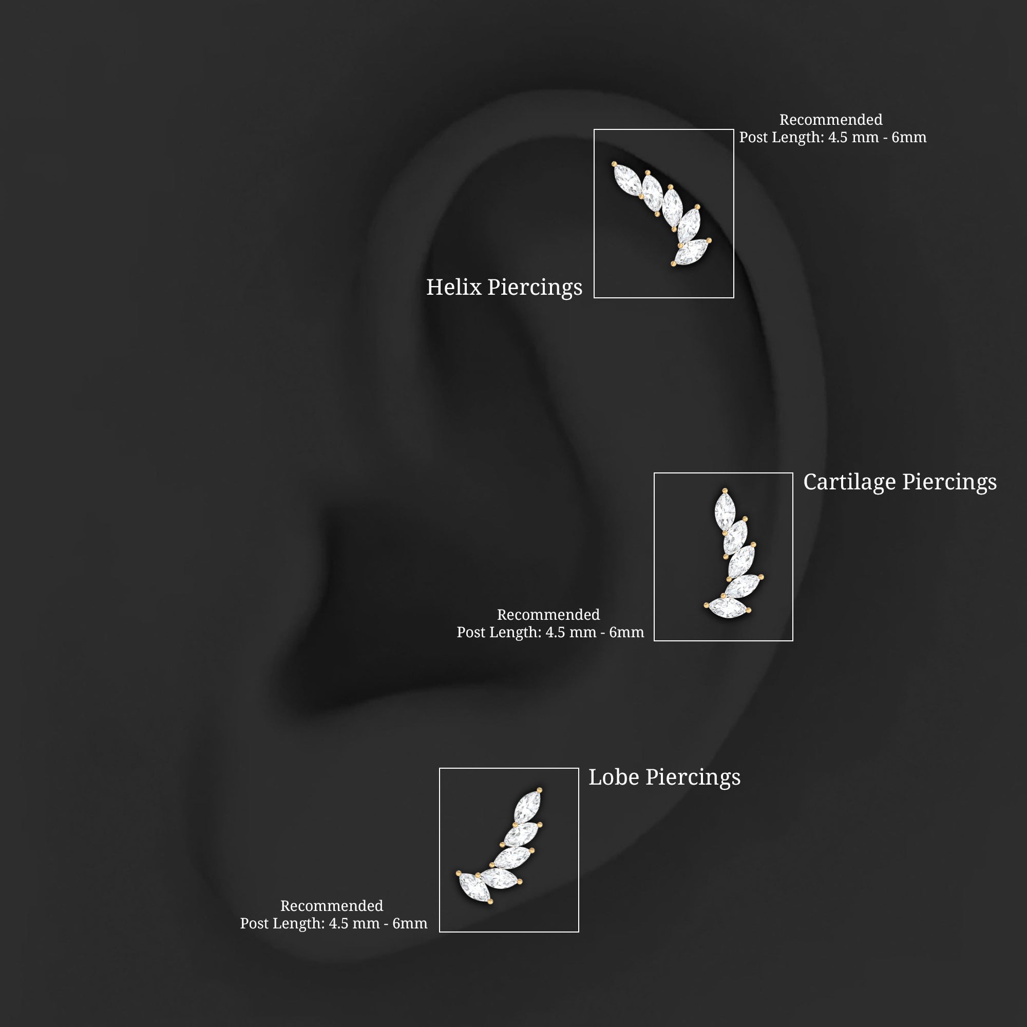 Inspired by a vine, this Diamond Crawler Earring showcases certified marquise cut diamonds that resemble sparkling leaves held in place by prong setting. This foliage-inspired diamond ear climber radiate romantic elegance with its delicate curves and subtle shimmer. You can slide this marquise diamond earring into your Helix, Cartilage, or Upper Lobe Piercings. It features a Flat Back Closure to ensure it stays secure. Prepare to elevate your ear game, as this angelic diamond helix earring is your golden ticket to divine glam. There are countless ways to style this Marquise Stud Earring, you can pair it with another stud, a hoop, or any bold statement jewelry piece! It also makes a perfect birthday gift, anniversary present, or romantic surprise, beautifully commemorating lifes most treasured moments. It comes in a variety of metal color options and is also available in different metal types. This Piercing Stud includes a certificate of authenticity for the gemstones and is presented in a premium storage box.
