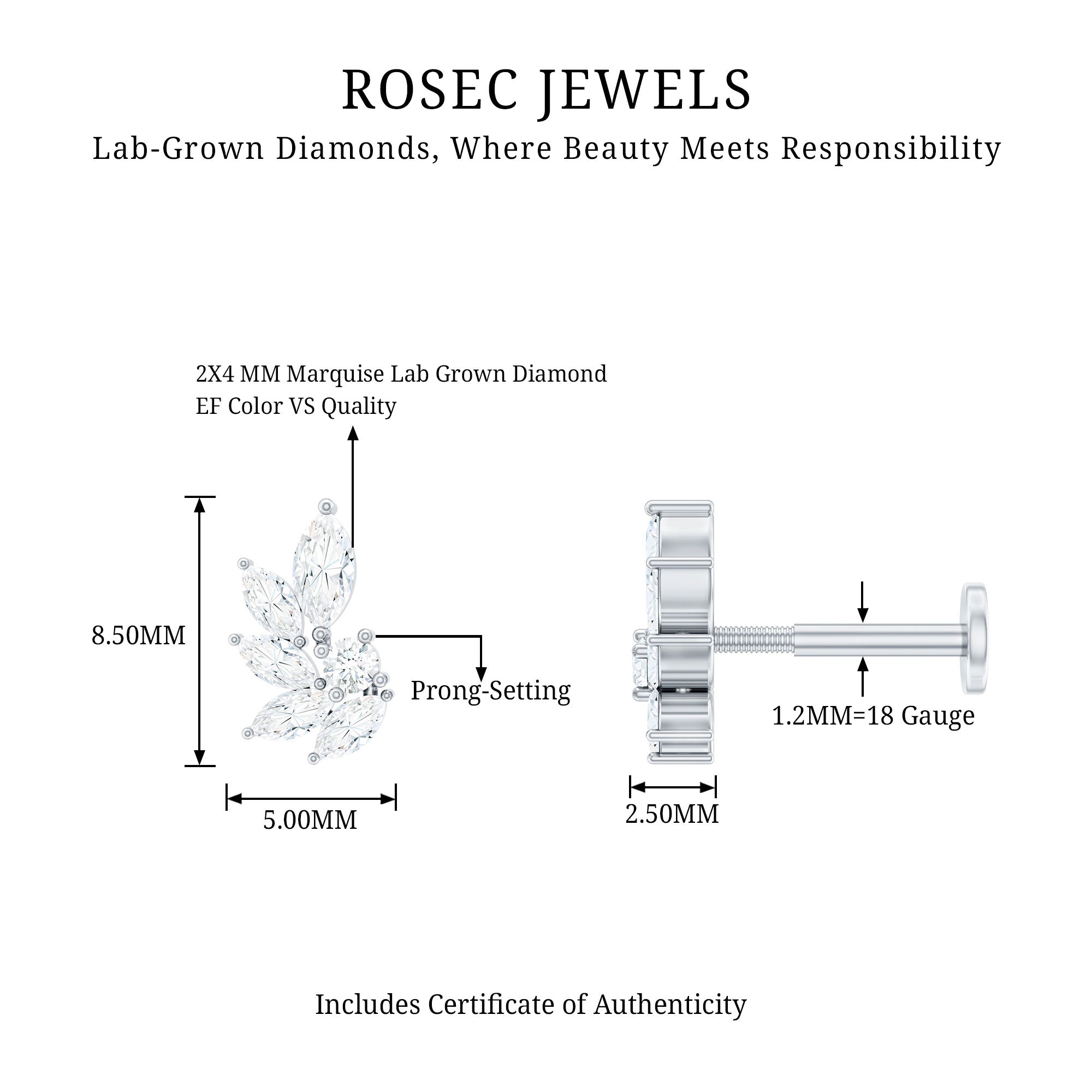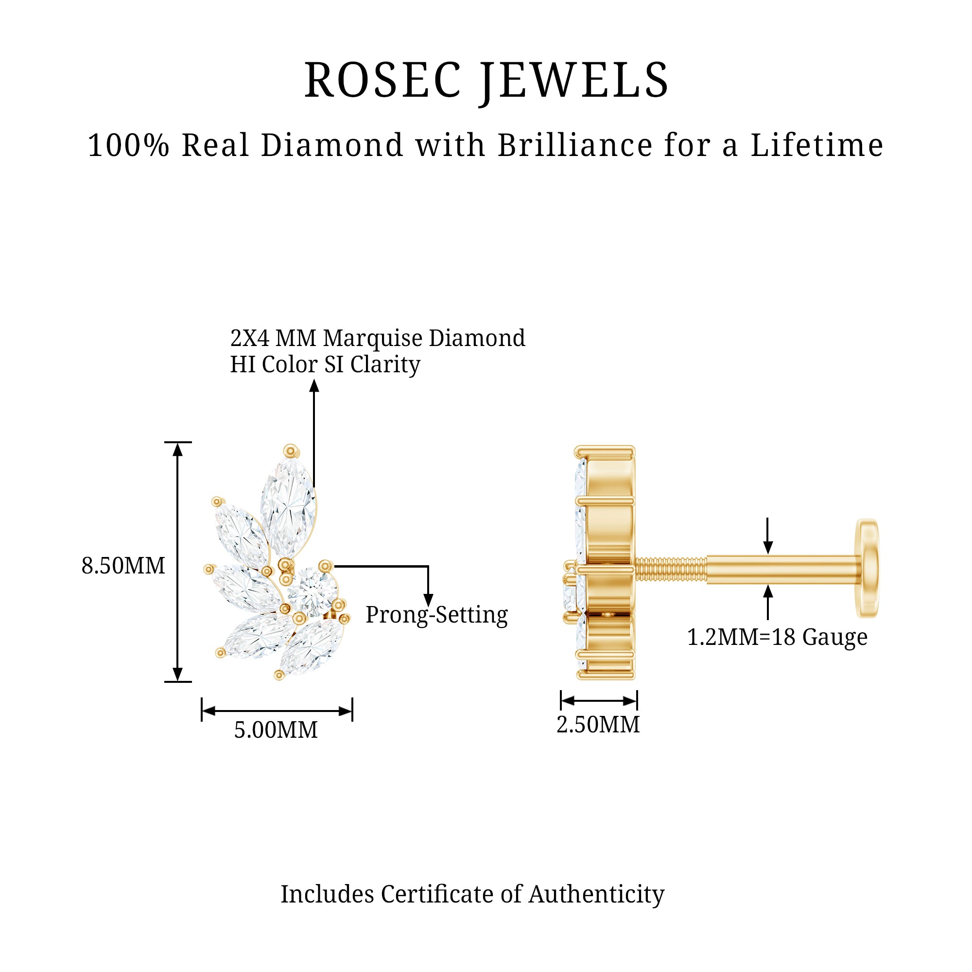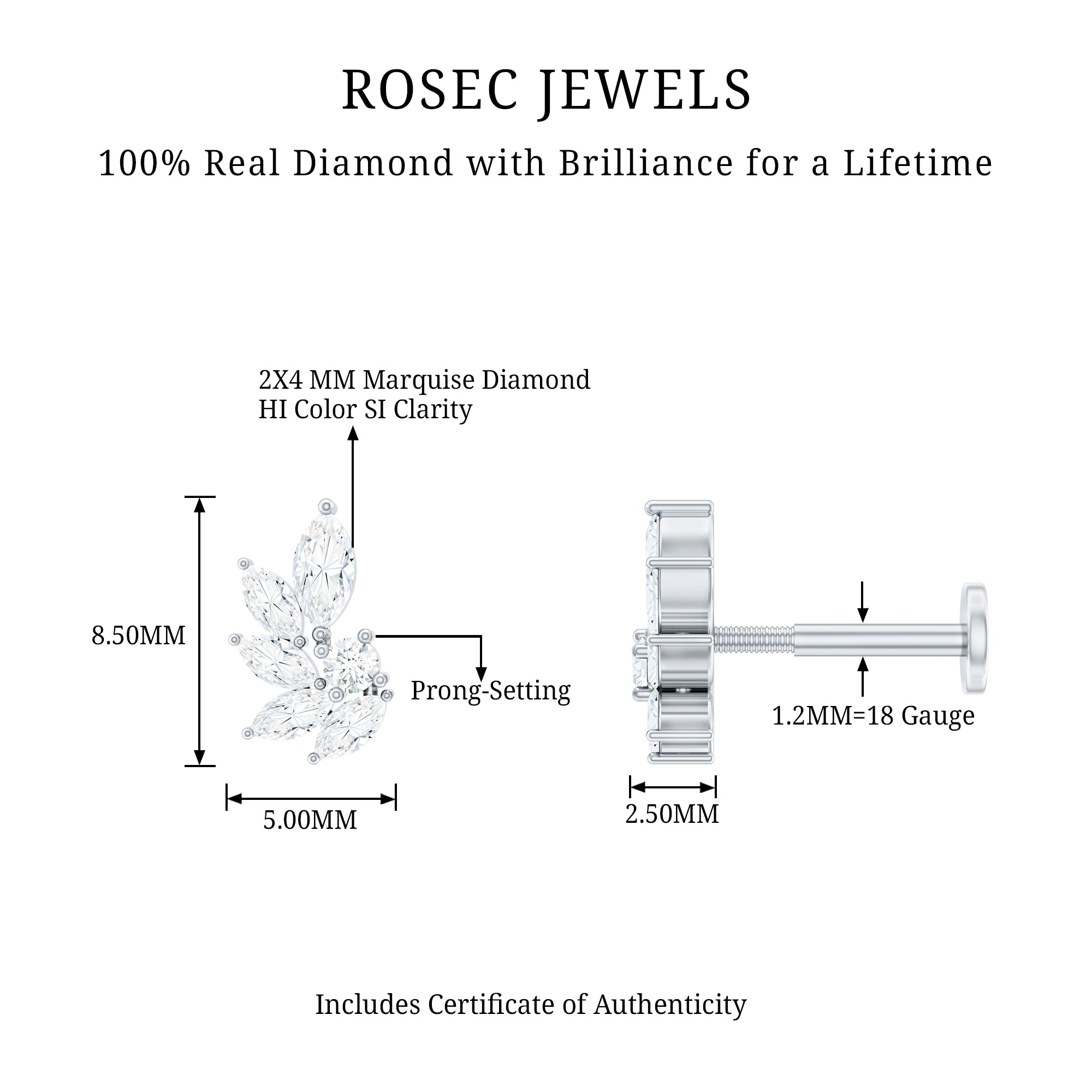 This clusters of leaves emit a divine glow. This piercing earring features marquise and round diamonds secured in prong set. Secures comfortably with a flat back closure.