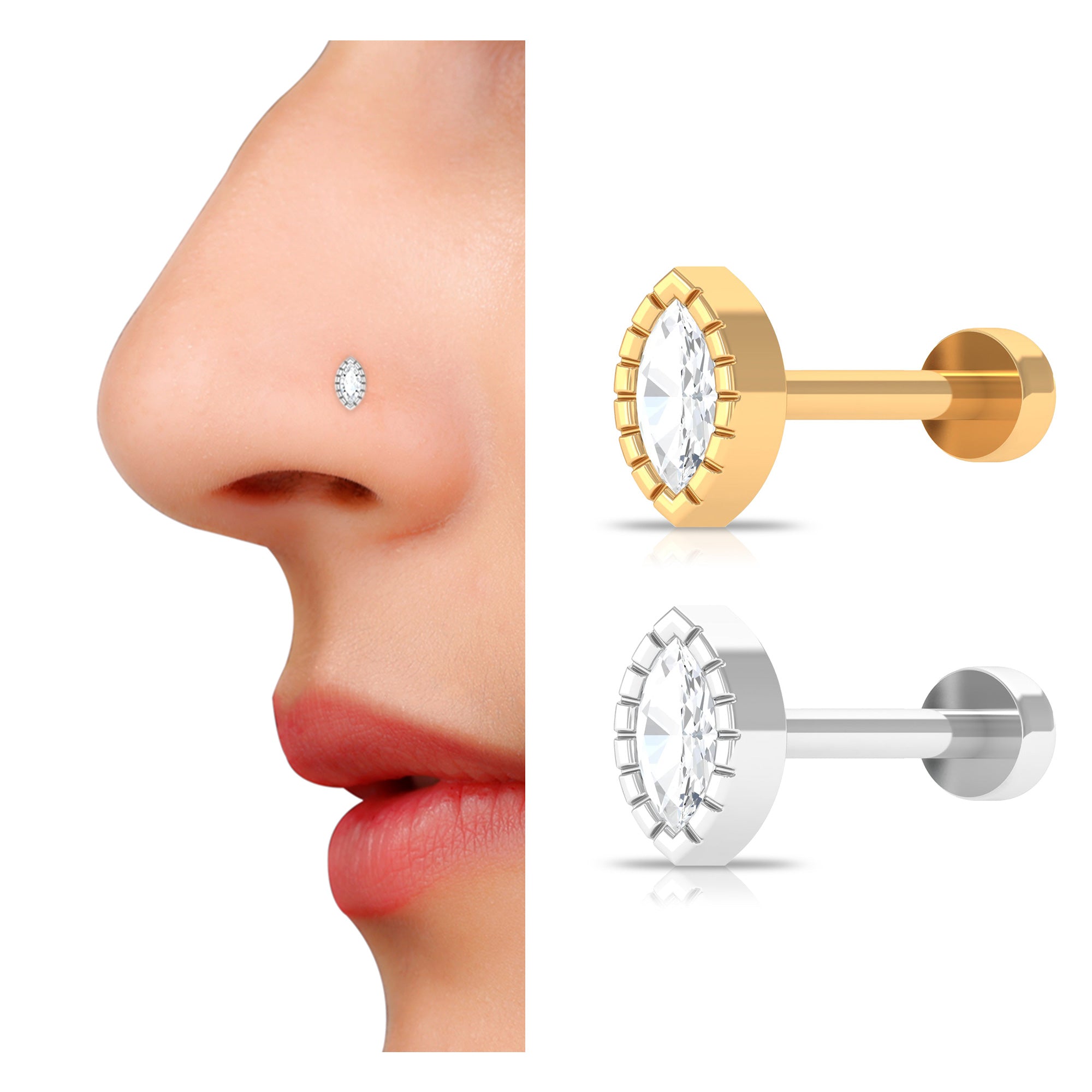 This stunning Diamond Simple Nose Stud features a Marquise Cut Diamond secured in Bezel Setting. This nose stud is crafted with Hallmarked Gold Metal, making it a timeless and valuable addition to any jewelry collection. Style this Diamond Nose Pin with your favorite outfits and stand out from the crowd.