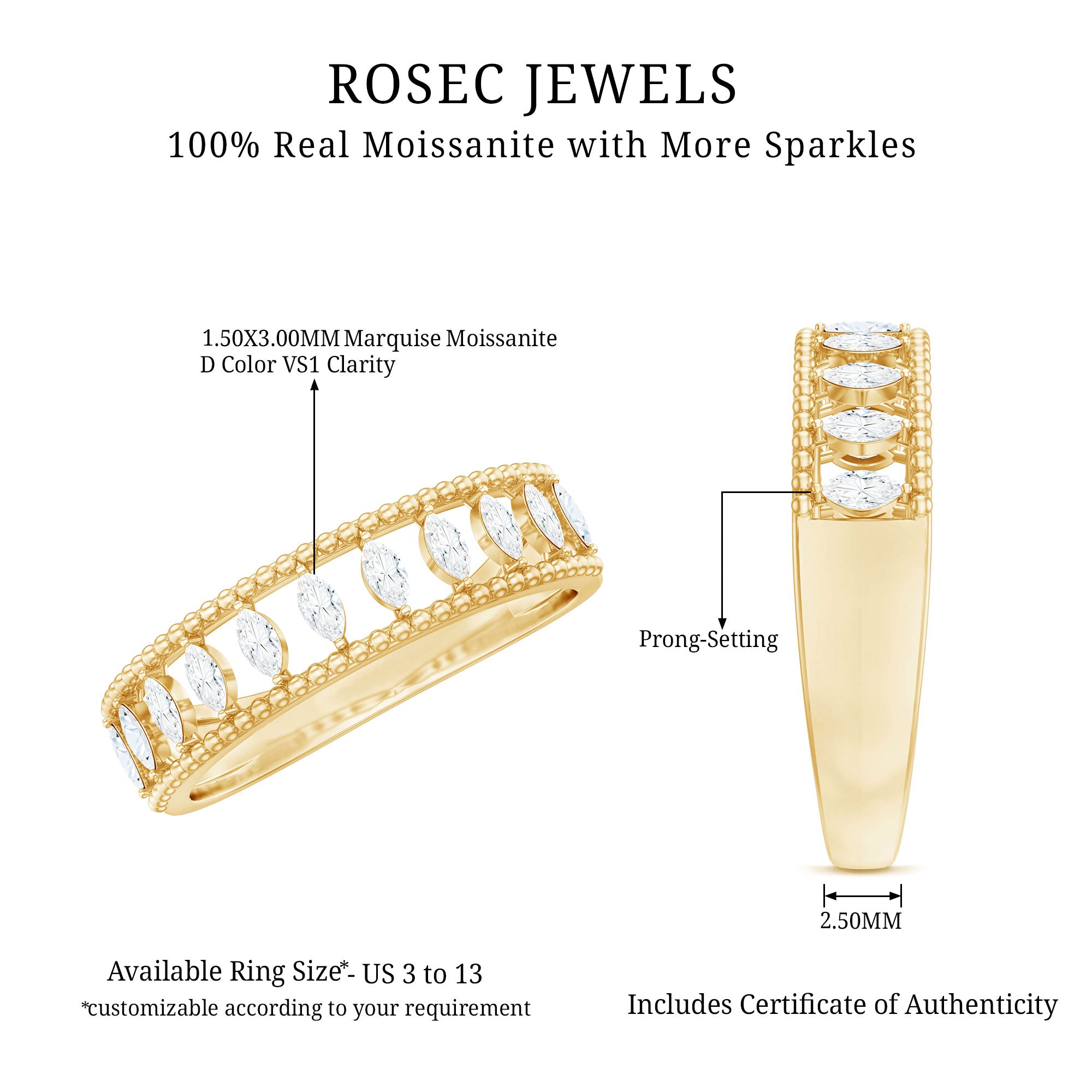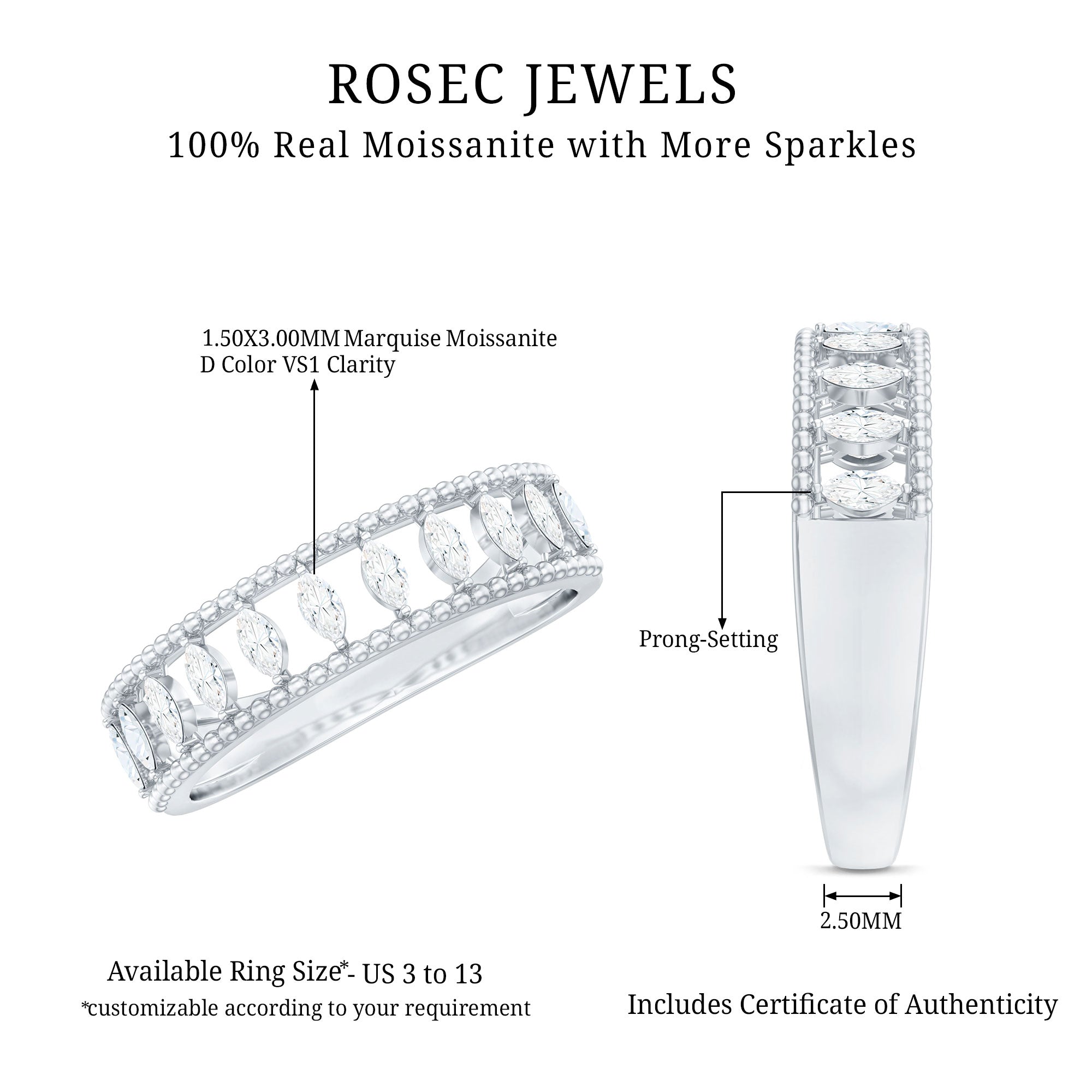 This marquise moissanite half eternity band ring is a celebration of love and eternal brilliance. The marquise moissanites are arranged in a half eternity band in 2 prong setting, creating a dazzling halo of sparkle. Their elongated shape adds a touch of elegance and sophistication, while their fiery brilliance is sure to turn heads. This ring is the perfect way to show your loved one how much you care. It is a symbol of your eternal love and commitment, and it is sure to be cherished for years to come.
