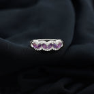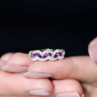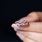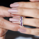 Celebrate your togetherness with an Amethyst Anniversary Ring and make her fall in love with you all over again. Exuding royal allure, a parade of Marquise Shape Amethyst adorns it half way through the band, held by Prong Setting. A glittering row of Round Shape Diamond accents surround it, gripping more attention towards this pretty purple gemstone. All the gemstones in this Amethyst Half Eternity Ring have been certified, making it worthy of being treasured for a lifetime, just like your love.