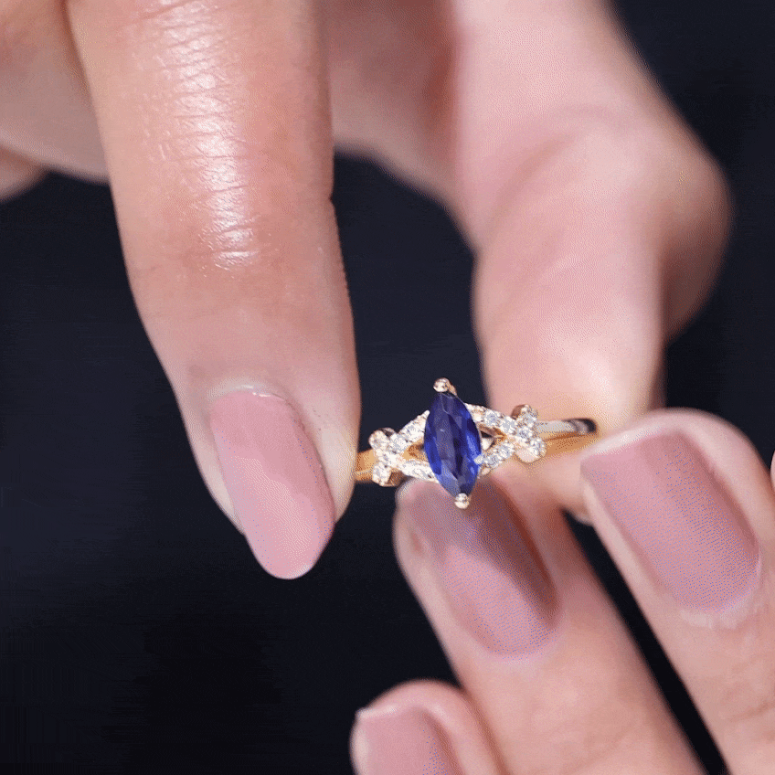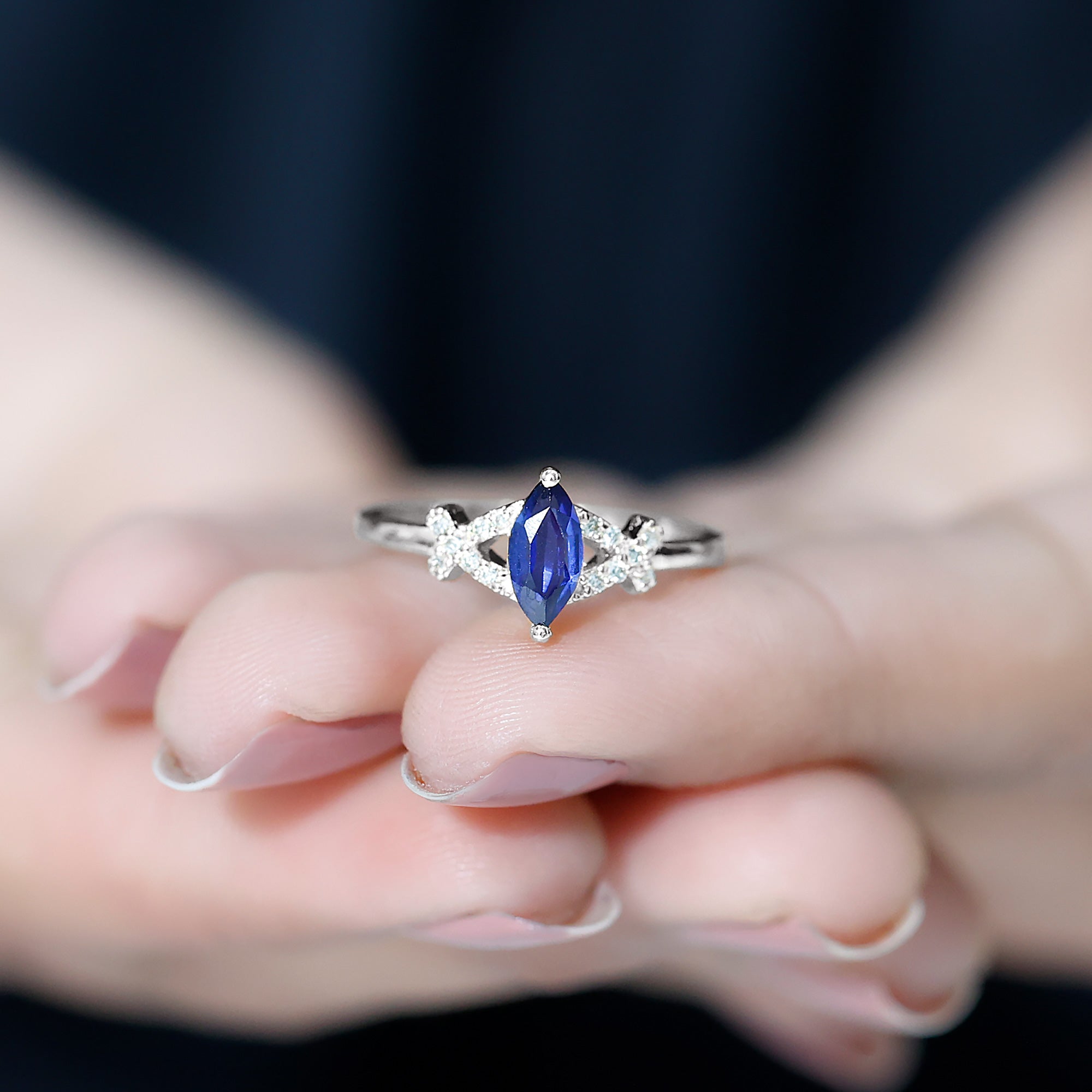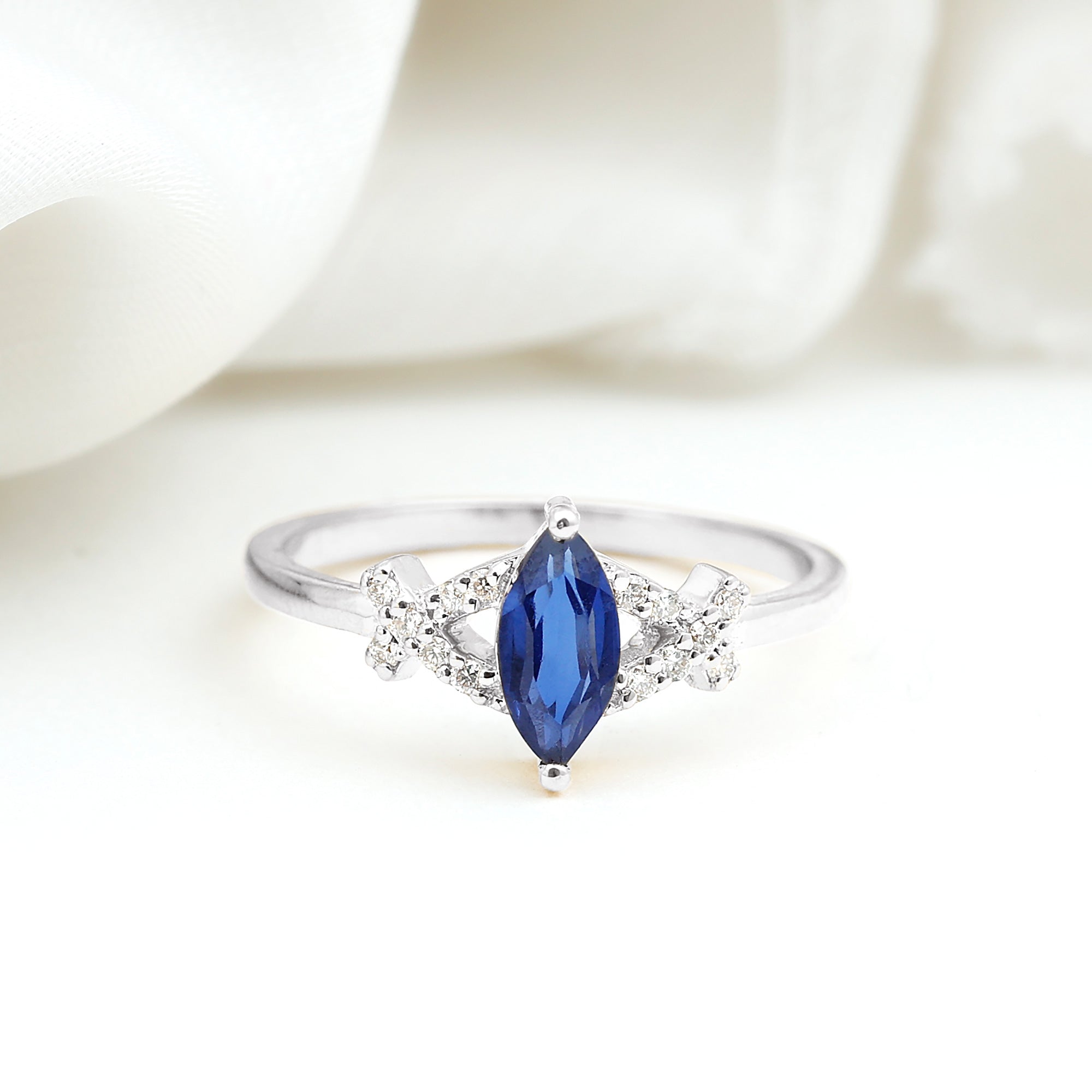 Explore the captivating allure of this Engagement Ring, featuring a marquise-cut created blue sapphire while the dainty diamonds sparkle on the unique shank. This stunning created blue sapphire ring captures the essence of elegance and sophistication, making it an ideal ring for an engagement, or a wedding day. Surprise your better half by gifting our sapphire ring on this wedding anniversary and make her fall for you again.
