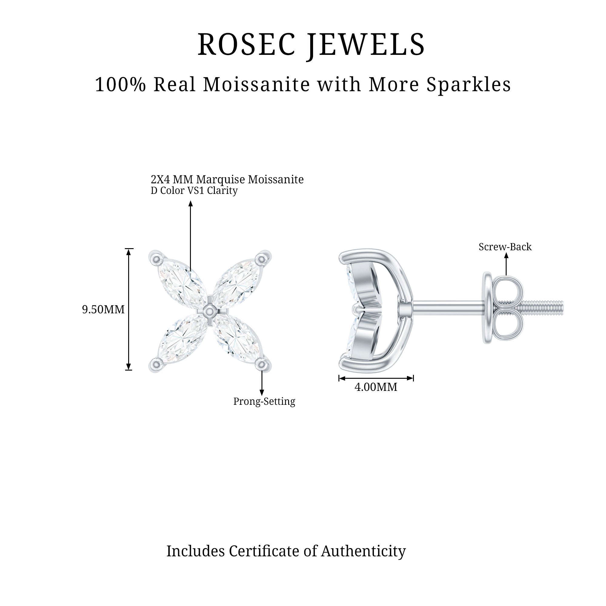 These stunning Moissanite Stud Earrings are a perfect fusion of natural beauty and delicate craftsmanship. The 4 brilliant cut Marquise Moissanite securely placed in Prong Setting formed in the shape of a flower gives a stunning touch to your look. These Floral Stud Earrings are crafted with the inspiration of timeless charm. With their radiant sparkle, floral design and timeless elegance these Moissanite Ear Studs capture brilliant moments. These beautiful pair of flower ear studs are designed to captivate with their intricate, yet effortlessly elegant design.