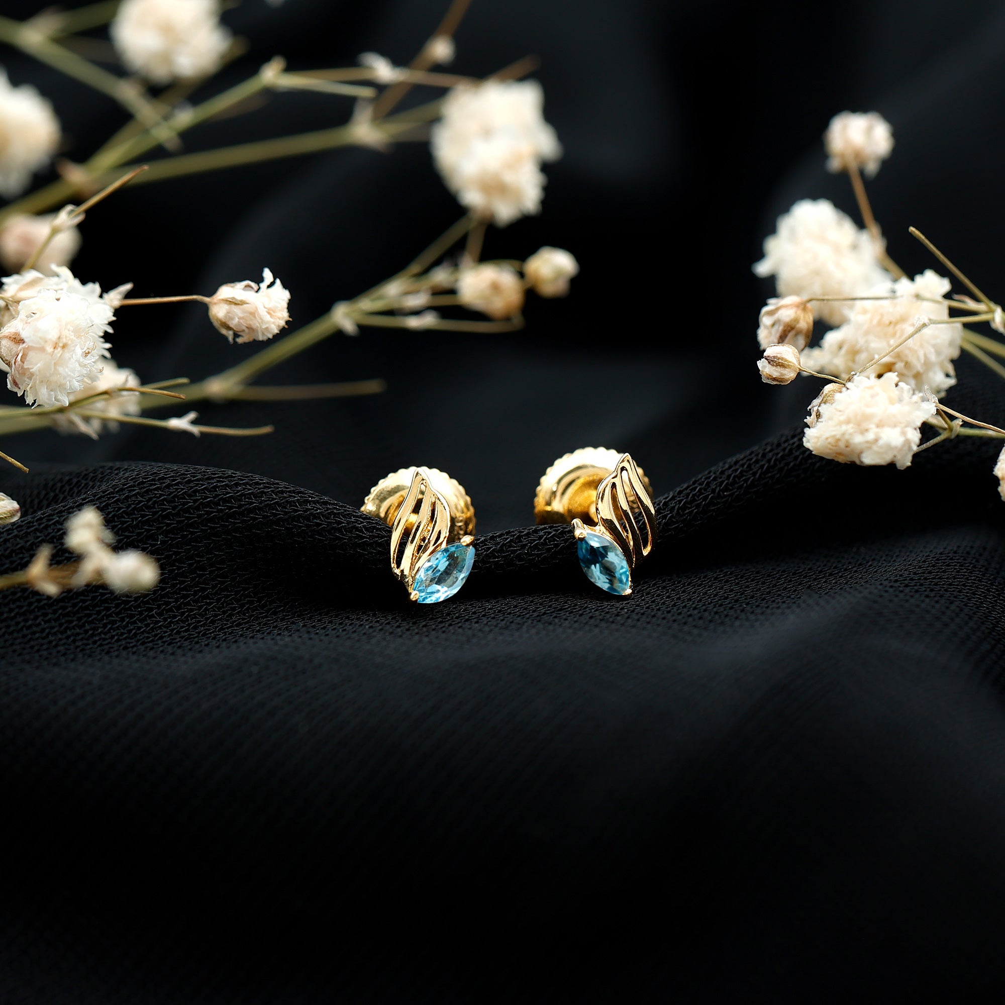 Nature meets elegance in these charming Leaf Earrings that blend delicate design with everyday wearability. Carefully crafted in 14k yellow gold plated silver, these Swiss Blue Topaz Earrings bring a refreshing twist to classic style. At the center of each stud sits a 2X4 MM marquise shaped Swiss Blue Topaz, nestled securely in prong setting. The marquise cut beautifully mimics the shape of a leaf, making these December Birthstone Earrings feel both artistic and organic. The leafy design adds a whimsical, nature-inspired element, making these Topaz Stud Earrings a lovely choice for those who appreciate subtle details that stand out. Whether you are a nature lover or just enjoy jewelry with a touch of the unexpected, this pair is sure to become a go-to favorite. These screw back studs are designed for both comfort and security, so you can wear them all day long with confidence. The AAA quality Swiss Blue Topaz stones bring just the right hint of sparkle, while the clean lines of the gold plated leaf keep the look polished and modern. Perfect for birthdays, milestones, or just a thoughtful treat for yourself, these Leaf Stud Earrings also make a sweet gift for someone who enjoys timeless pieces. Minimal yet full of personality, these Earrings are the kind of everyday luxury you will love wearing again and again.