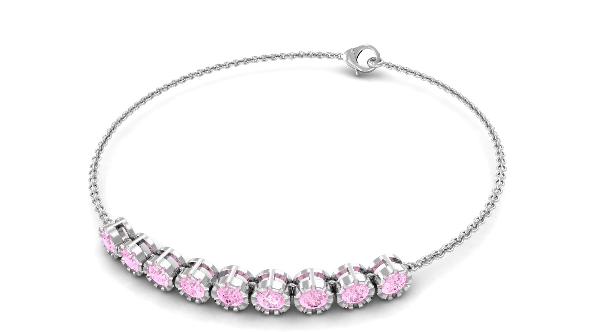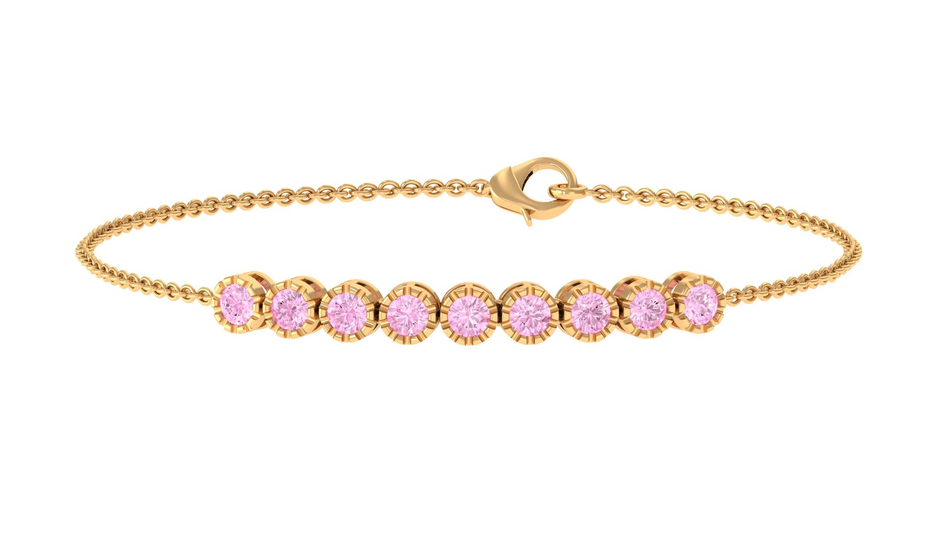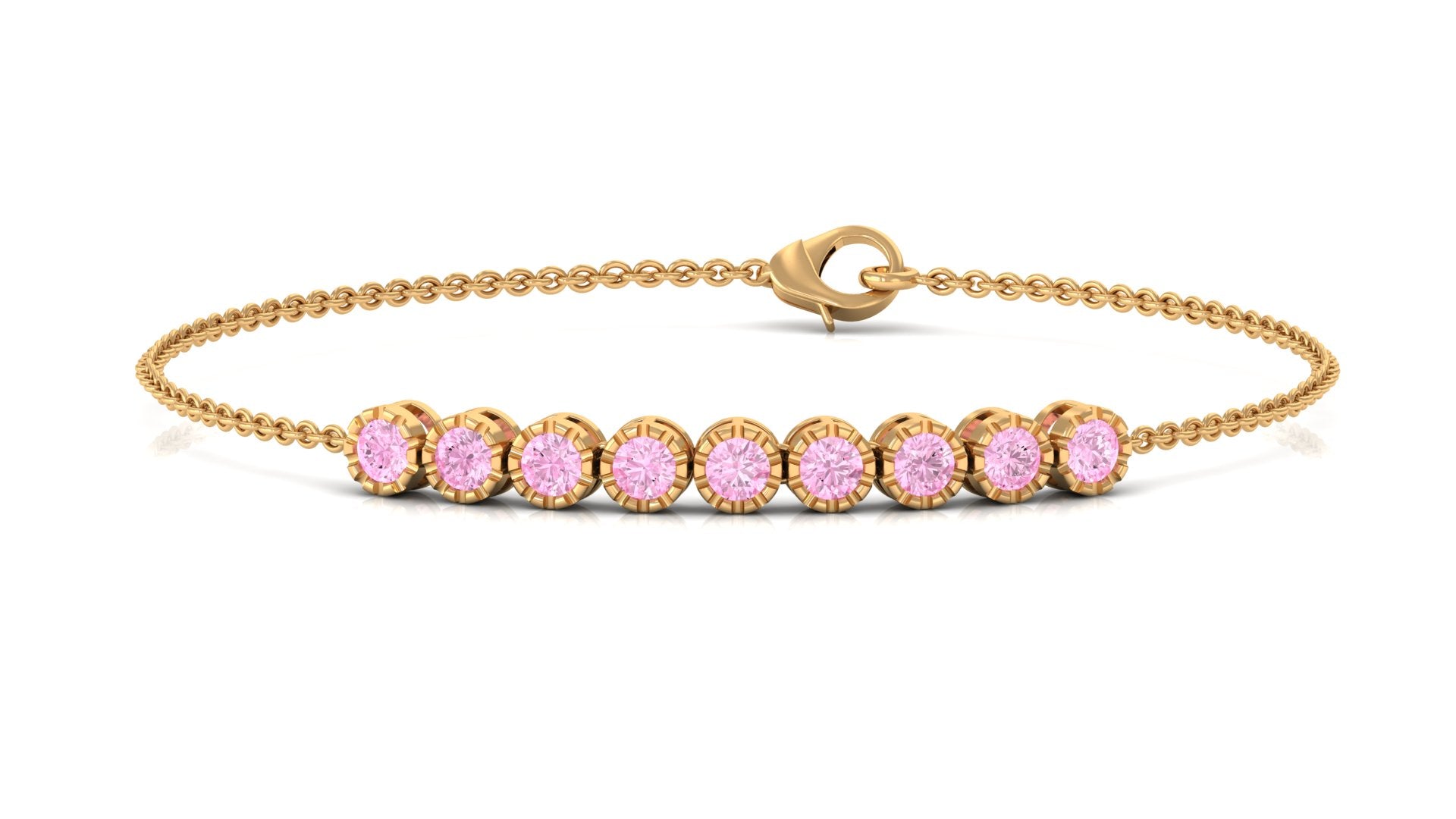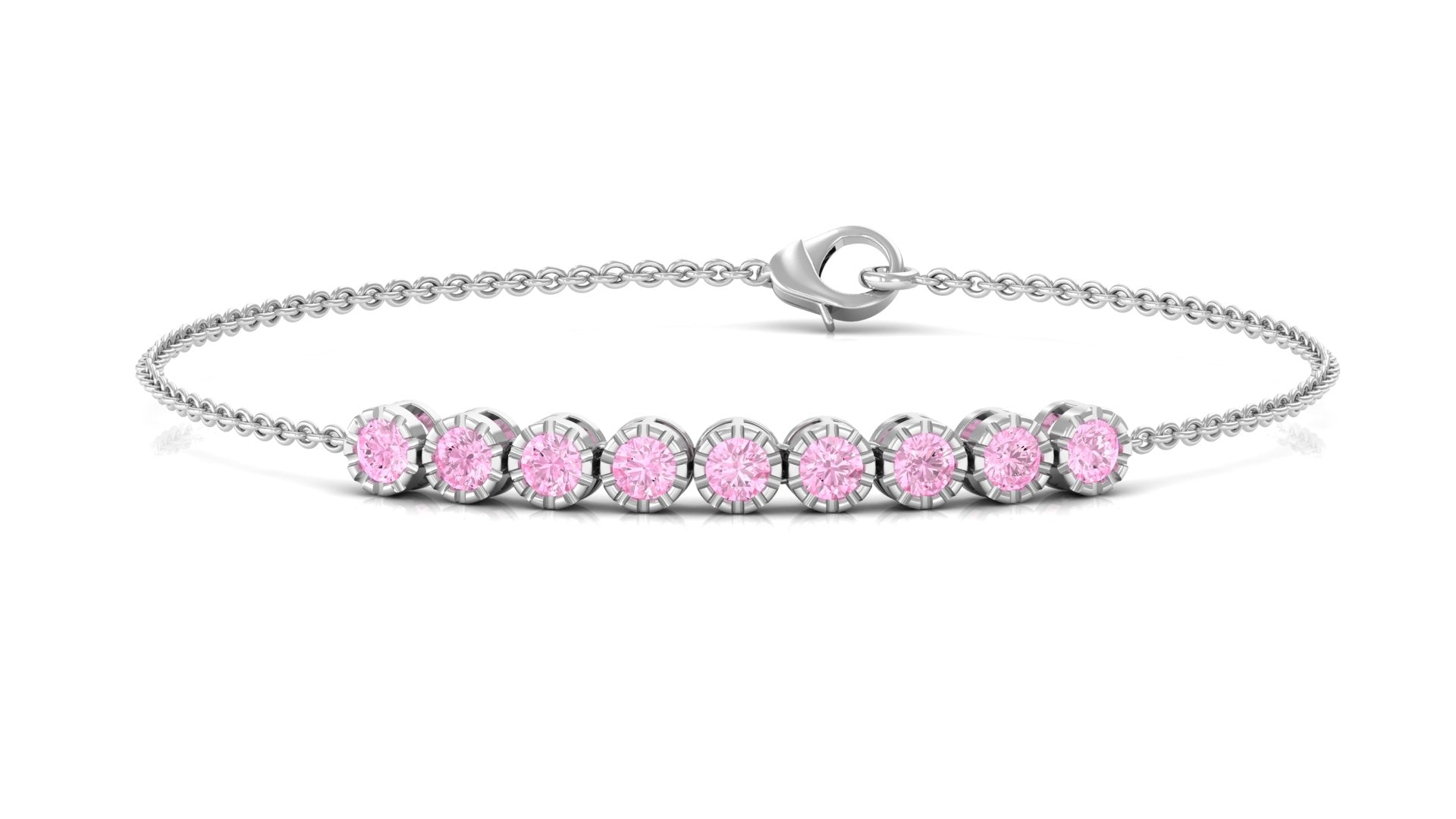 Our Nine Stone Bracelet is created with careful attention to detail. This chain bracelet showcases nine stunning round pink sapphires, each held securely in a fine milgrain bezel setting. The stones sparkle with an enchanting charm as they adorn your wrist, while the elaborate chain contributes an element of elegance. With AAA quality Pink Sapphire , it generates a remarkable light reflection that amplifies its brilliance. Presented in a signature jewelry box, this Pink Sapphire Bracelet serves as a considerate gift for various special occasions such as engagements, weddings, anniversaries, birthdays, or even as a romantic gesture. Whether you are honoring your fiancée, wife, girlfriend, or mother, this Sapphire Chain Bracelet leaves a significant and enduring impression. Meticulously crafted by talented artisans, it is more than just a piece of jewelry; it represents love and commitment, designed to be cherished for a lifetime.