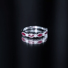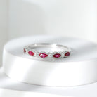 The modern appearance of this Ruby Eternity Ring makes a perfect classic wedding or anniversary band ring for the one close to your heart. Having a sparkling Marquise Shape Ruby in East West Style and Round Moissanite in a Half Eternity pattern gives a superb touch to this ring. A subtle design with exclusive sparkle is sure to steal your heart. Either a commitment, a promise or a birthday making a stunning present that intensifies the radiance and creates a unique reflection pattern. Graceful and timelessness this Ruby Anniversary Ring has a red brilliant color that has an aesthetic appearance and contemporary appeal. Truly a symbol of elegance this Ruby Moissanite Ring has a gorgeous delicate milgrain framing sit atop of a band.