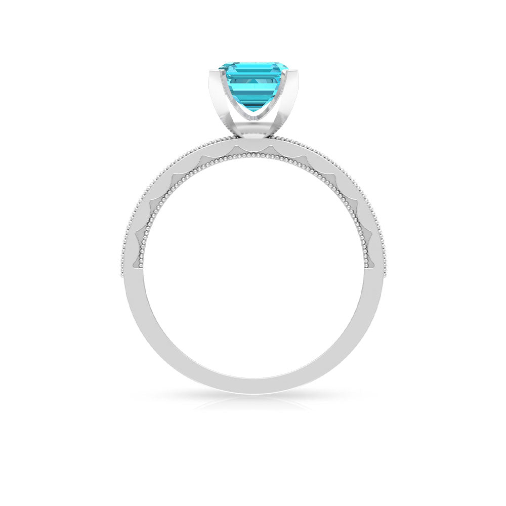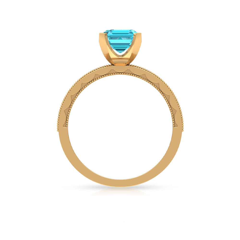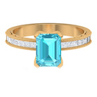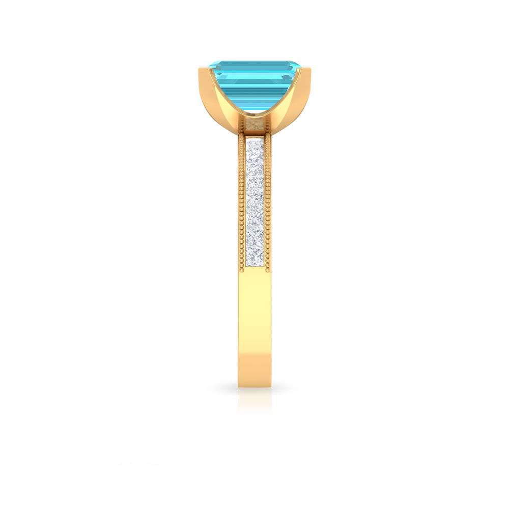 It is a Milgrain Ring for Women, set in Solid Gold featuring an Emerald Cut Swiss Blue Topaz as Solitaire embellished in Prong Setting with Princess Cut Diamond as Side Stone embellished in Pave Setting, only for you.