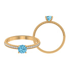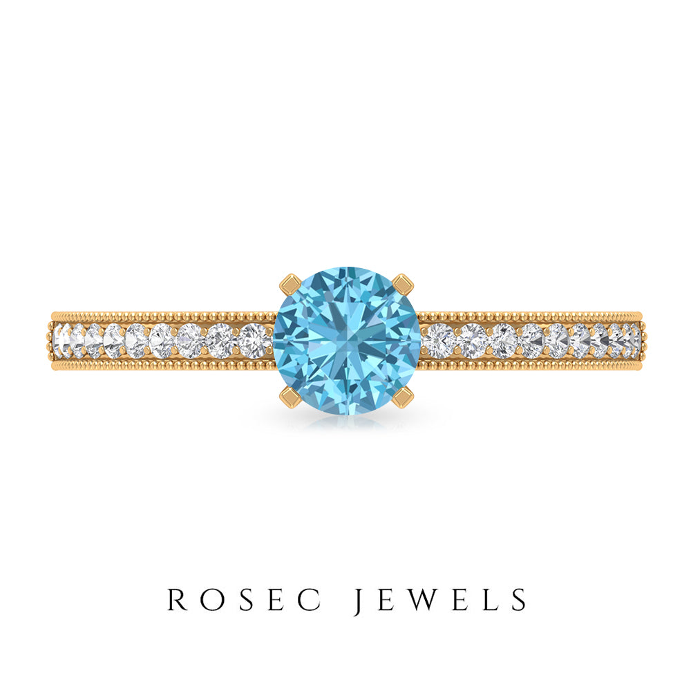 This Milgrain Engagement Ring is a Beautiful Gift for your Lady Love. The Solitaire Ring is embellished with 5 MM Round Shape Swiss Blue Topaz as Center Stone and Round Shaped Diamond as Side Stones.