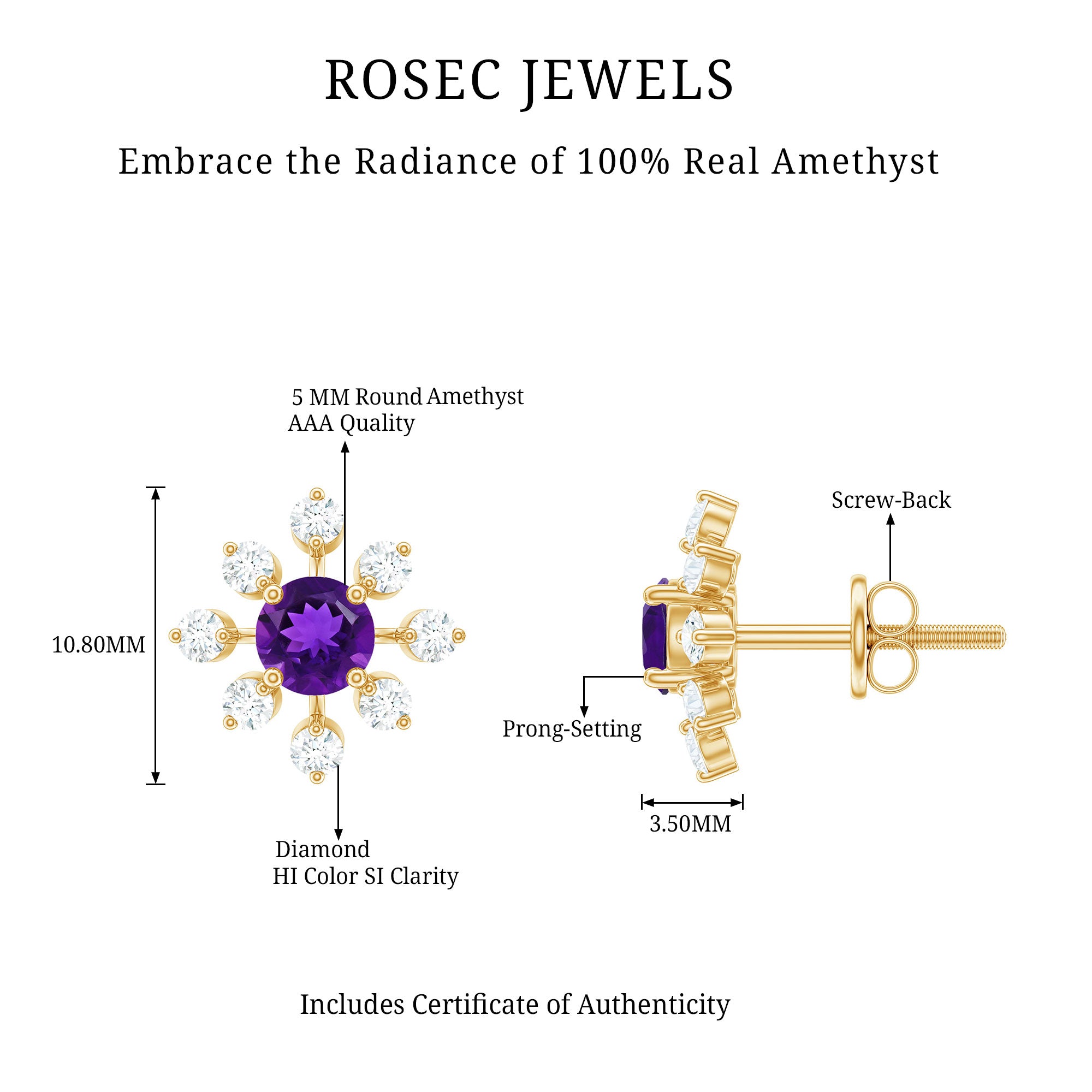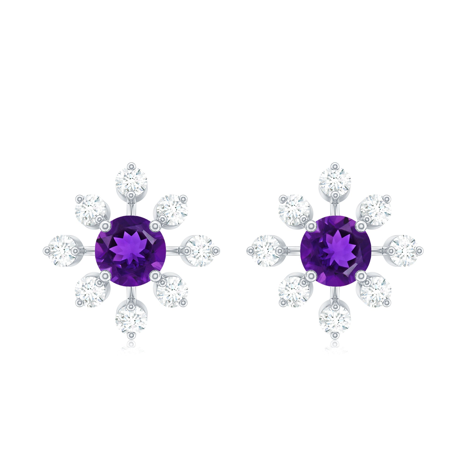 Add a flair of winter romance and timeless sparkle to your look with these enchanting Snowflake Earrings. At the center of each delicate snowflake is a mesmerizing 5 mm Round Shape Amethyst set in Prong Setting, glowing with a deep violet hue that captures the beauty of a winter night. Surrounding it, shimmering Diamond stones form an intricate snowflake pattern, a perfect symbol of uniqueness and purity. With their secure Screw Back Closure, these Amethyst Stud Earrings are designed for both comfort and elegance, making them ideal for every occasion. These stunning Amethyst Diamond Earrings are effortlessly romantic and endlessly versatile. Whether worn on any special occasion or as a meaningful Christmas gift to someone special, these Amethyst Studs exude a magical charm that never fades. Beautifully presented in an elegant jewelry box, these Amethyst Earrings for Women are ready to make hearts melt.