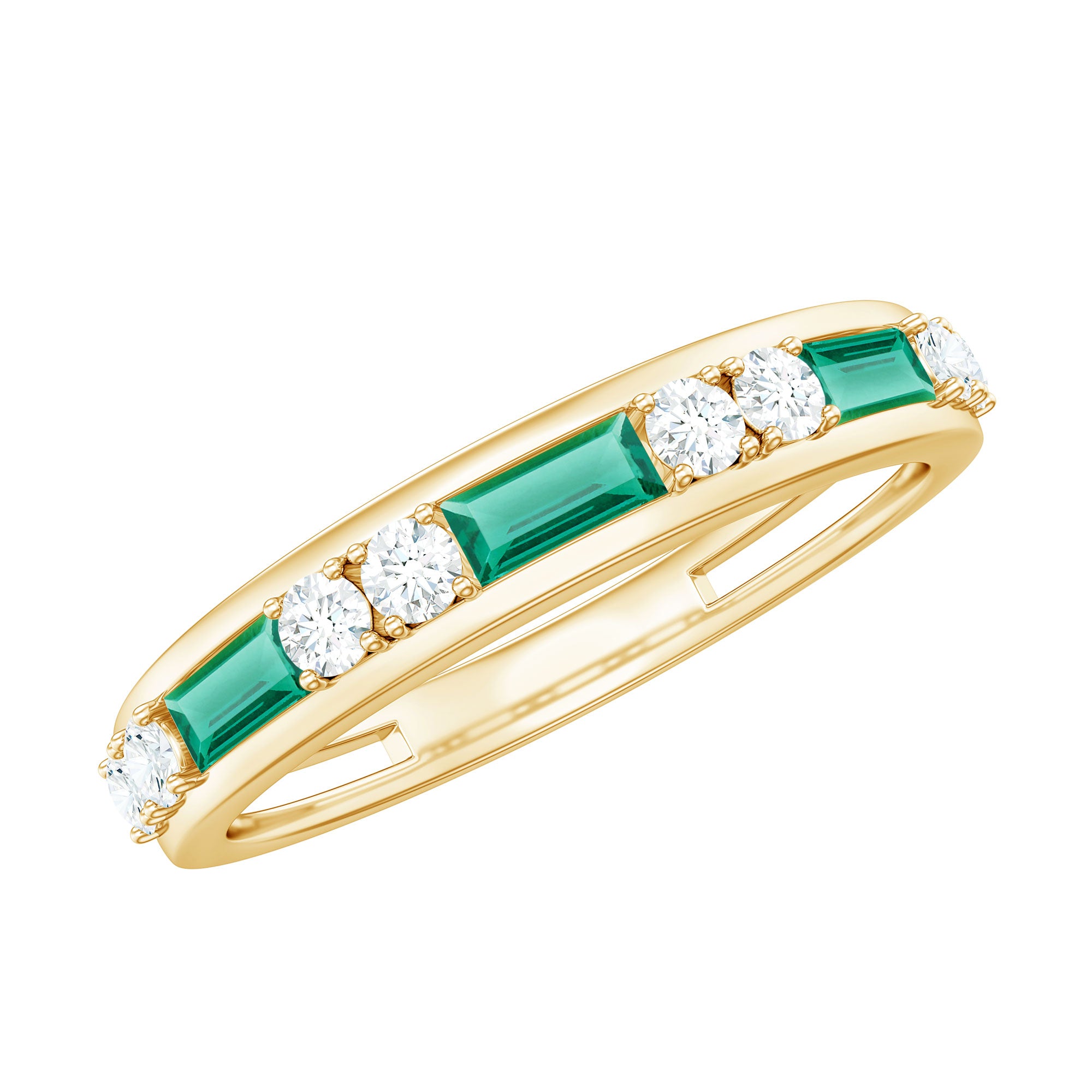 Elevate your everyday elegance with the Half Eternity Band, a fresh take on classic luxury. This thoughtfully designed band features a sleek row of horizontally placed Baguette Shape Lab Created Emerald and sparkling Round Diamond. The ring achieves the perfect balance of color and sparkle without overwhelming the senses. AAAA Quality Lab Created Emerald stones are ethically created with stunning clarity and vibrant color, giving you a statement of love and style. The half eternity design captures the spirit of ongoing commitment, while its subtle brilliance makes this Baguette Emerald Ring ideal for stacking or wearing alone for a chic, modern look. Whether it is an anniversary, a meaningful gift or a personal treat, this East West Baguette Wedding Band speaks volumes in its simplicity. Offered in various US standard comfort-fit ring sizes and delivered in an elegant signature jewelry box, this Lab Emerald Diamond Ring is perfect for those who appreciate refined beauty and timeless intention.
