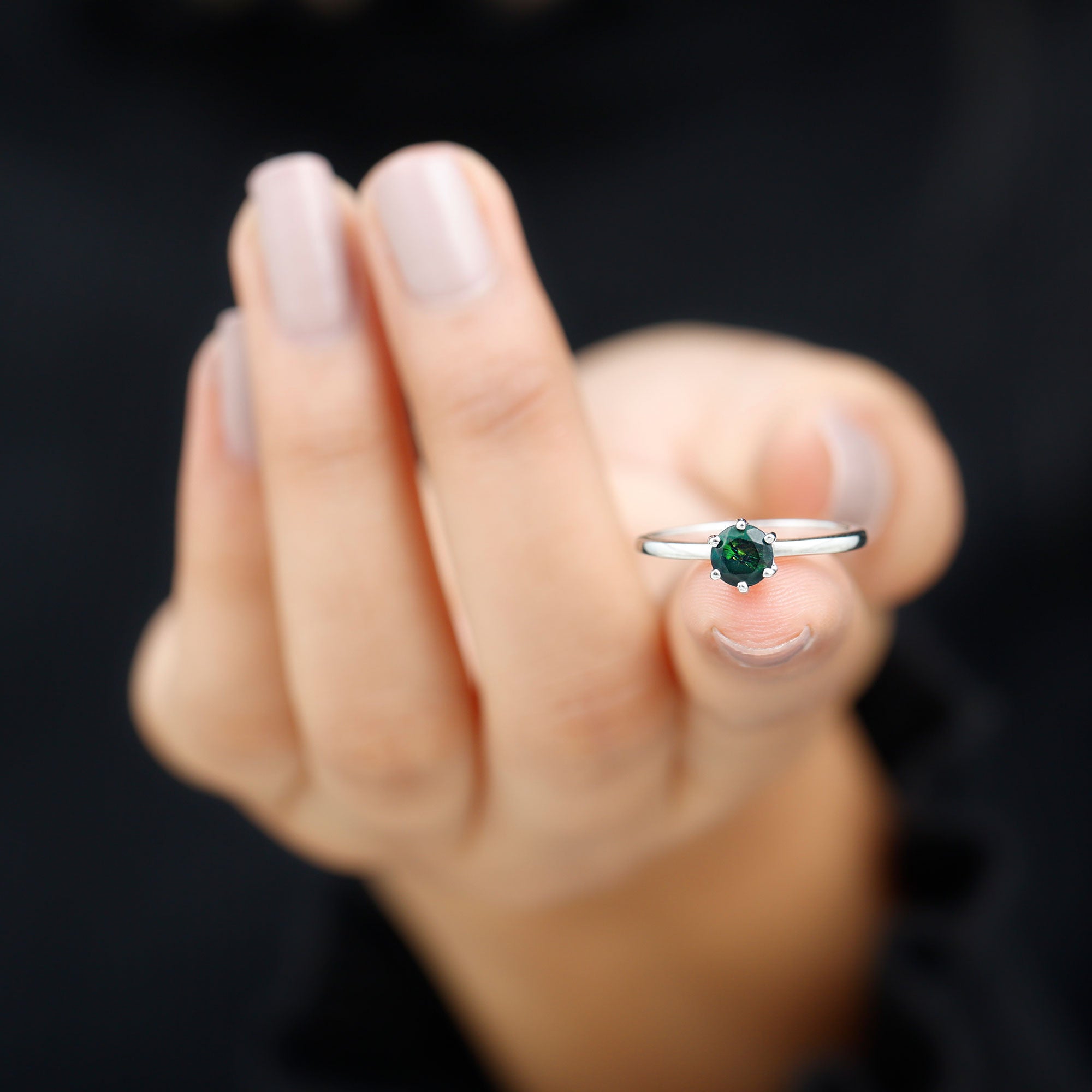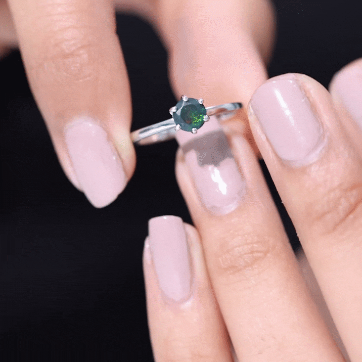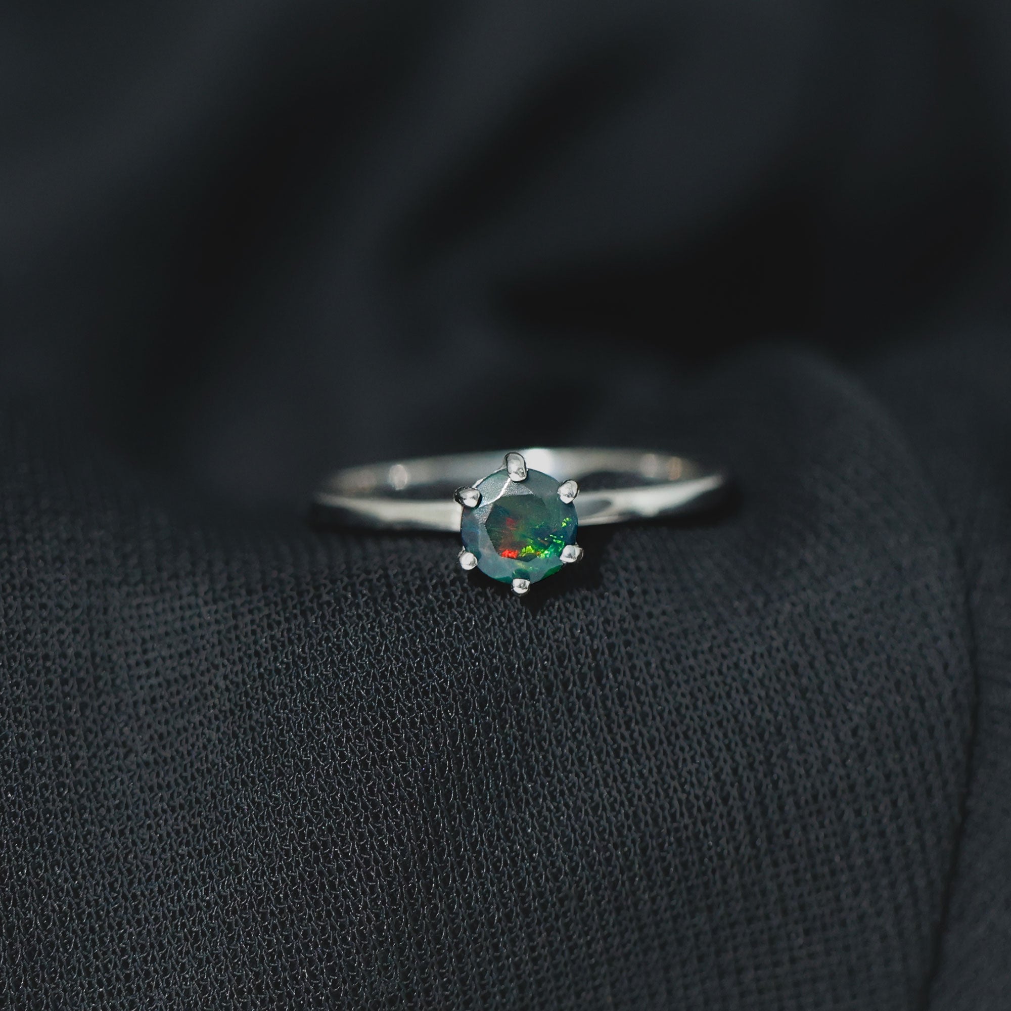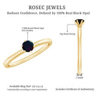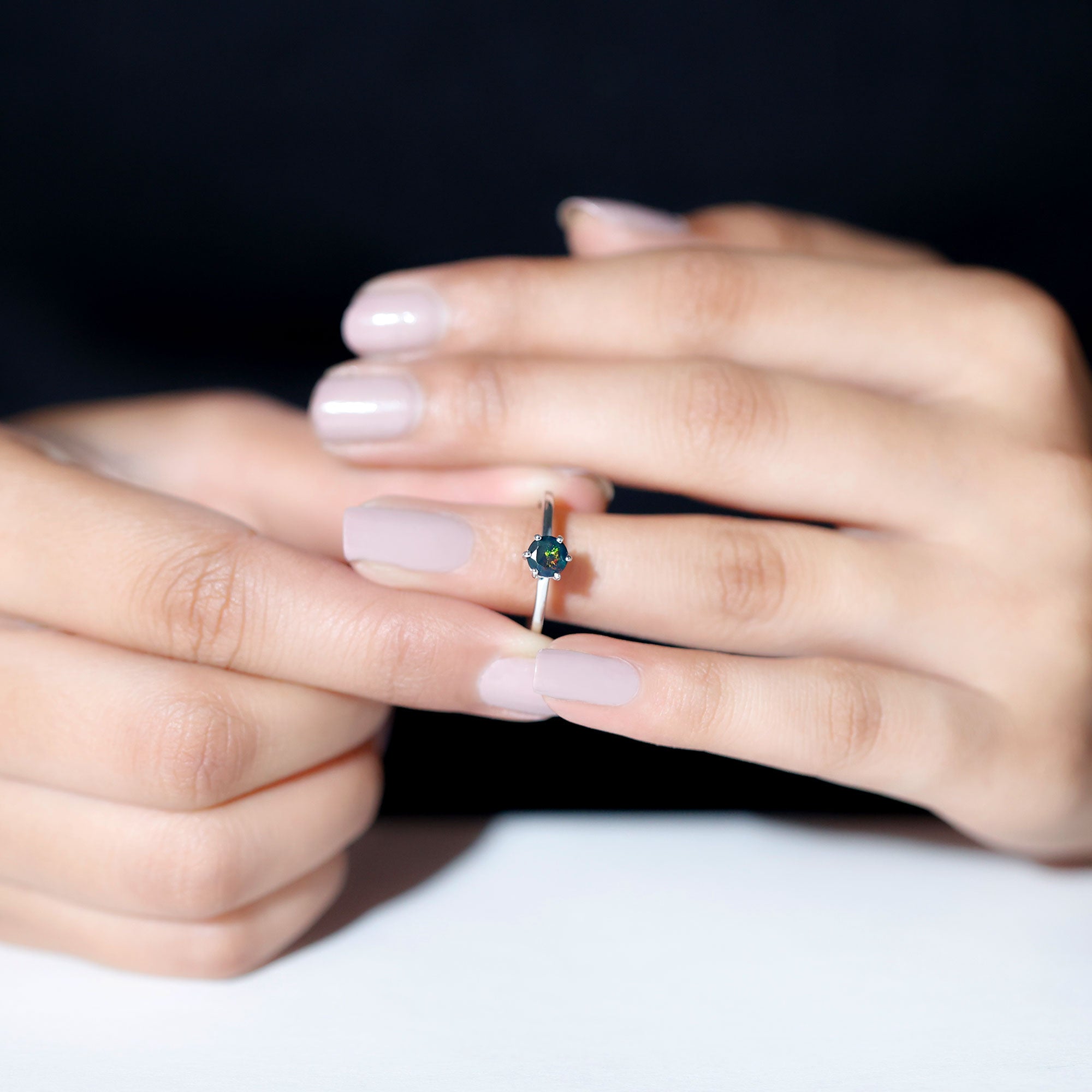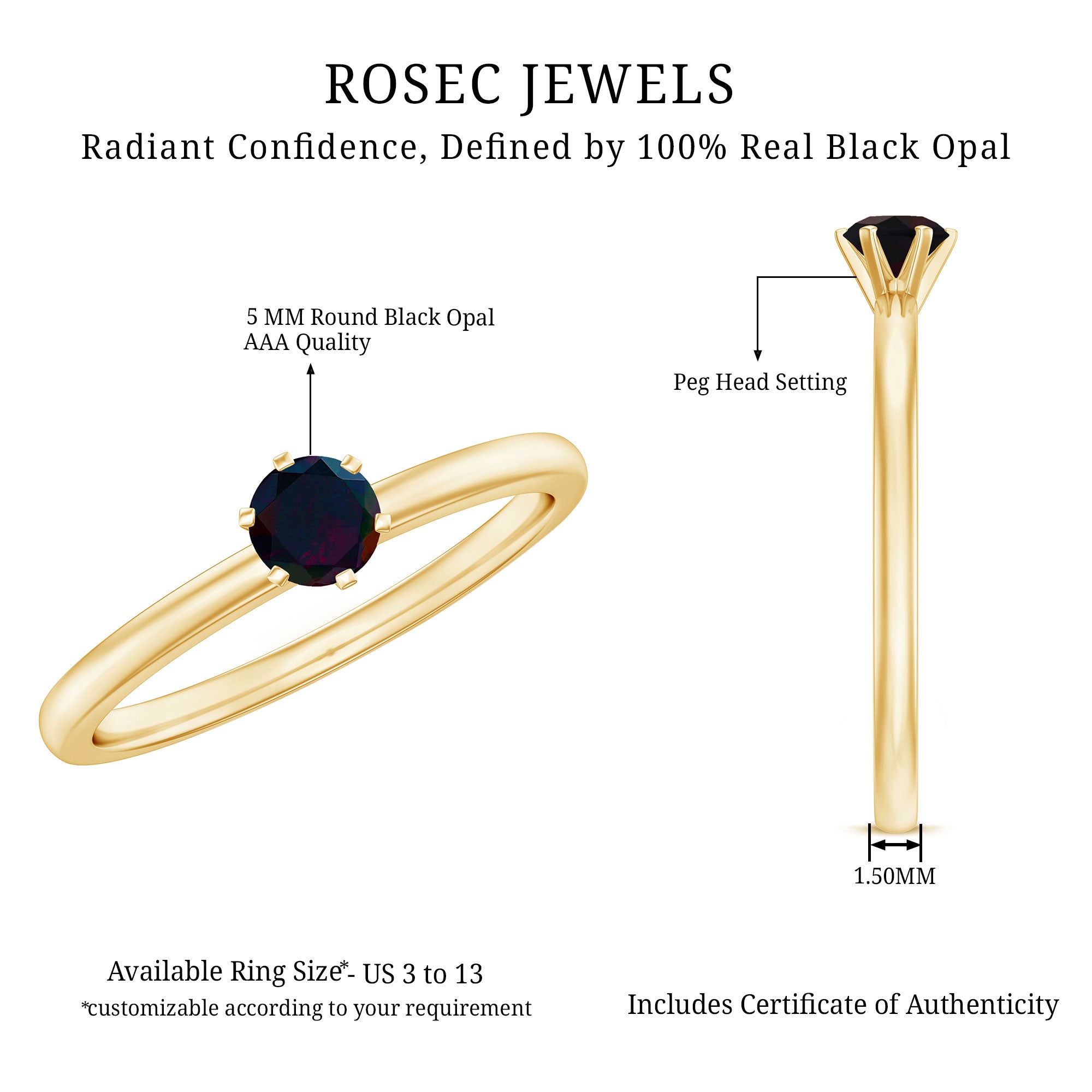 This Black Opal Ring is delicately crafted with a sleek and slender design, making it an ideal everyday accessory. The solitaire ring features a Round Cut Black Opal set in a 6 Prong Peg Head setting, symbolizing a significant promise in any relationship. This charming and minimalist Black Opal Promise Ring is a perfect choice to express your commitment to your significant other when youre ready to take your relationship to the next level.