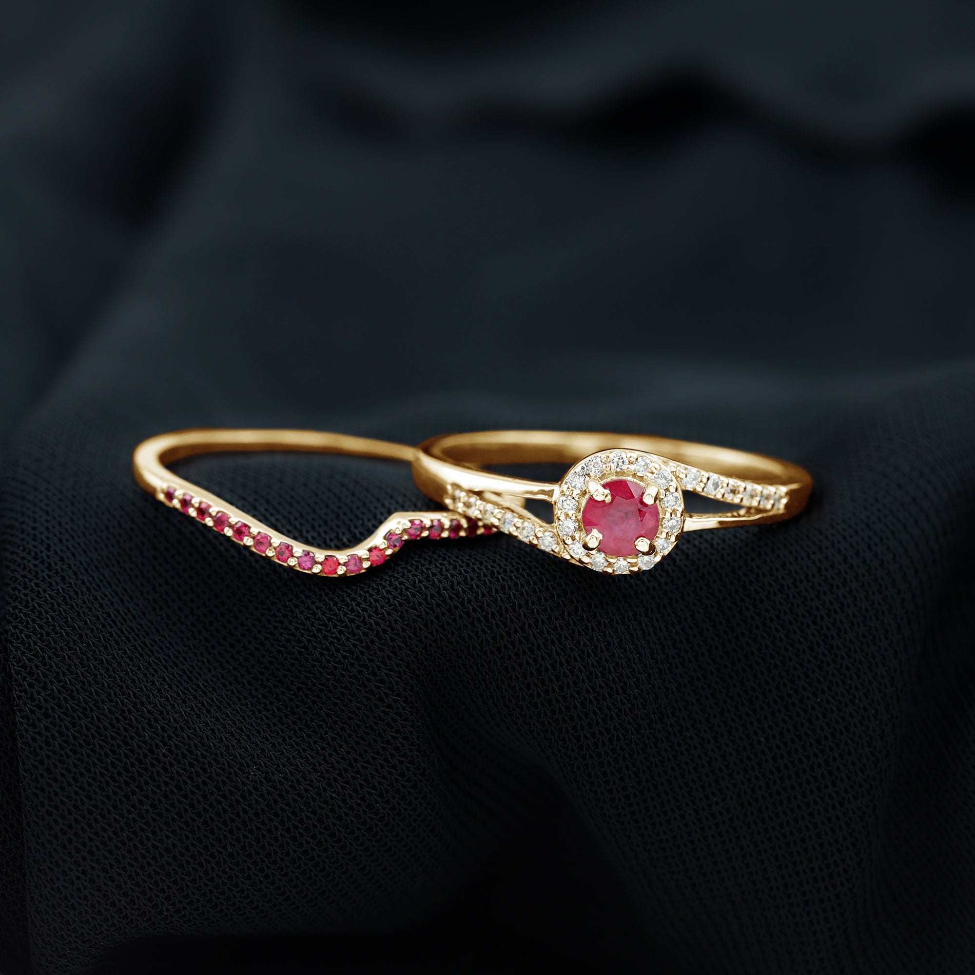 Minimal Bypass Wedding Ring Set with Ruby and Diamond