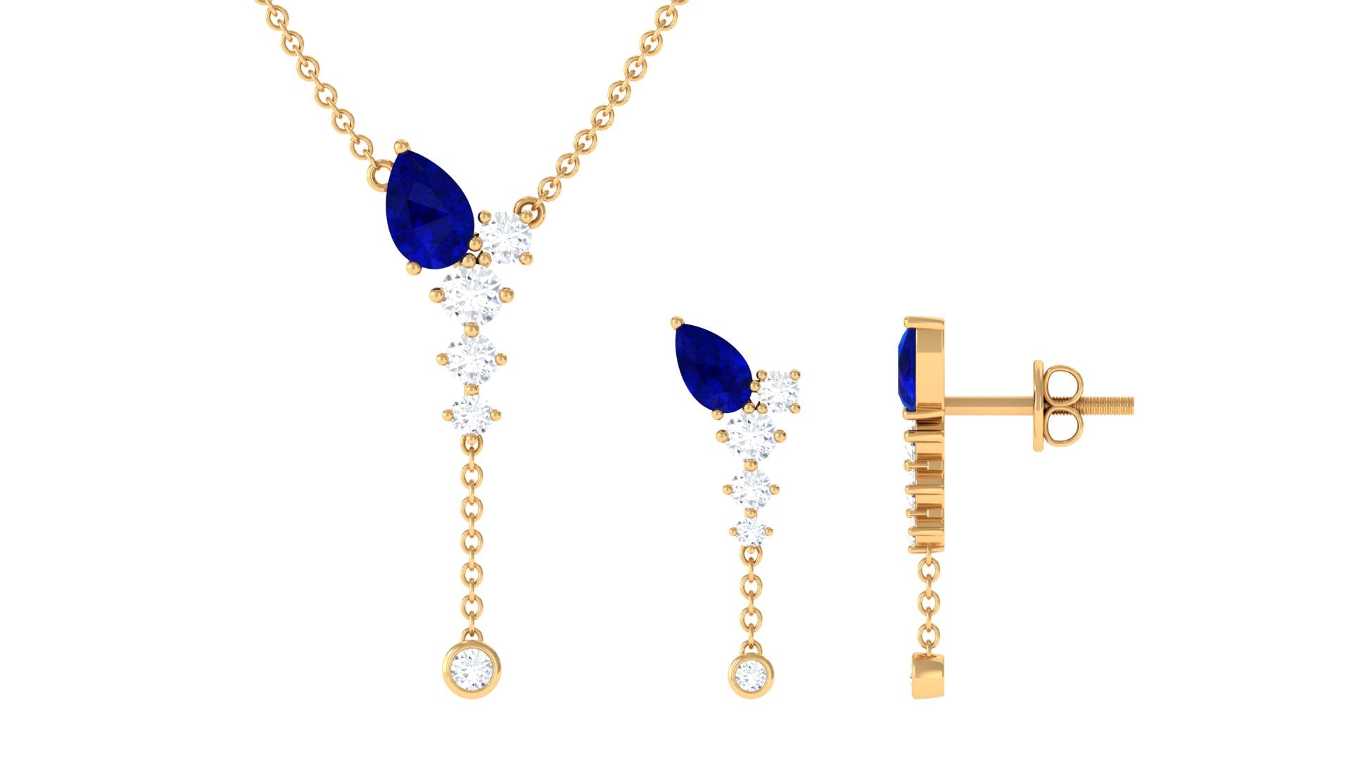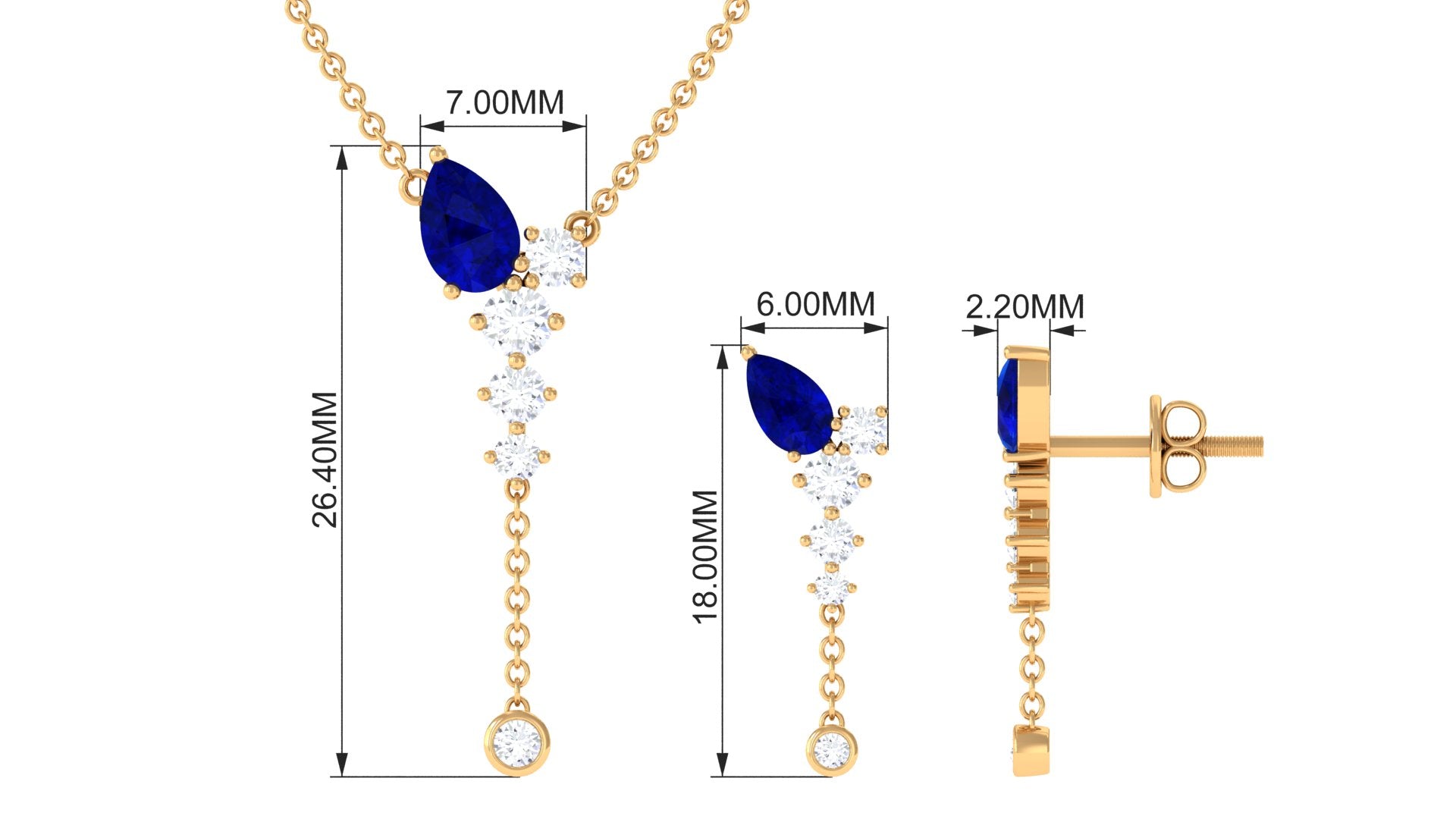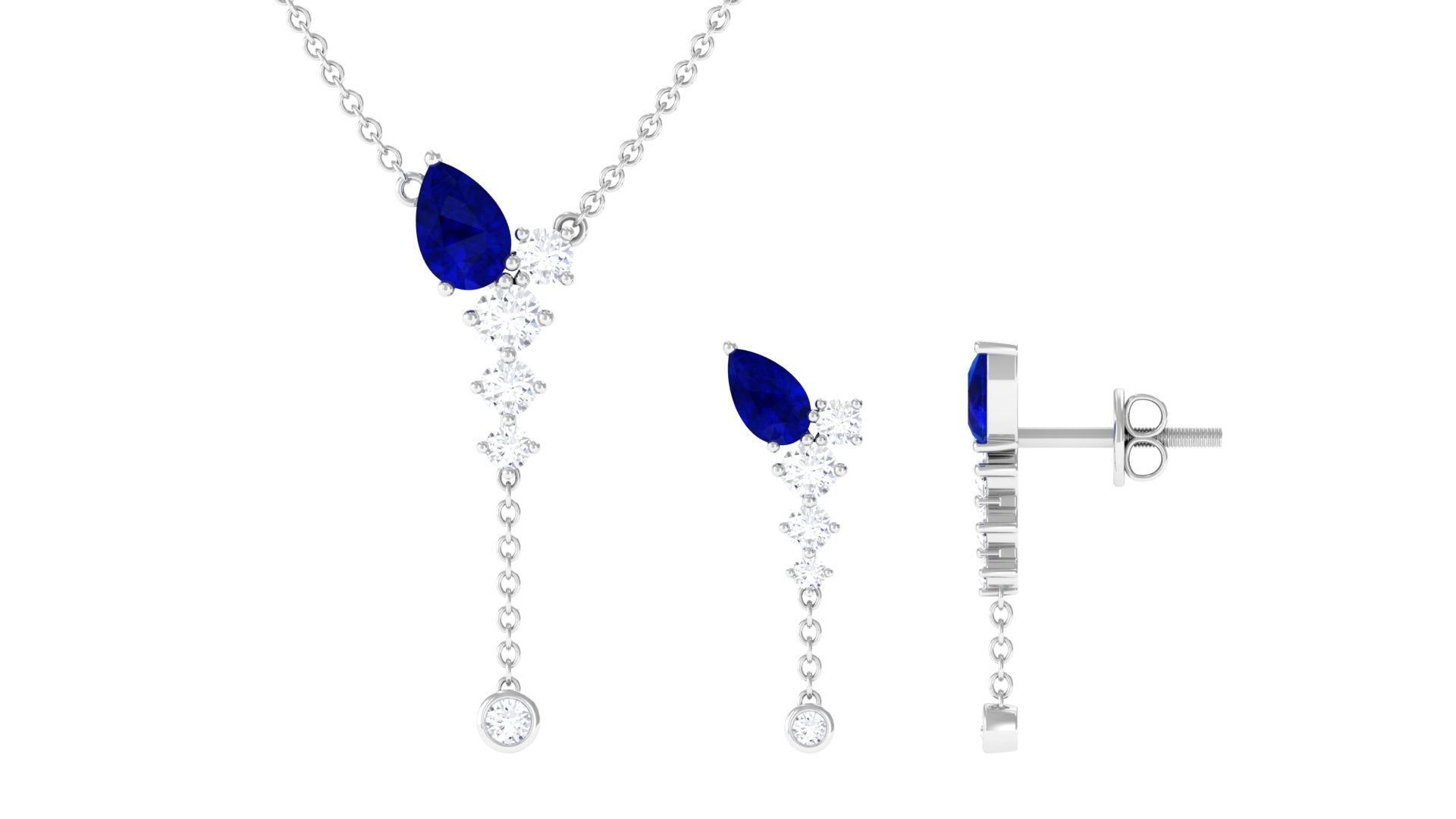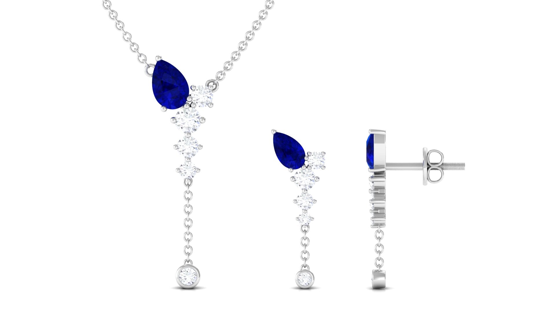 If youre seeking the ideal minimalist jewelry set to enhance your special event ensemble, search no more. The breathtaking Created Blue Sapphire Jewelry Set is here for you. This set comprises a Y Necklace and Earrings, incorporating a blend of Pear Cut Created Blue Sapphire and Round Shape Diamond stones that will undoubtedly catch everyones attention. The simple yet elegant design of this Dangle Jewelry Set will lend a touch of refinement to any attire.