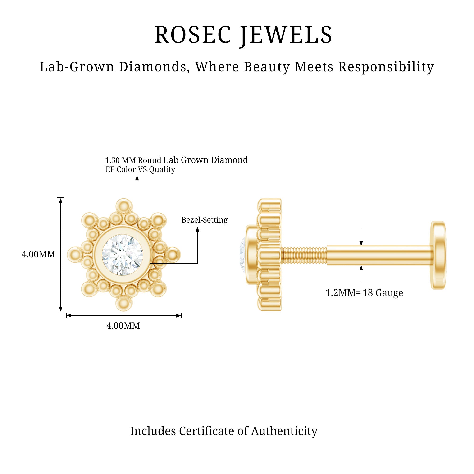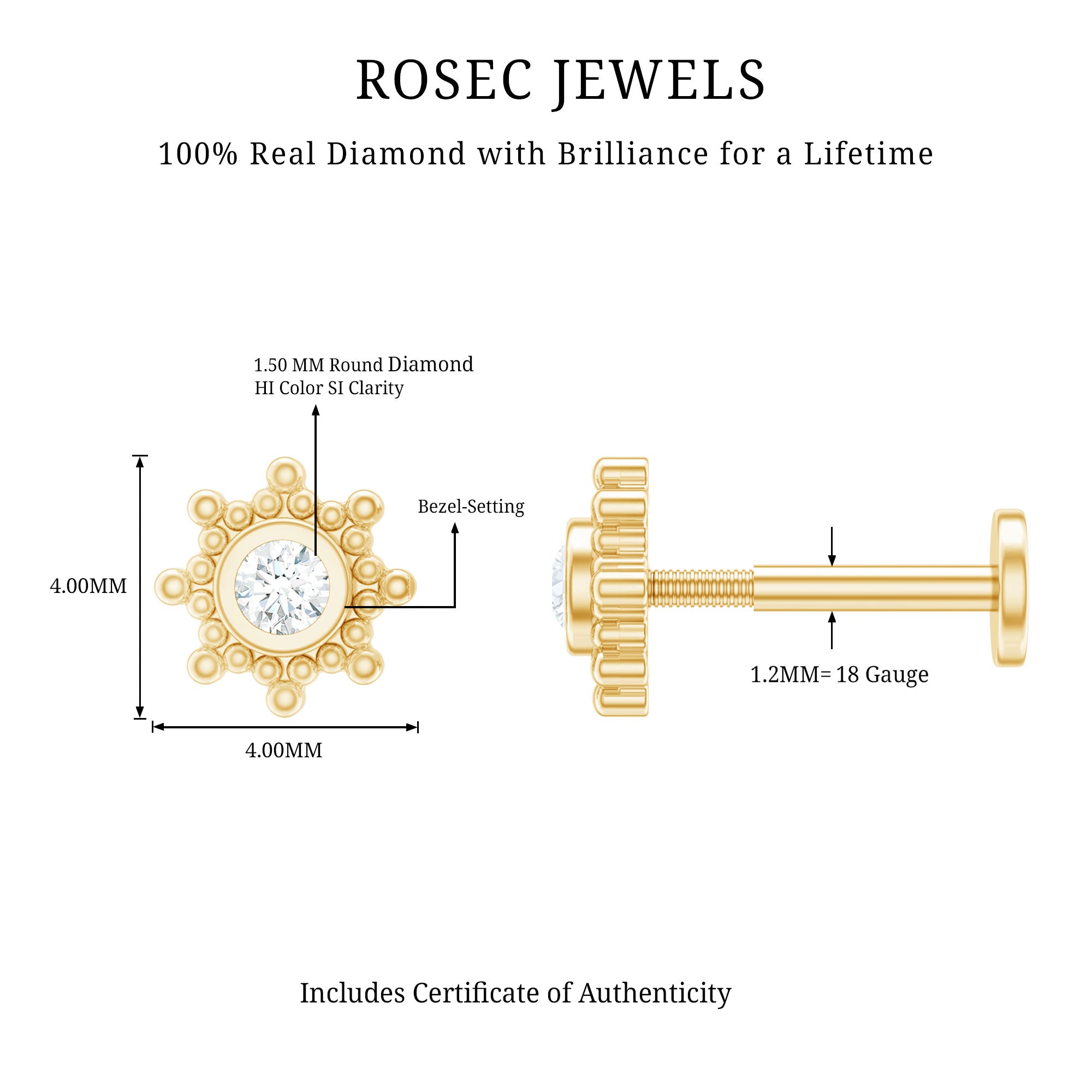 Style this Diamond Beaded Conch Earring with your favorite outfits, as it is embellished with Round Cut Diamond secured in Bezel Setting with Beaded Detailing. Wear this Dainty Earring on your Helix, Cartilage, Tragus, or Upper Lobe Piercing. This Cartilage Earring beholds the shine of HI-SI Quality Diamond which will add sparkles to the personality of the wearer. Grab this Minimal Earring for your loved ones and wait for her priceless reaction. This Diamond Stud Earring will be delivered to you in quality packaging.