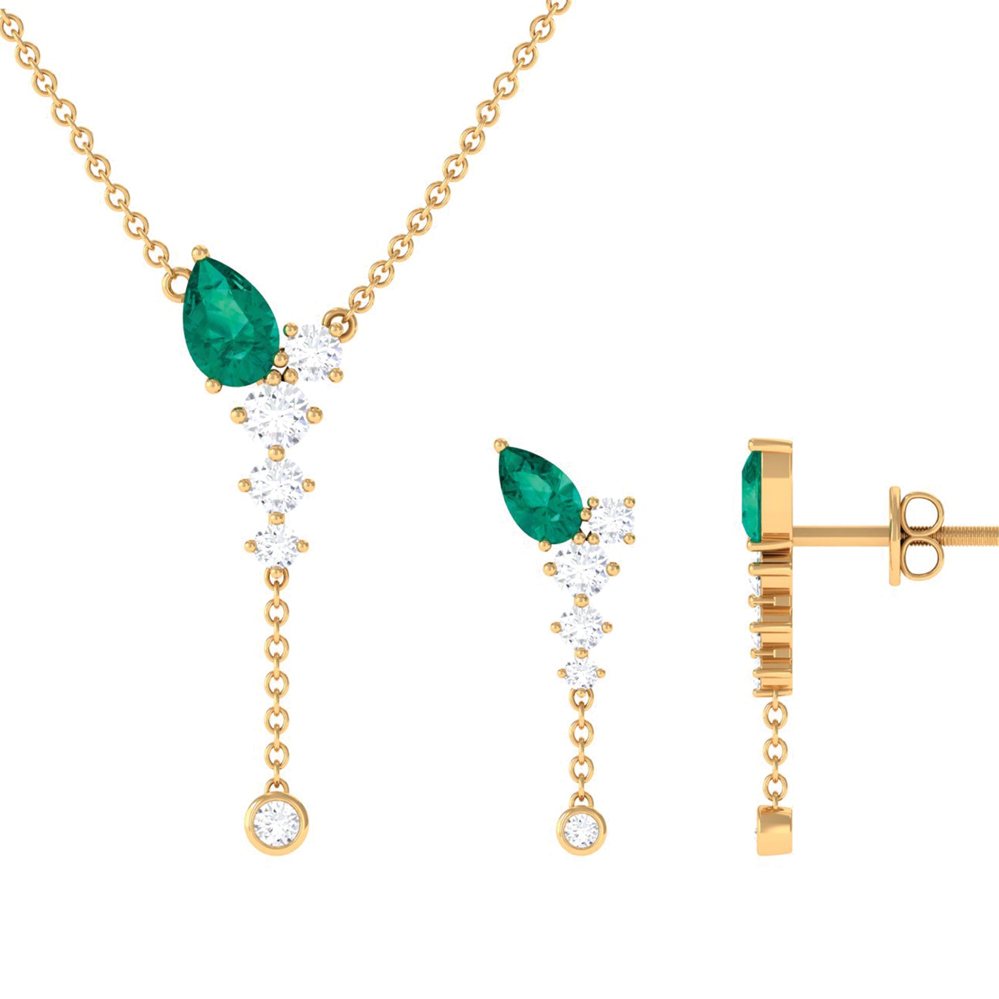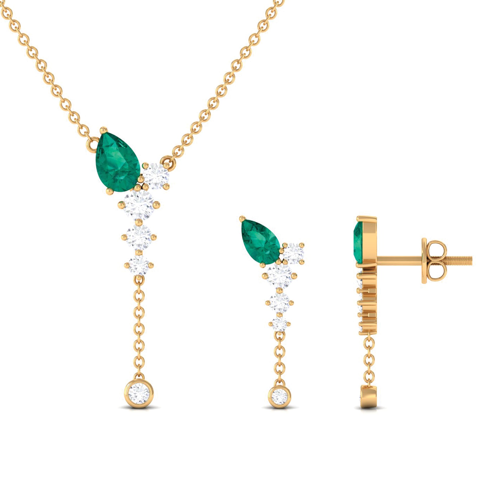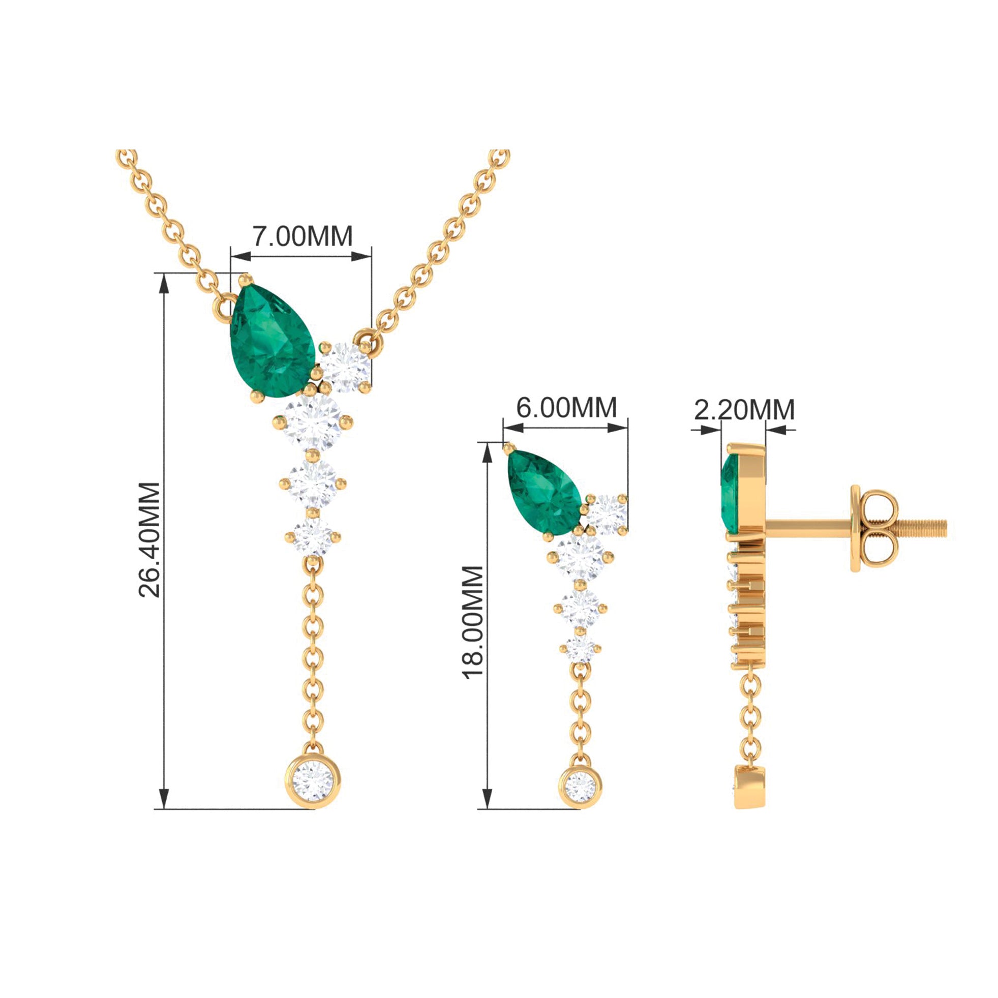 Looking for the perfect minimal jewelry set to elevate your special occasion look? Look no further than this stunning Emerald Jewelry Set. Featuring a combination of Pear cut Emerald and Round Shape Diamond stones, this Y Necklace and Earrings Set is sure to turn heads. The minimalist design of this Dangle Jewelry Set adds a touch of sophistication to any outfit. With a total weight of 1.75 Carat and AAA quality certification, you can trust that all of the gemstones in this set have undergone rigorous quality checks to ensure their beauty and durability.