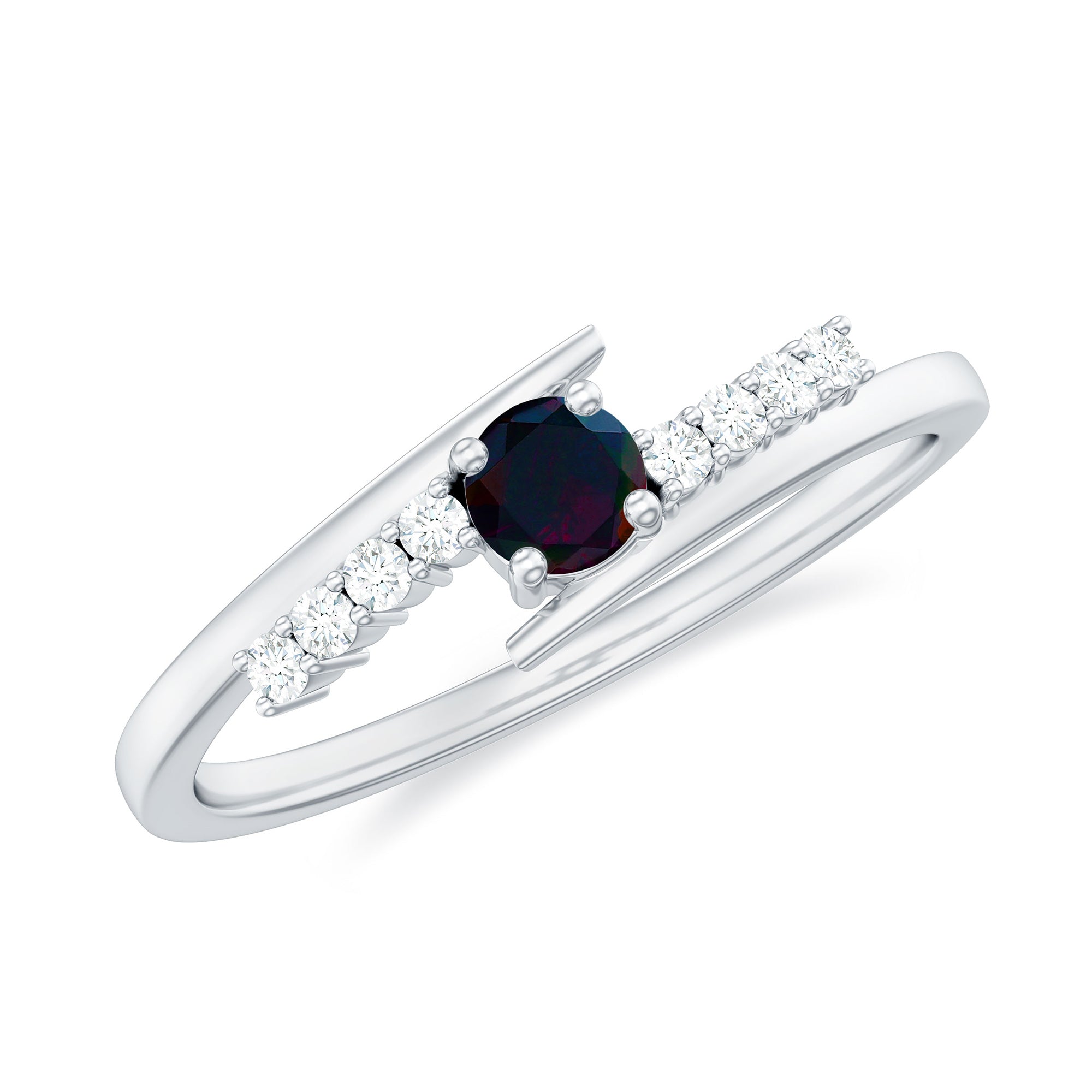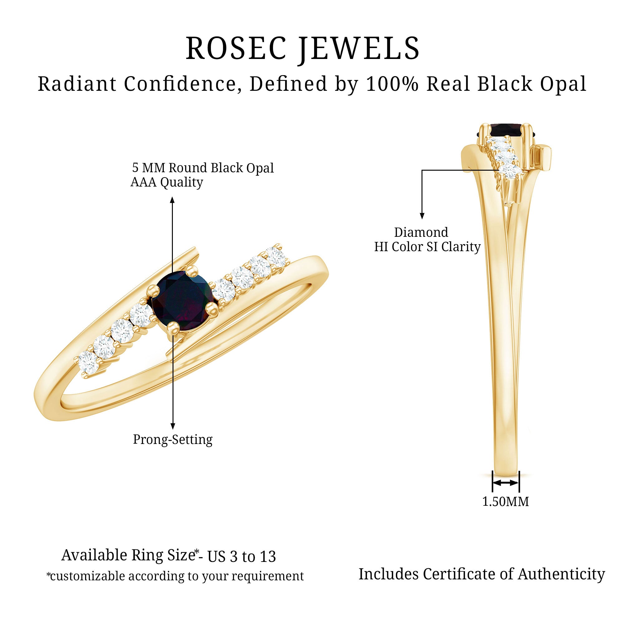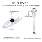 Elevate the glamour of your look with this beautiful Minimal Bypass Ring, featuring a Round Shape Black Opal gemstone set as a center stone in a Prong Setting. The promise ring is further adorned with Diamond accents on the Bypass Shank. This Minimal Black Opal Ring is the perfect addition to any outfit. Make a lasting impression with this stunning piece.