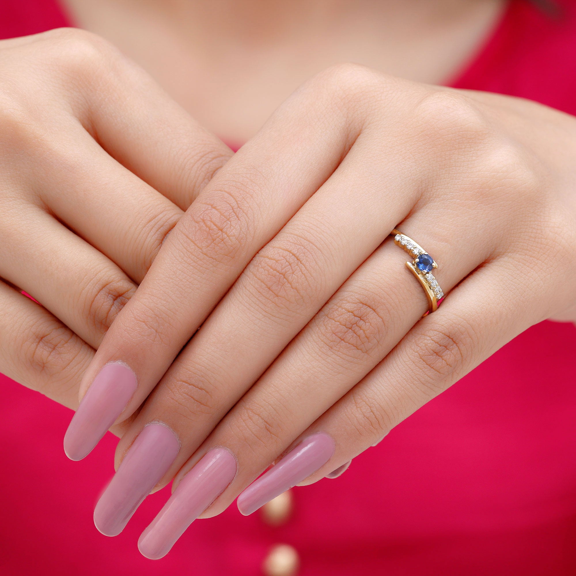 Indulge in timeless elegance with this stunning Minimal Bypass Ring. Featuring a Round Shape Blue Sapphire as the center gem and accented with sparkling Diamond stones. Its the perfect addition to any jewelry collection.