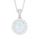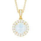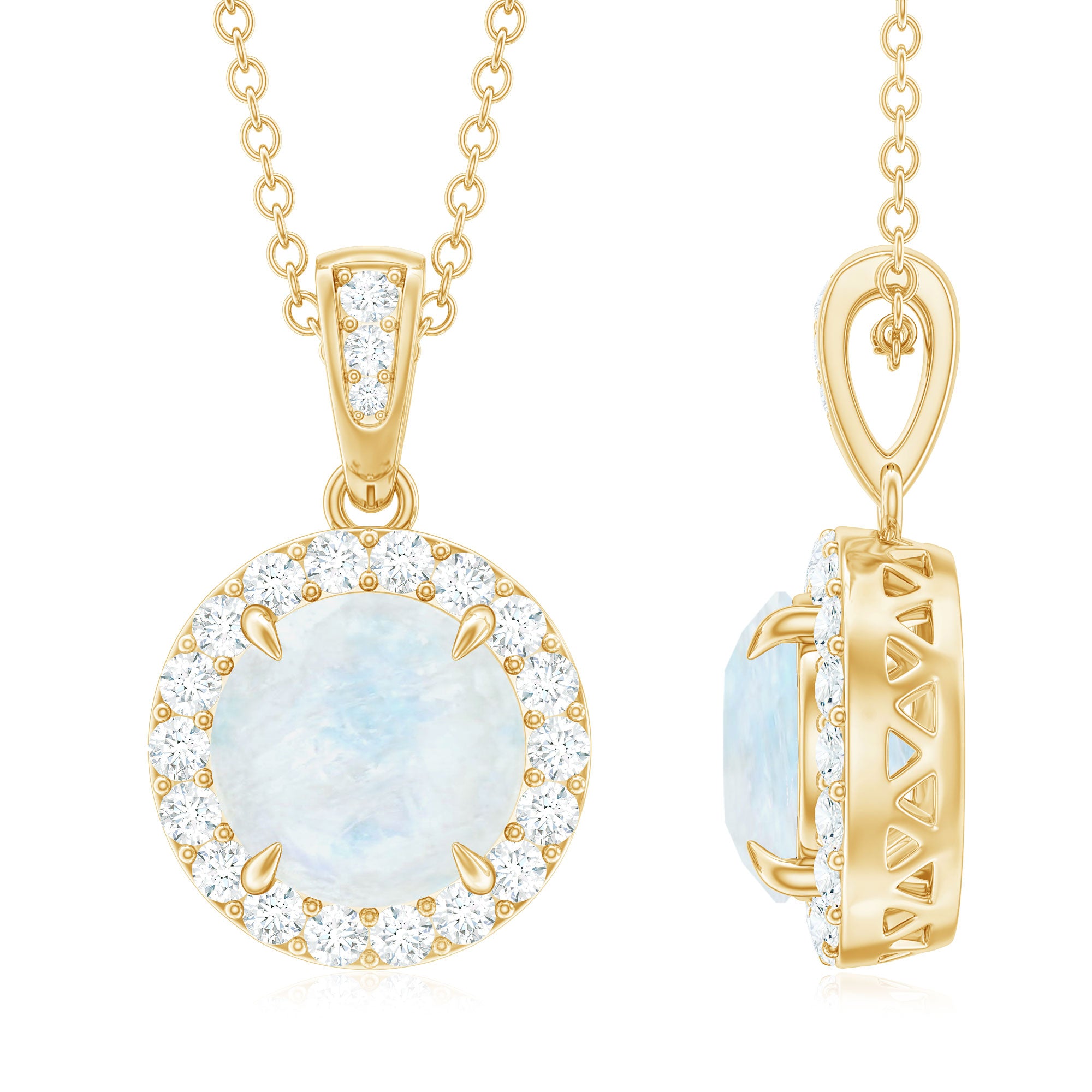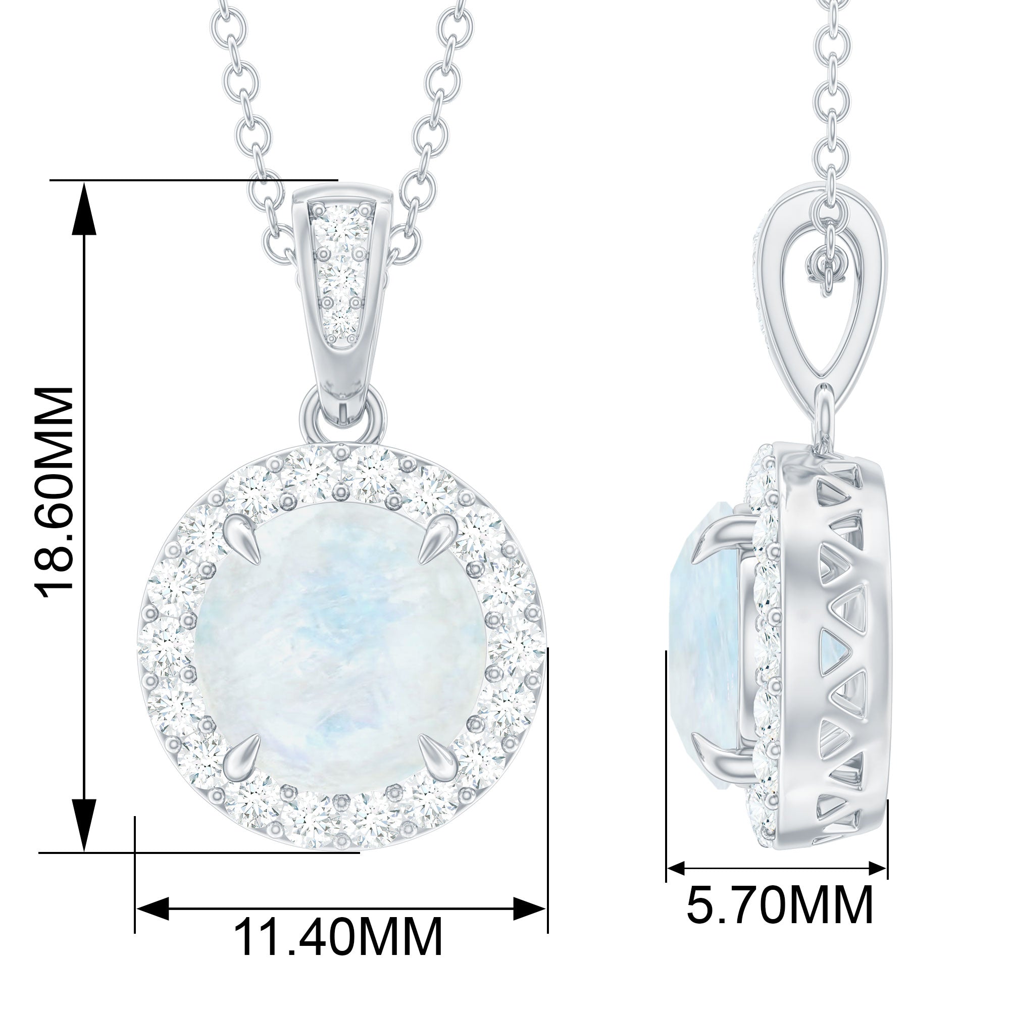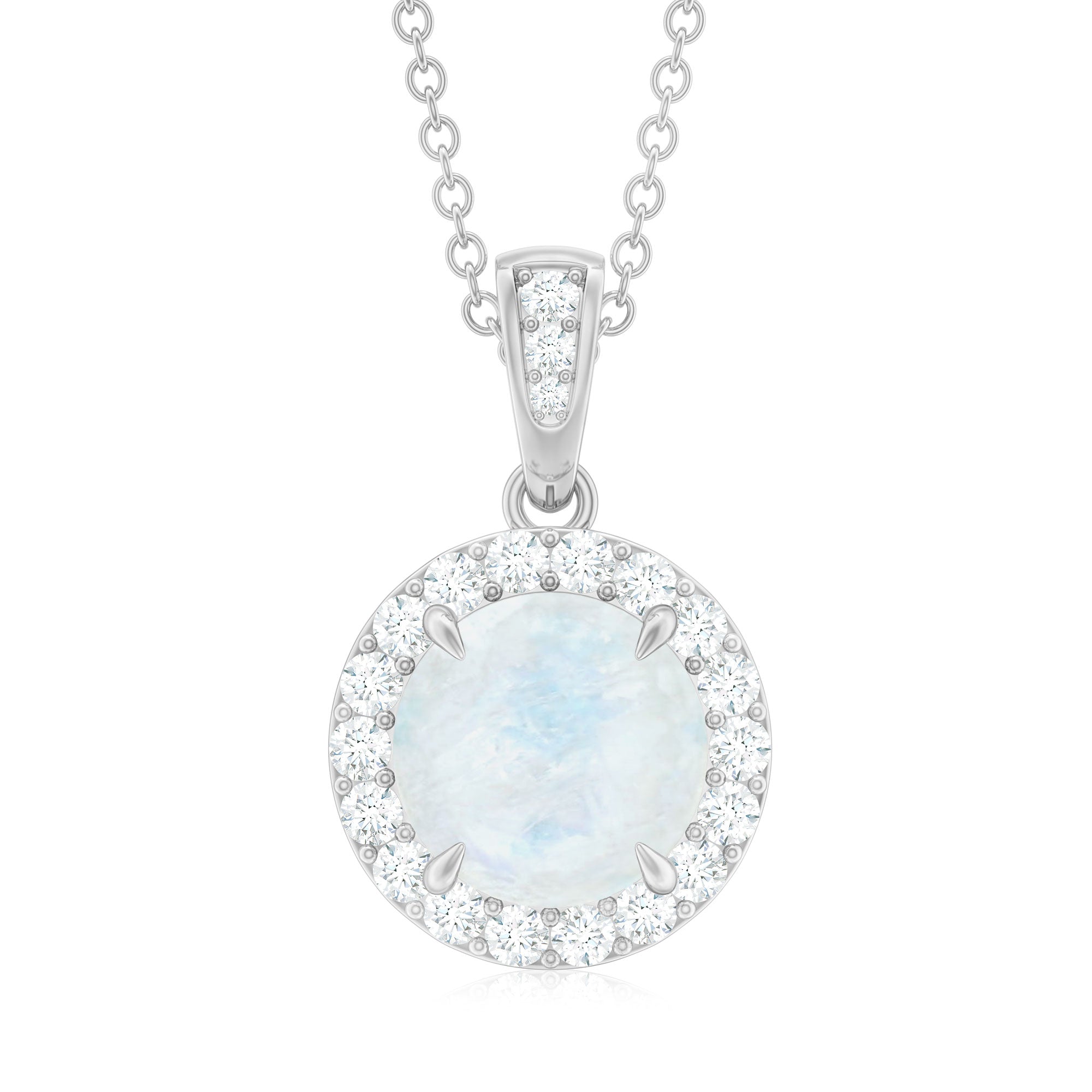 A claw setting holds a round moonstone in the center of this solitaire halo pendant. It is enveloped by a parade of round Diamond, that makes the centerpiece look bigger and sparkier than it actually is. A Diamond studded bale completes the exquisiteness of this pendant design. If you fancy unique pieces that help you survive many different occasions, this stunner is what you seek.